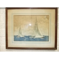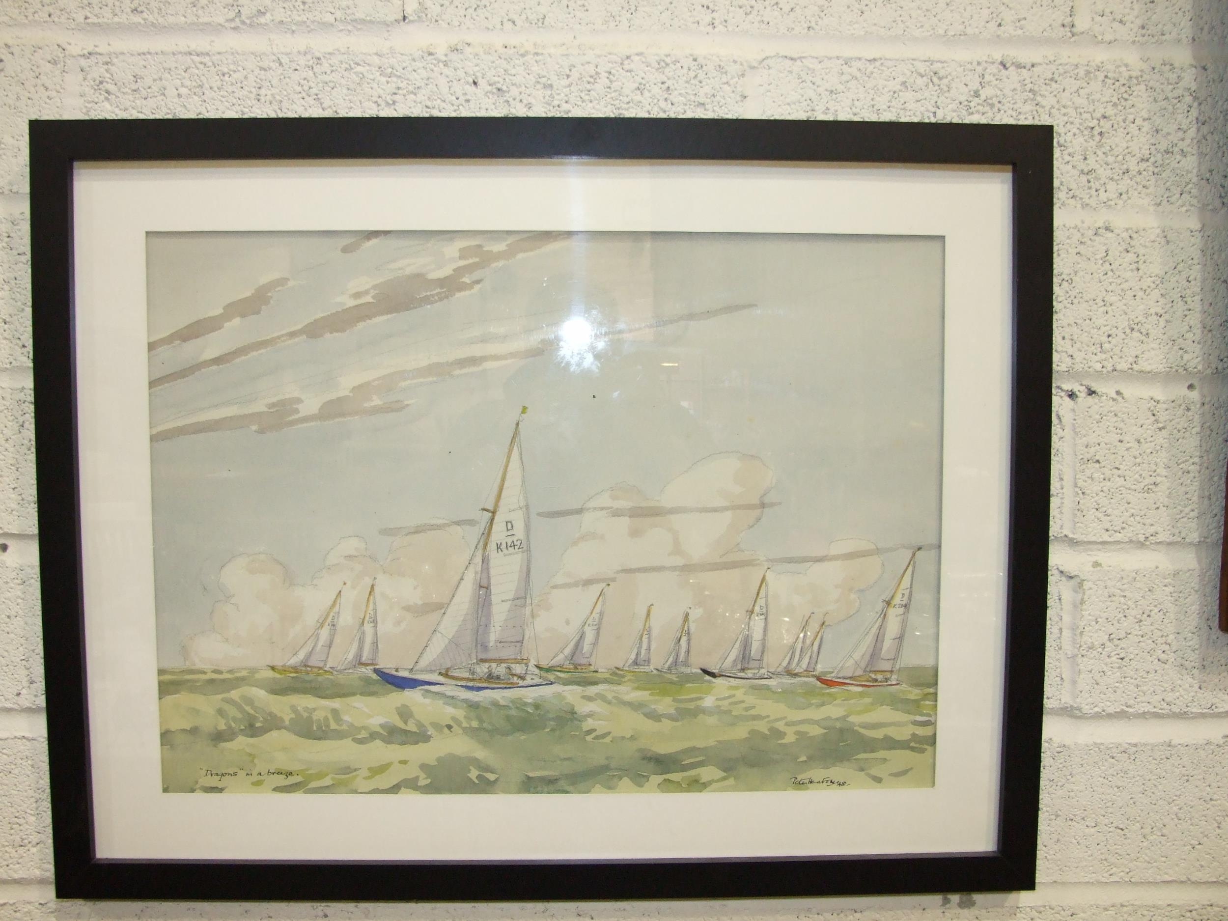 Peter Heaton, "Dragons in a Breeze", a yacht race watercolour, signed and titled, 36 x 51cm and another "Six Metres, Racing", signed, and also signed and titled on mount, 35 x 48cm, (browned), together with a large Continental coloured print "Seascape", 65 x 96cm, (3).