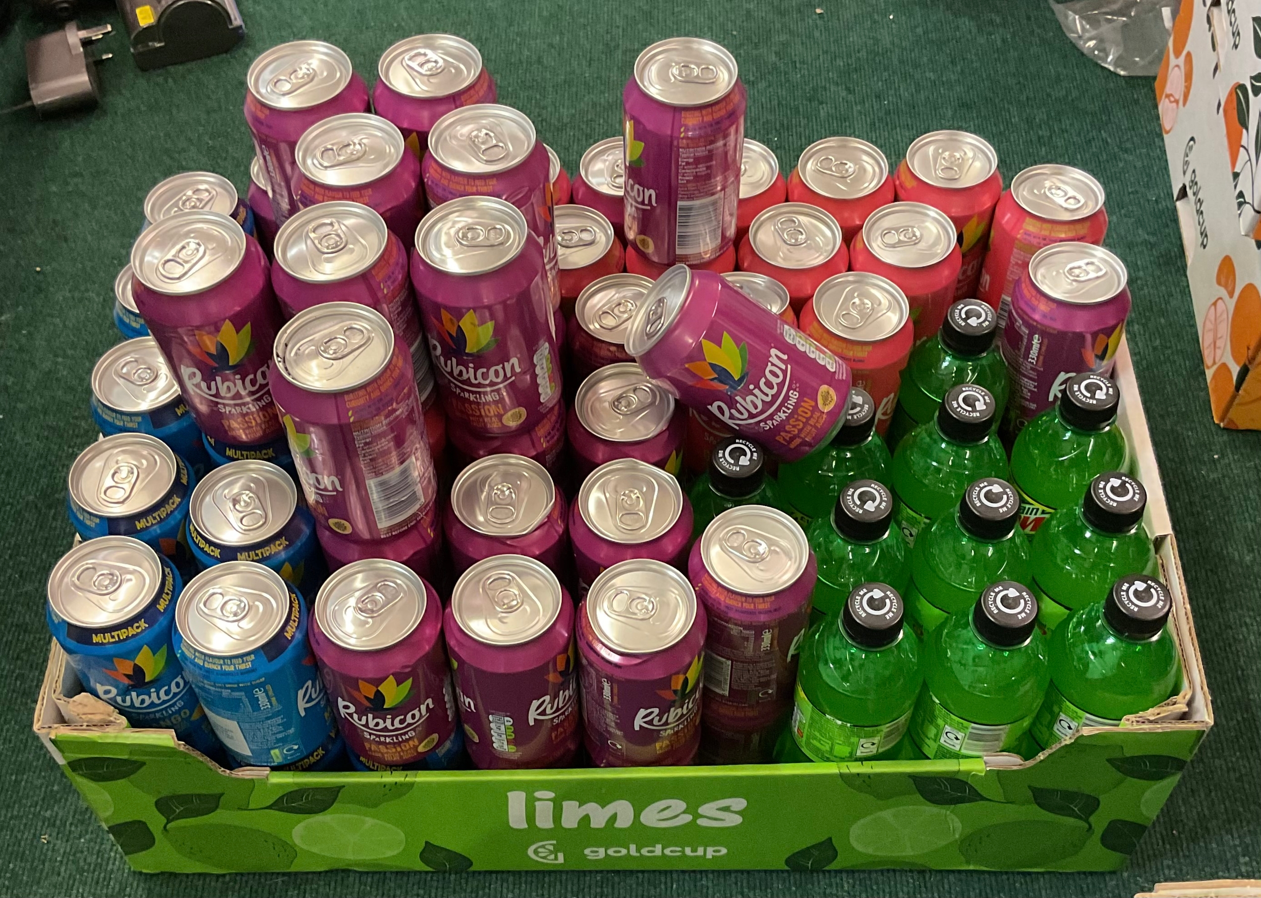 BOX OF MIXED DRINKS INCLUDING VARIOUS FLAVOUR RUBICON AND MOUNTAIN DEW