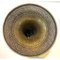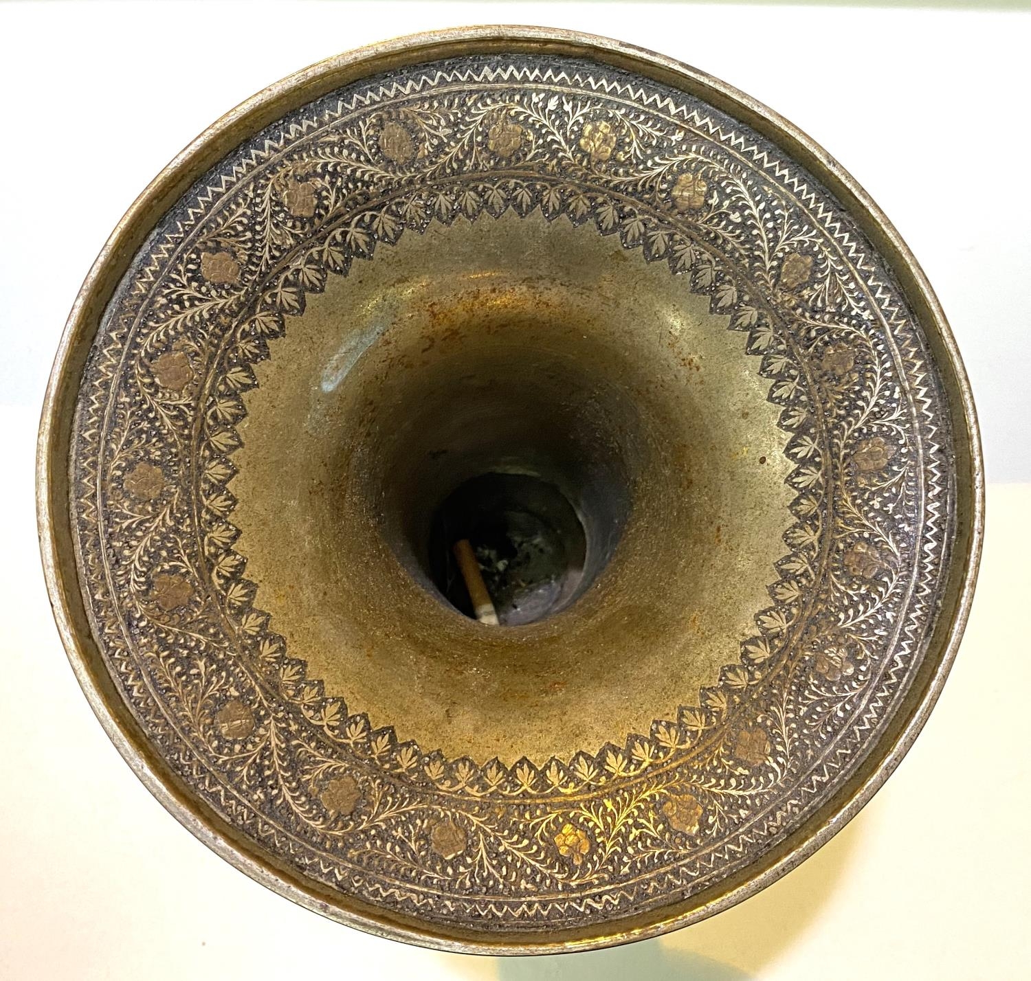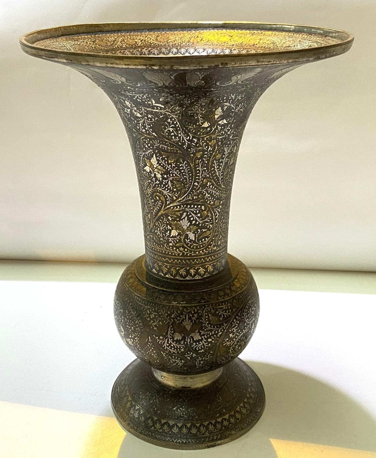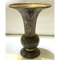 An Indian bronze vase with silver/gilt highlights, flared rim, bulbous body and wide foot