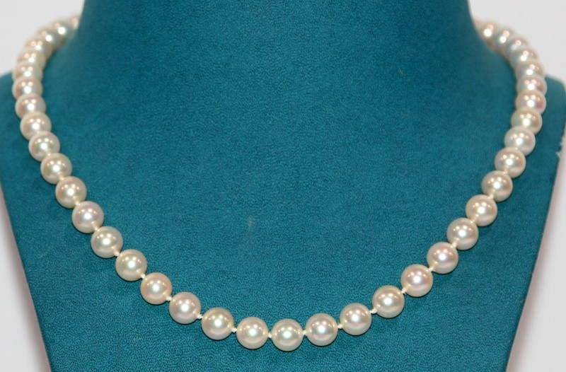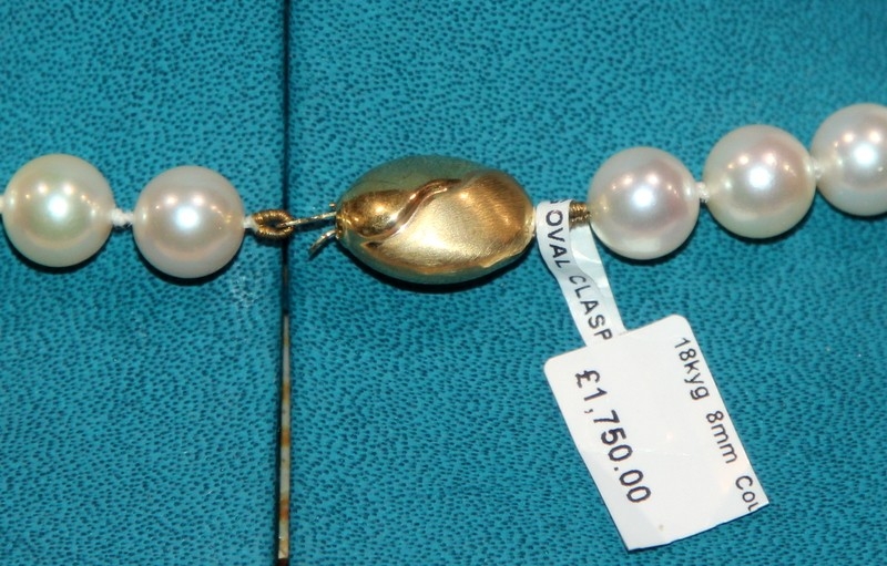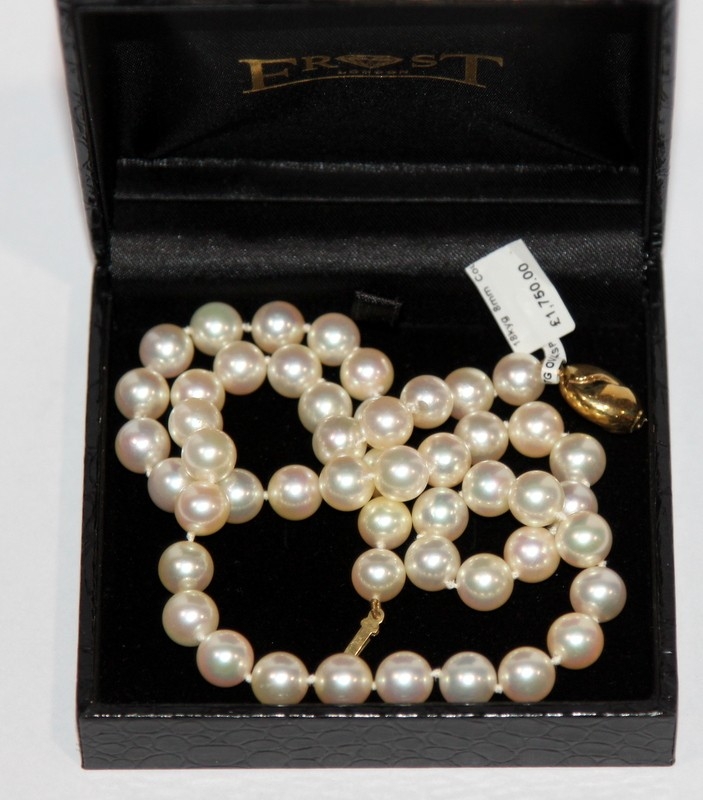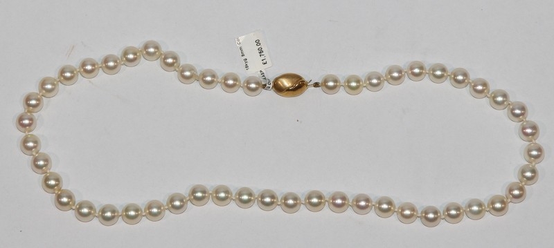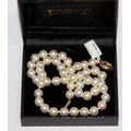Necklace of cultured pearls, 51 8mm pearls fastened by a 9ct gold clasp. 18" length. Brand new and directly from a retail environment. RRP £1750