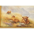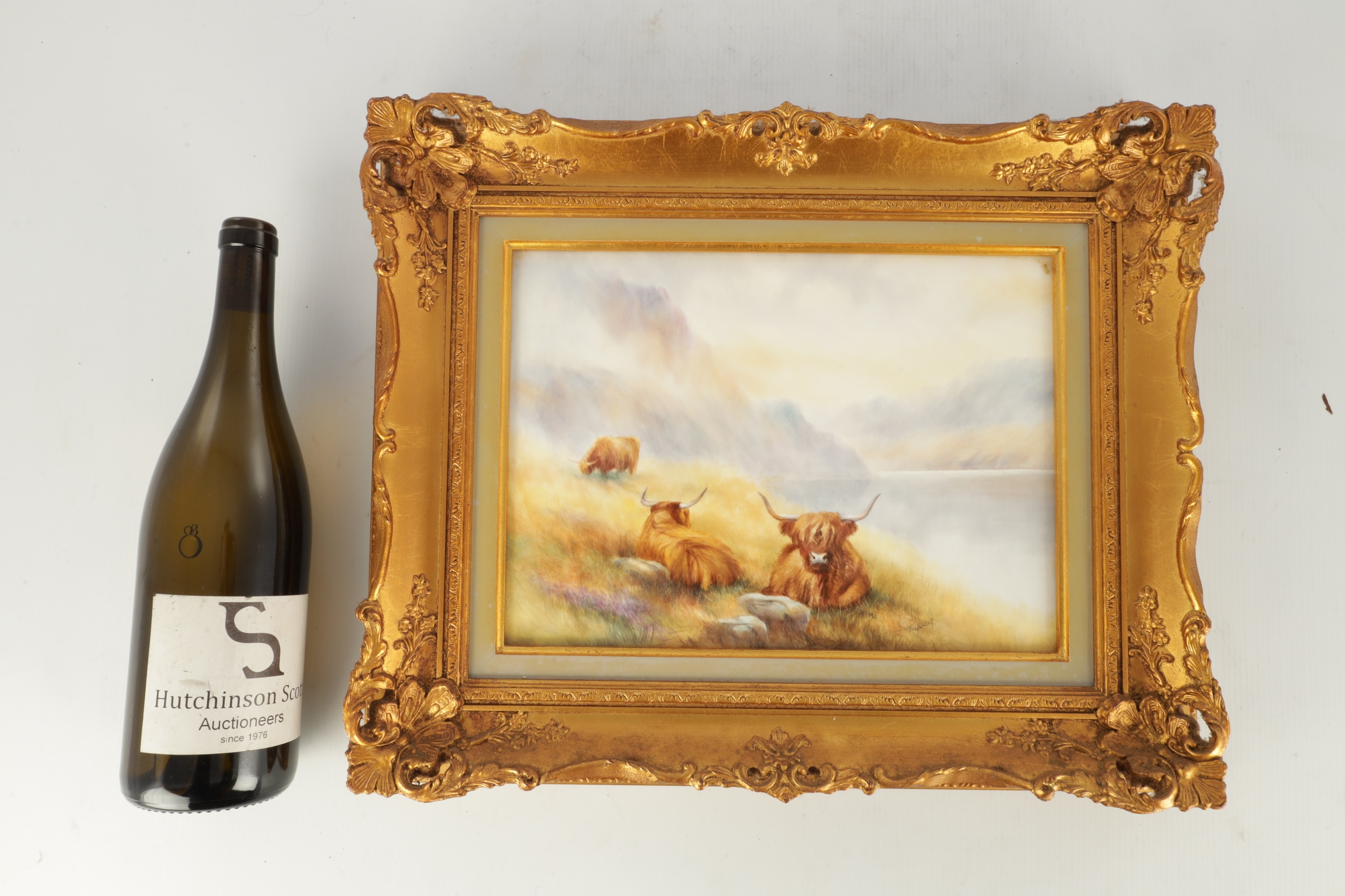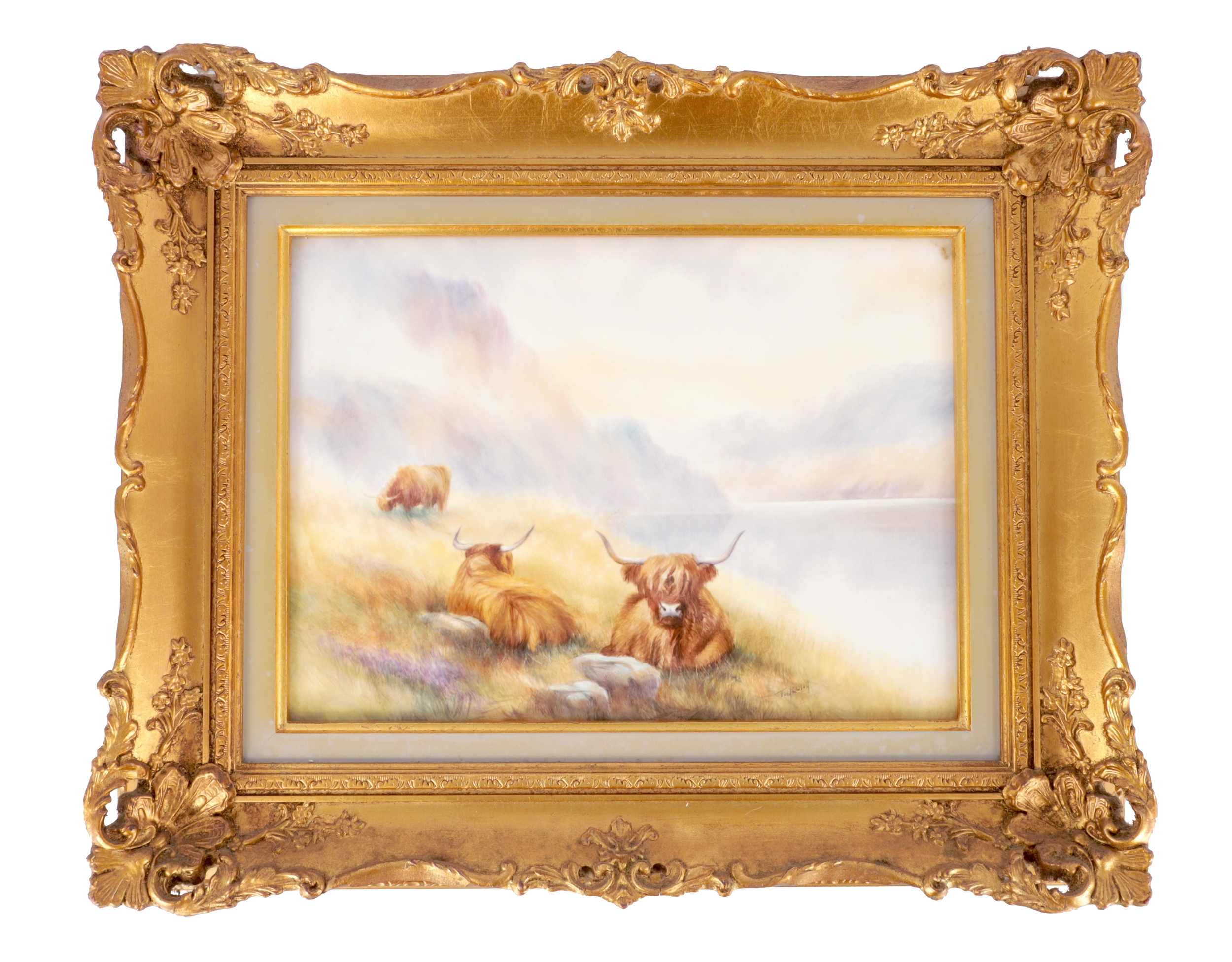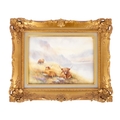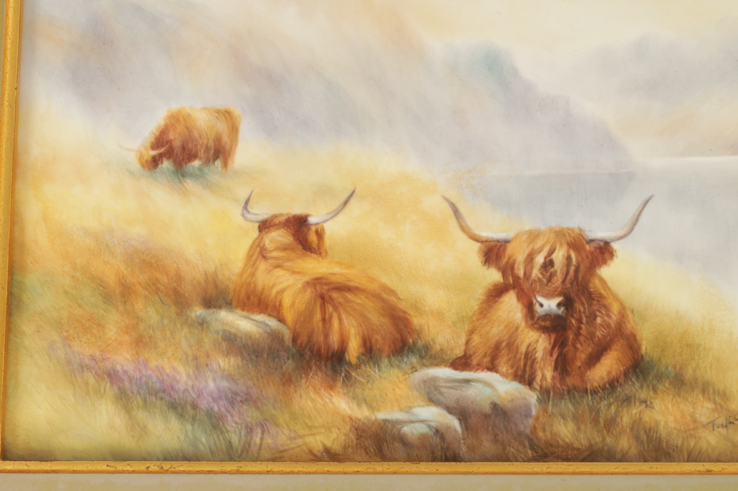 A MODERN BRONTE PORCELAIN RECTANGULAR CERAMIC PLAQUE depicting highland cattle in a mountainous landscape signed T.Young, mounted in a gilt frame with circular cut-out on verso and stamped GV, with tags in original box and sleeve (22cm high 30cm wide)