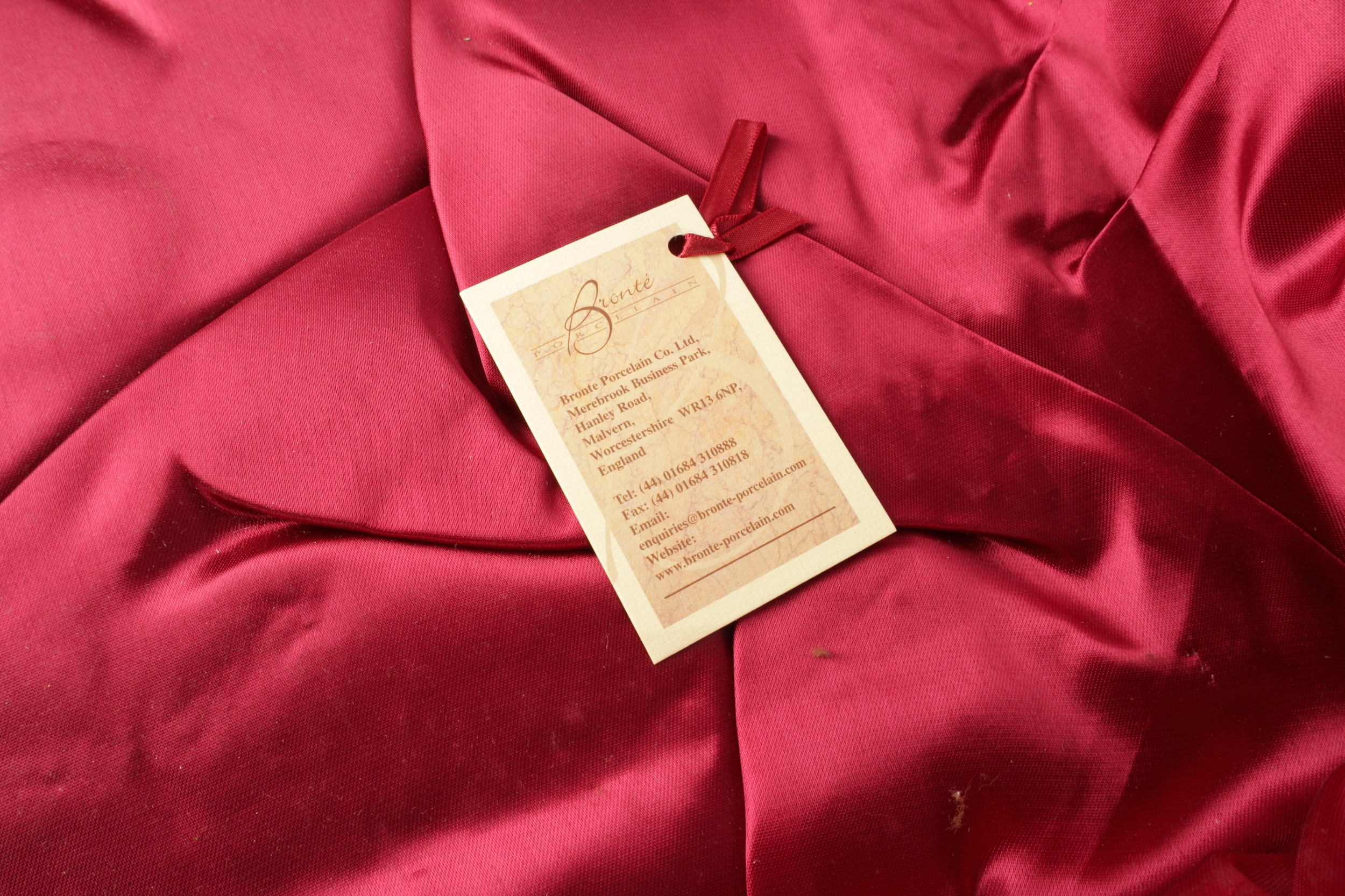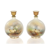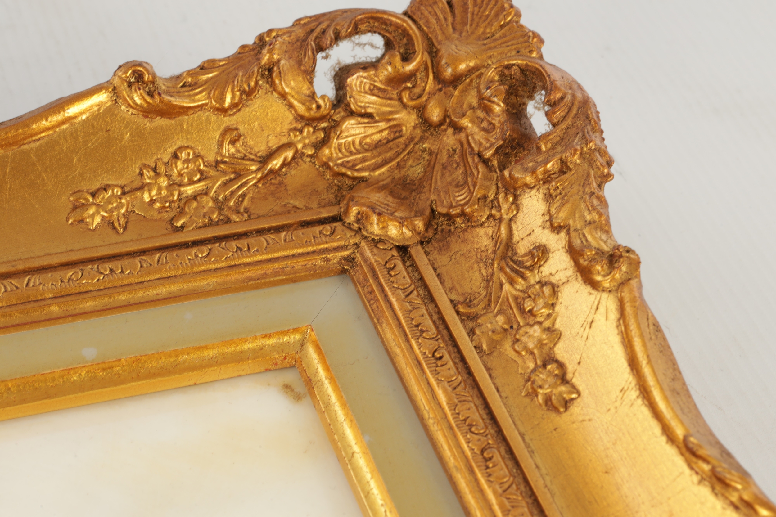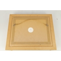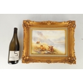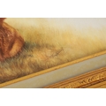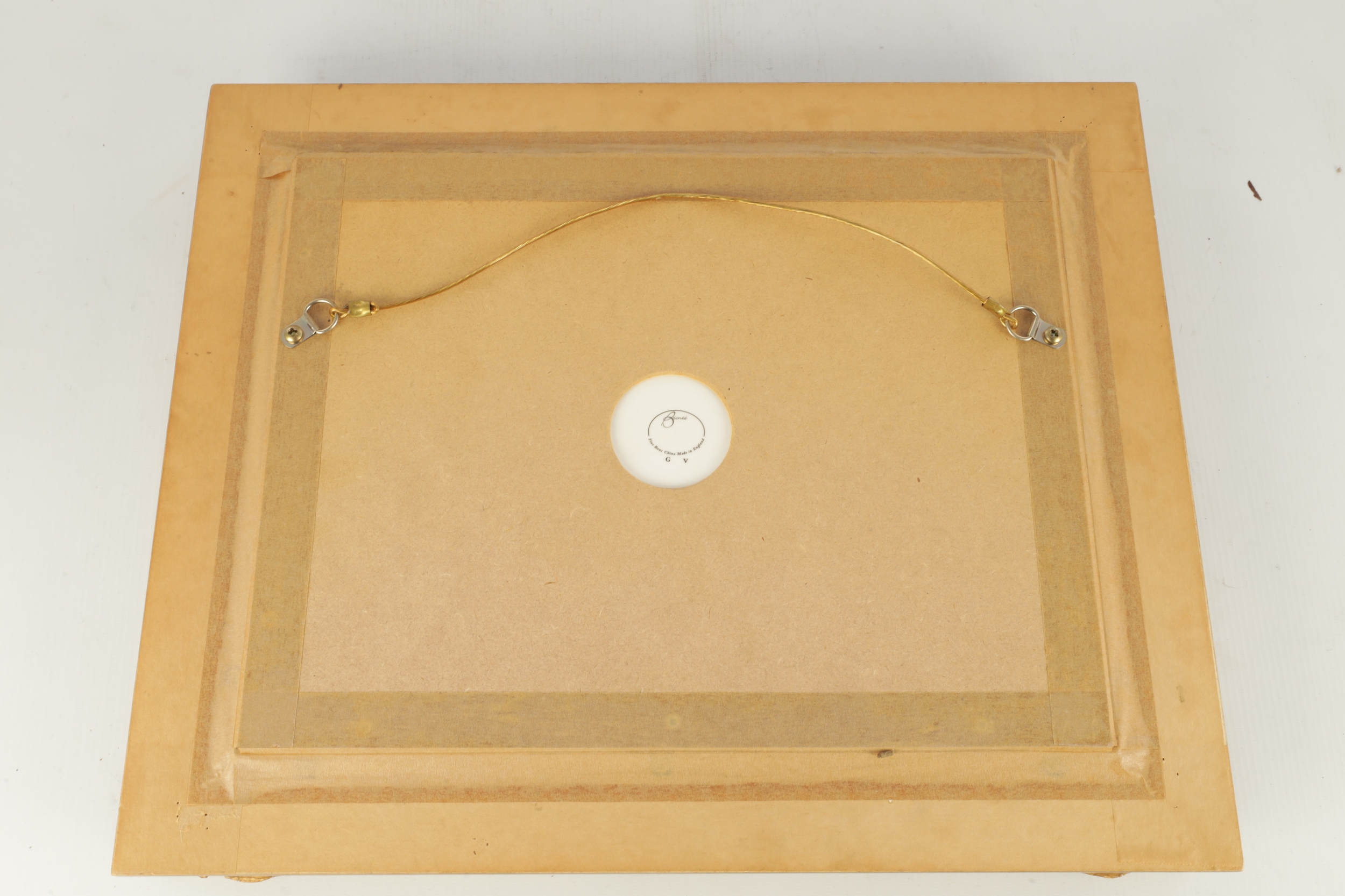 A MODERN BRONTE PORCELAIN RECTANGULAR CERAMIC PLAQUE depicting highland cattle in a mountainous landscape signed T.Young, mounted in a gilt frame with circular cut-out on verso and stamped GV, with tags in original box and sleeve (22cm high 30cm wide)