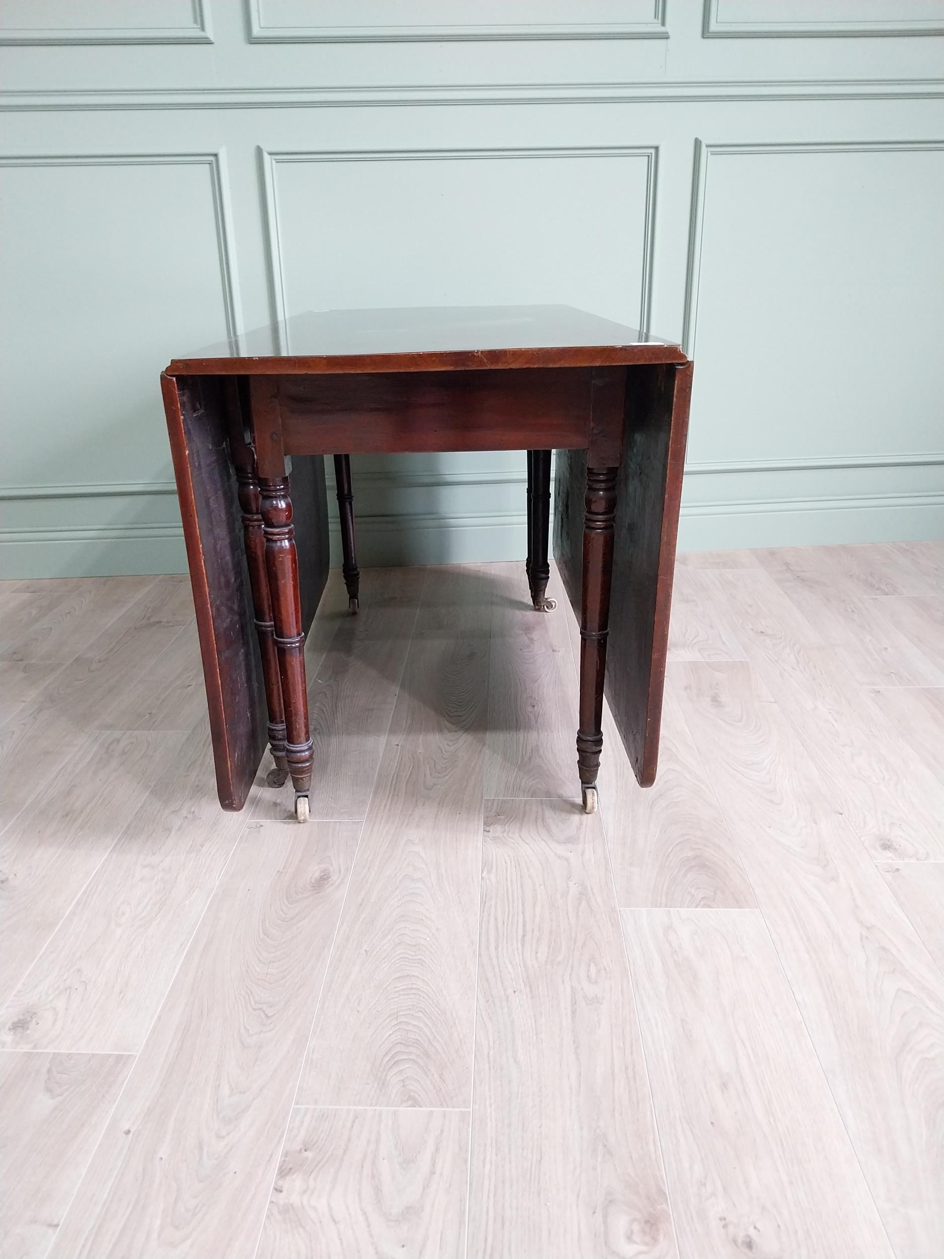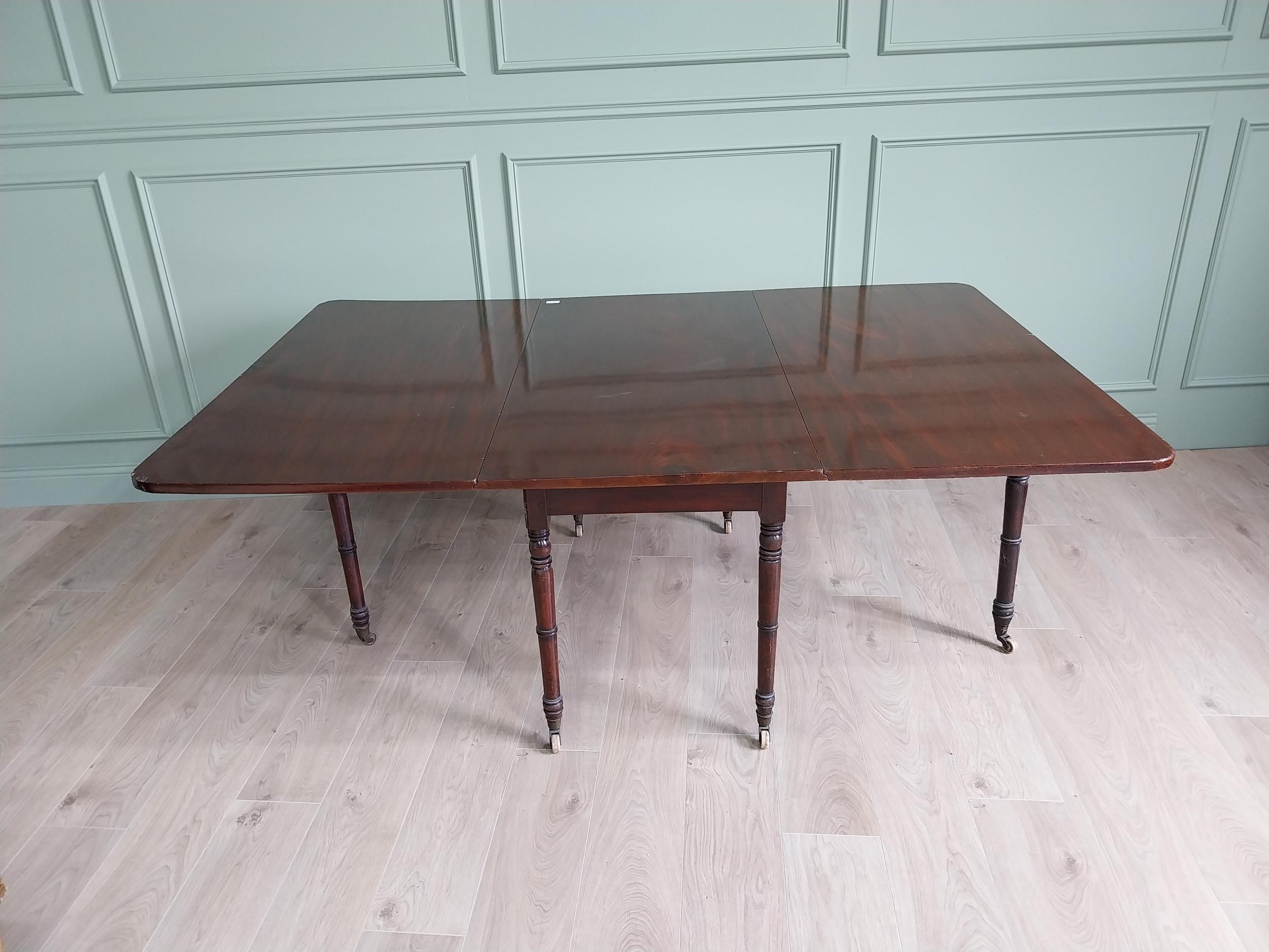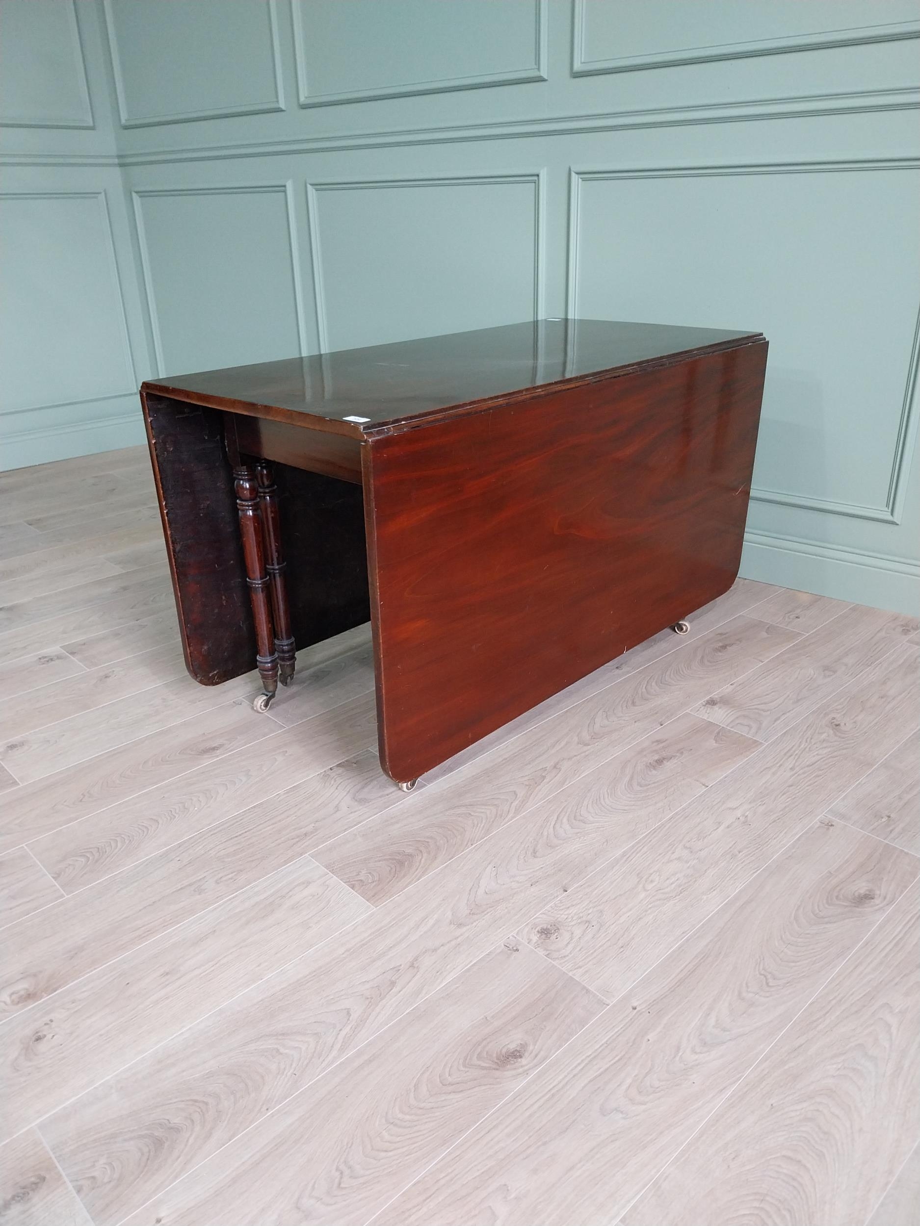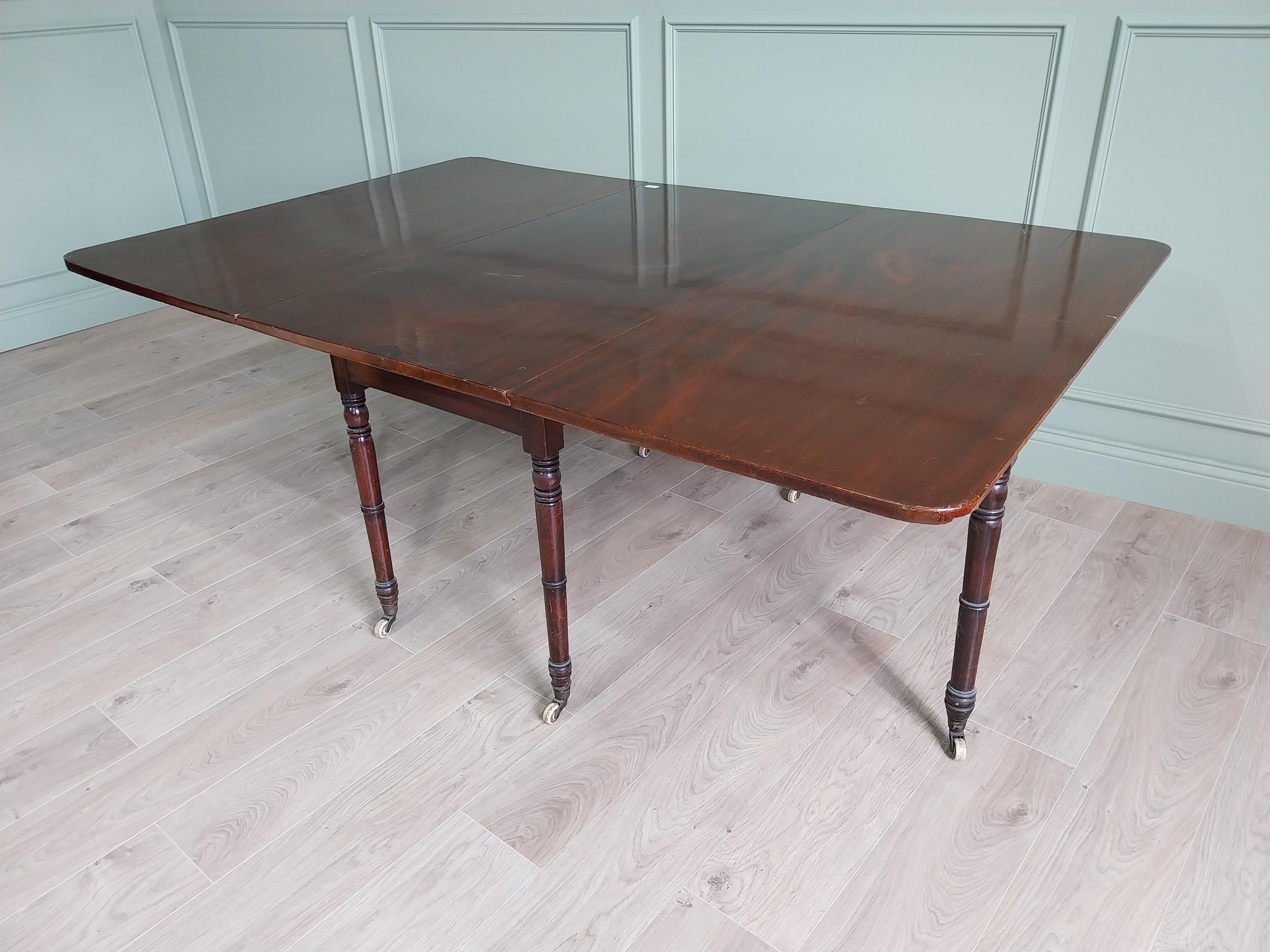 Regency flamed mahogany drop leaf dining table raised on turned legs and brass and ceramic castors {71 cm H x 184 cm W x 124 cm D}. U