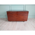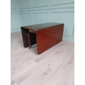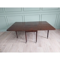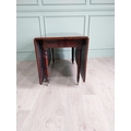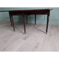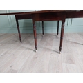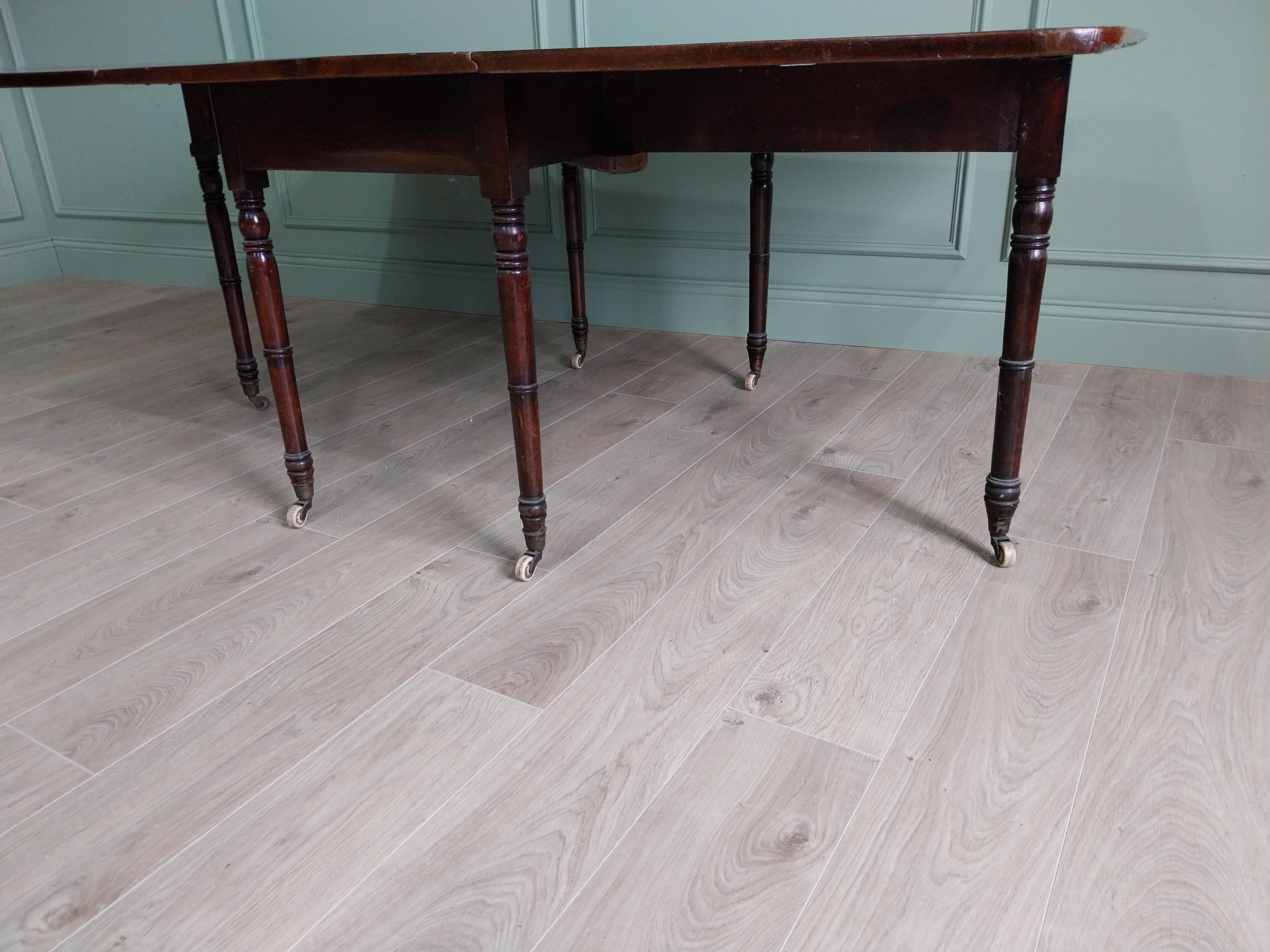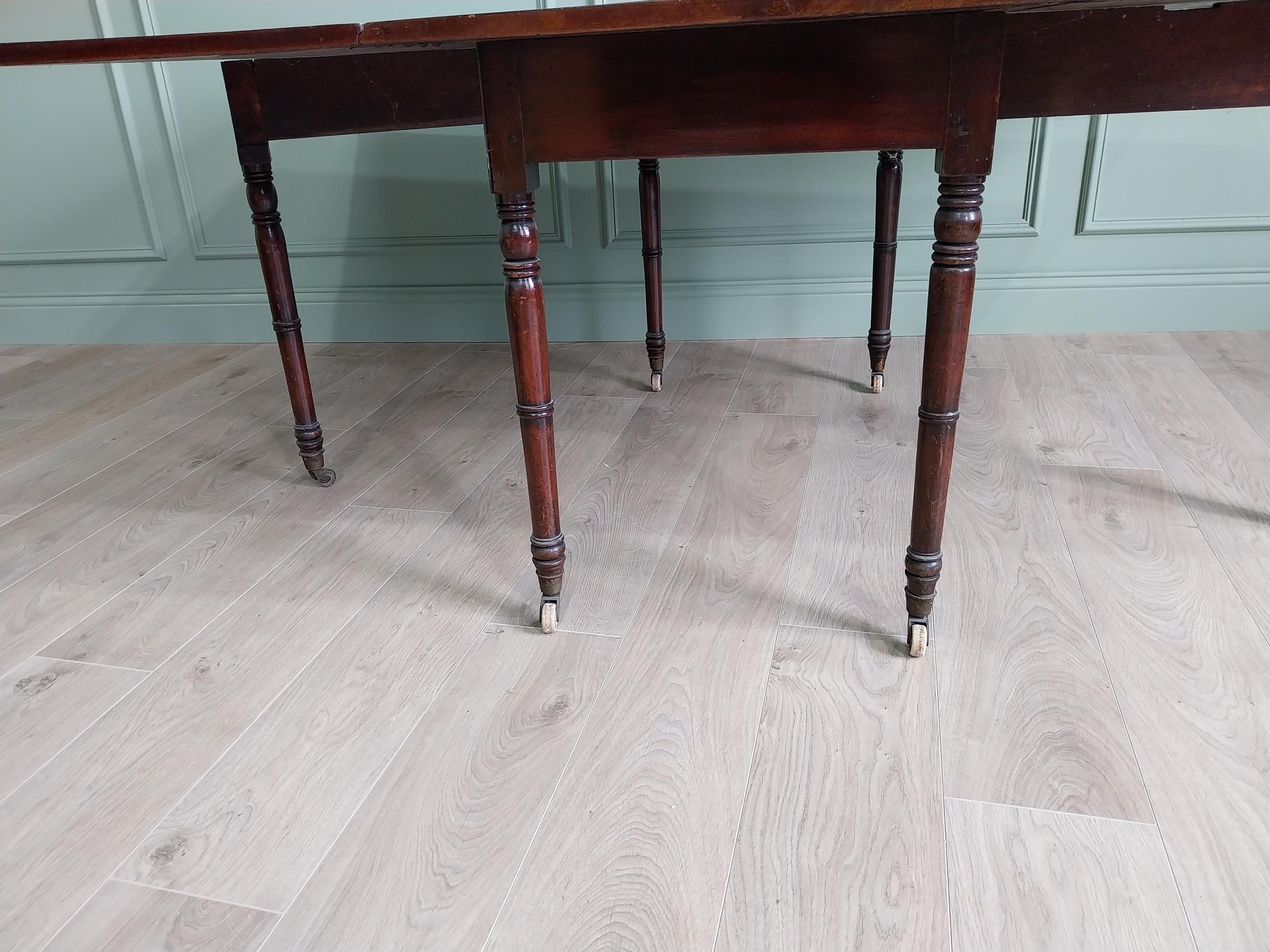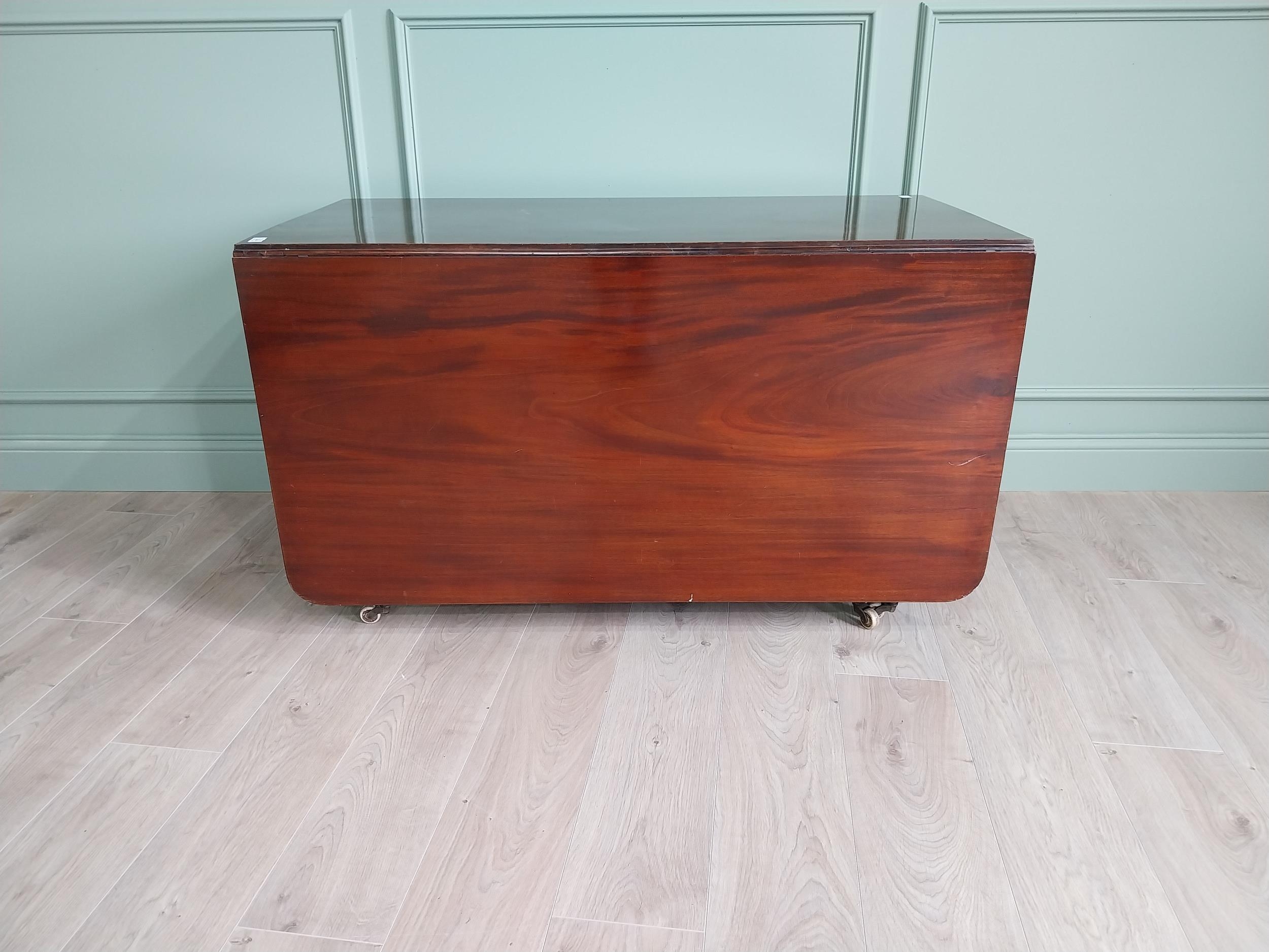 Regency flamed mahogany drop leaf dining table raised on turned legs and brass and ceramic castors {71 cm H x 184 cm W x 124 cm D}. U