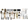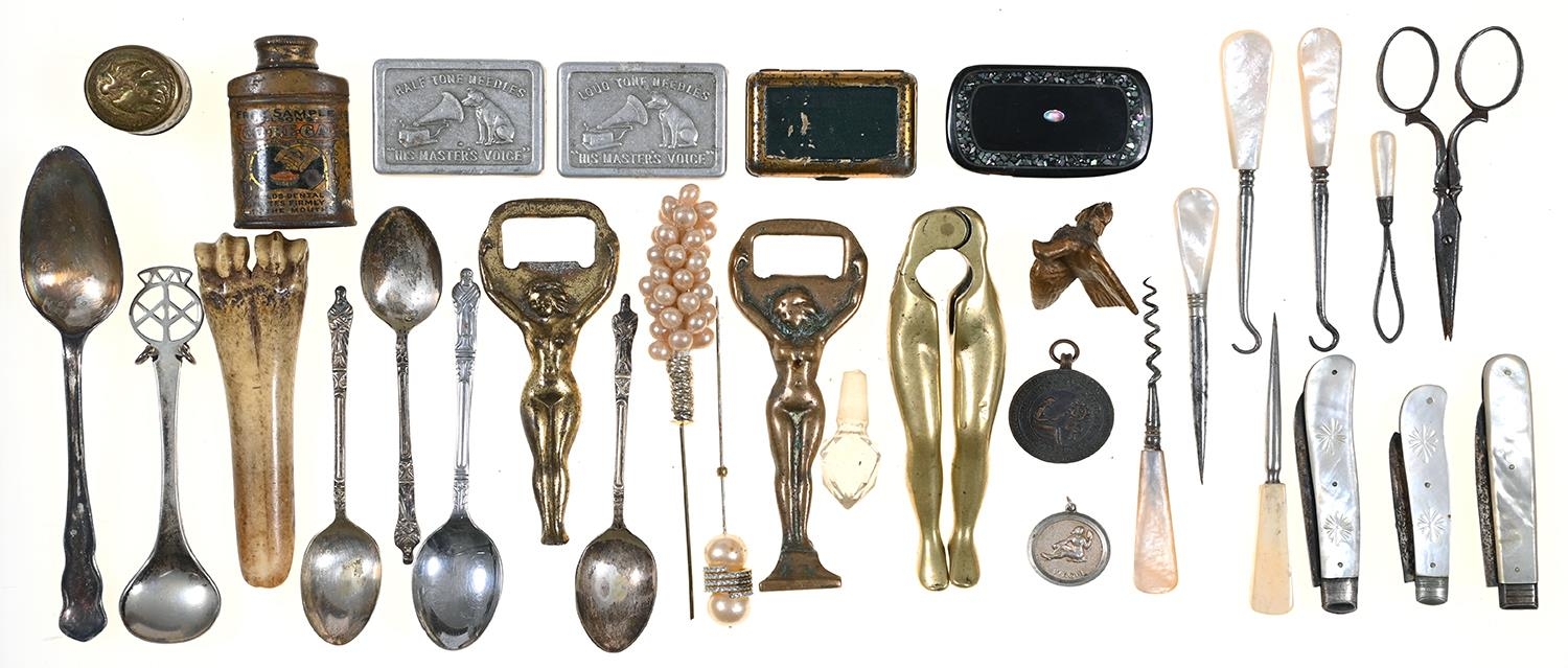 Three silver fruit knives, 19th and 20th c, with mother of pearl scales, a bone apple corer, 19th c, a pair of brass nutcracks and two bottle lifters, all of risqué form and miscellaneous bygones, etc