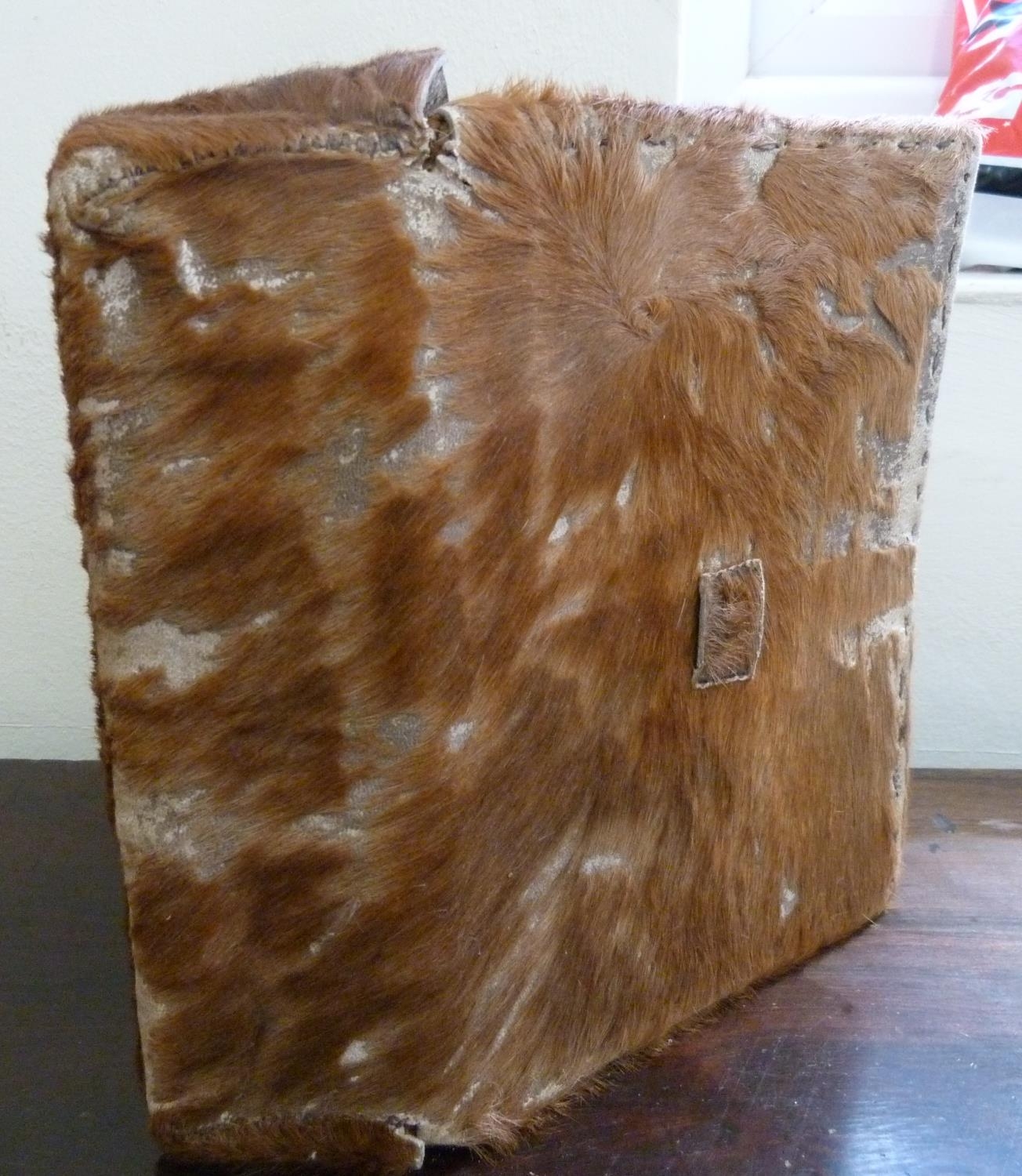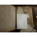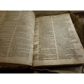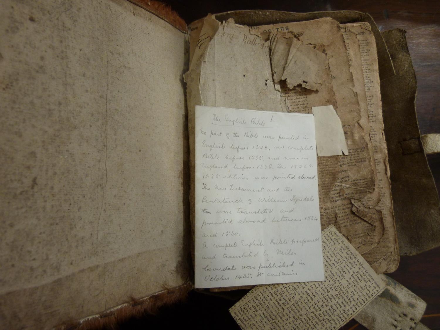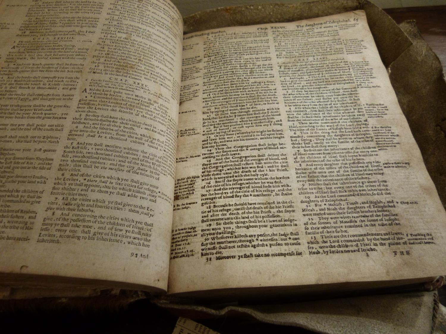 Breeches Bible. Late 16th century bible, small quarto in deerskin bdg., poor cond. with torn & lacking early leaves. The New Testament title, Christopher Barker, 1599. Sold as found.