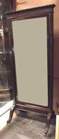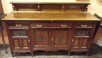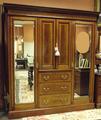 Late Victorian inlaid mahogany bedroom suite; wardrobe with a full length mirrored door to either side of a double cupboard over three drawers, mirror back dressing table, three drawer chest and chair.