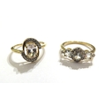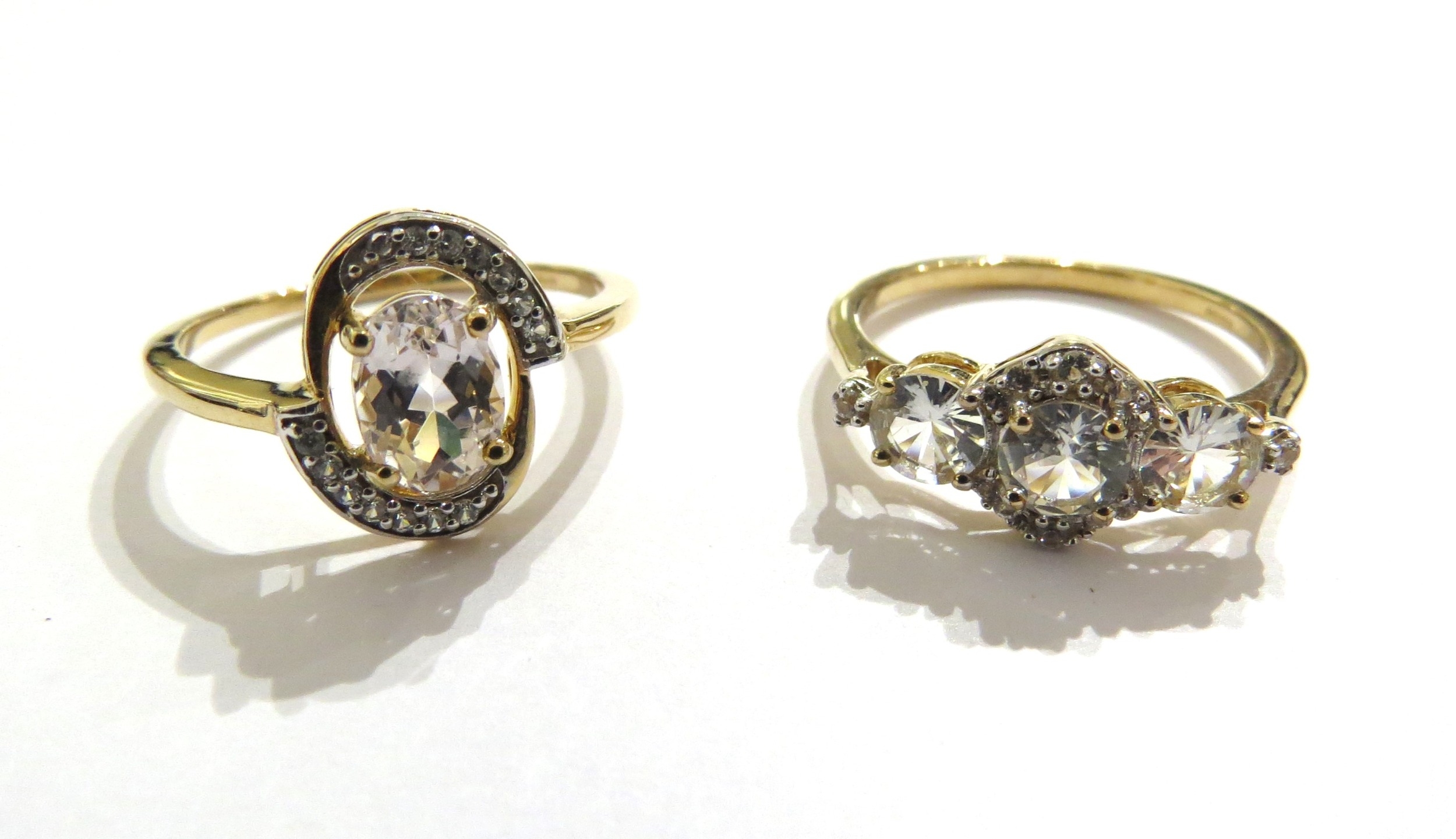 Two 9ct gold rings, white Ceylon and blue sapphire, size N/O and Minas Gerais kunzite and white zircon, size O, 4.2g (2)