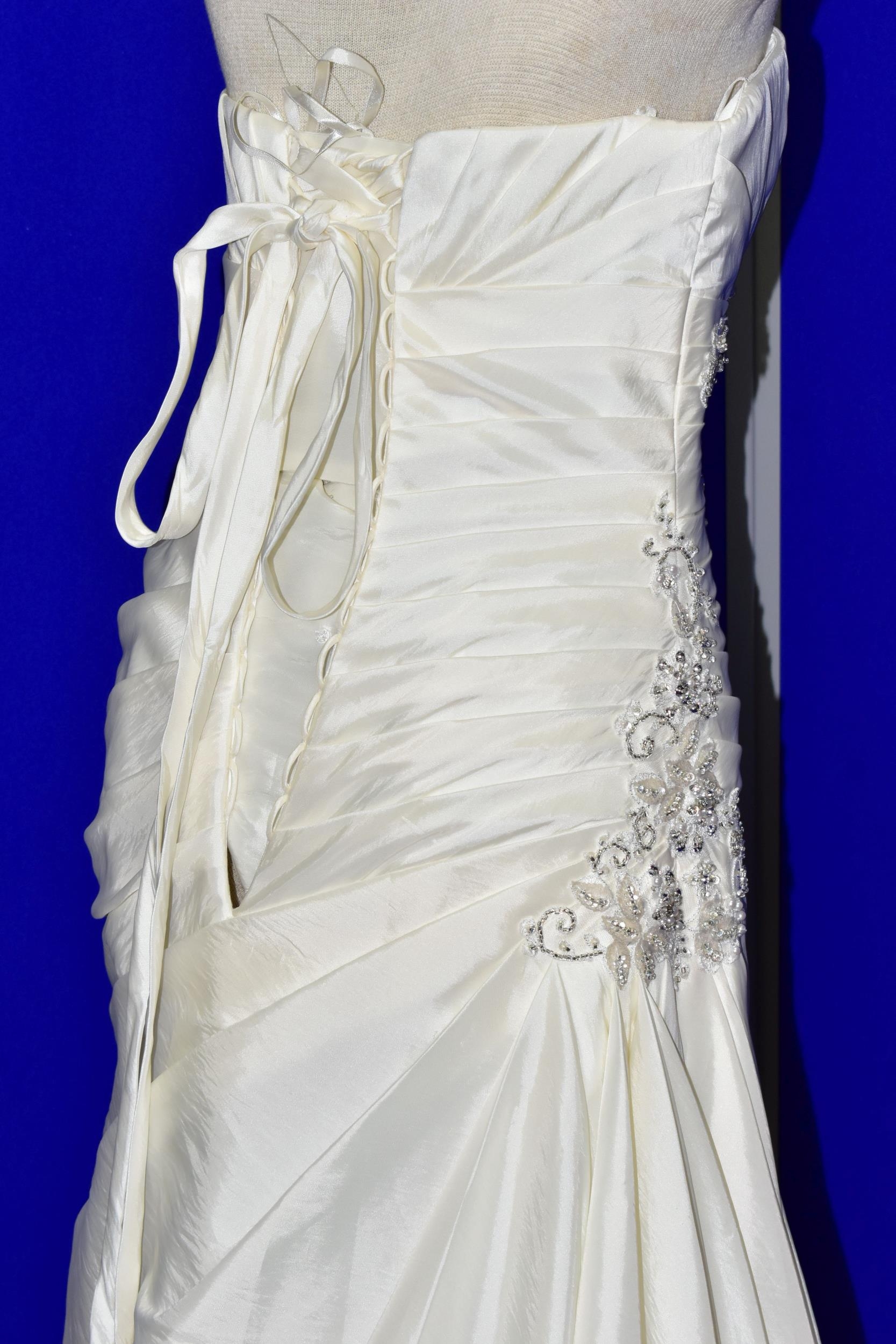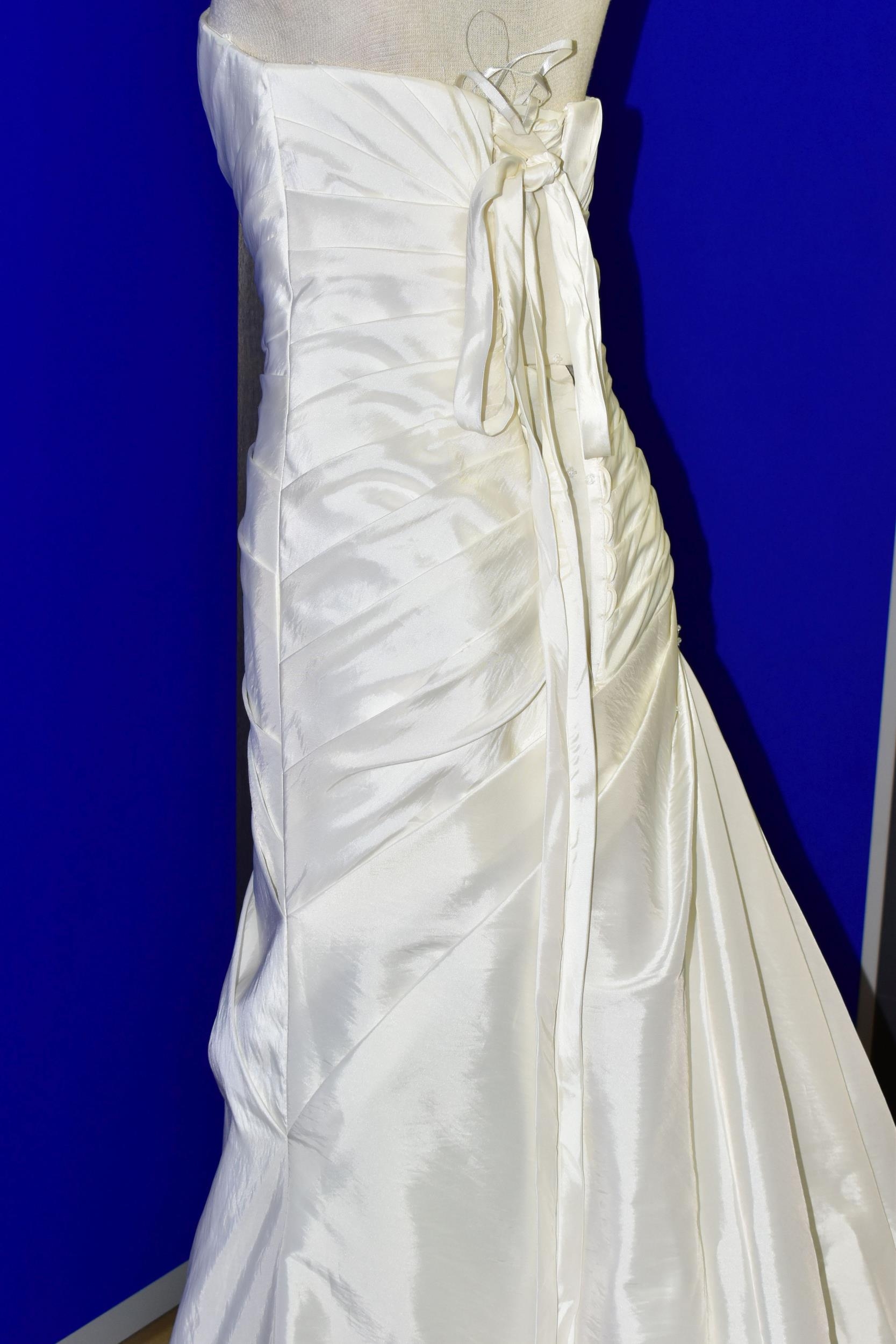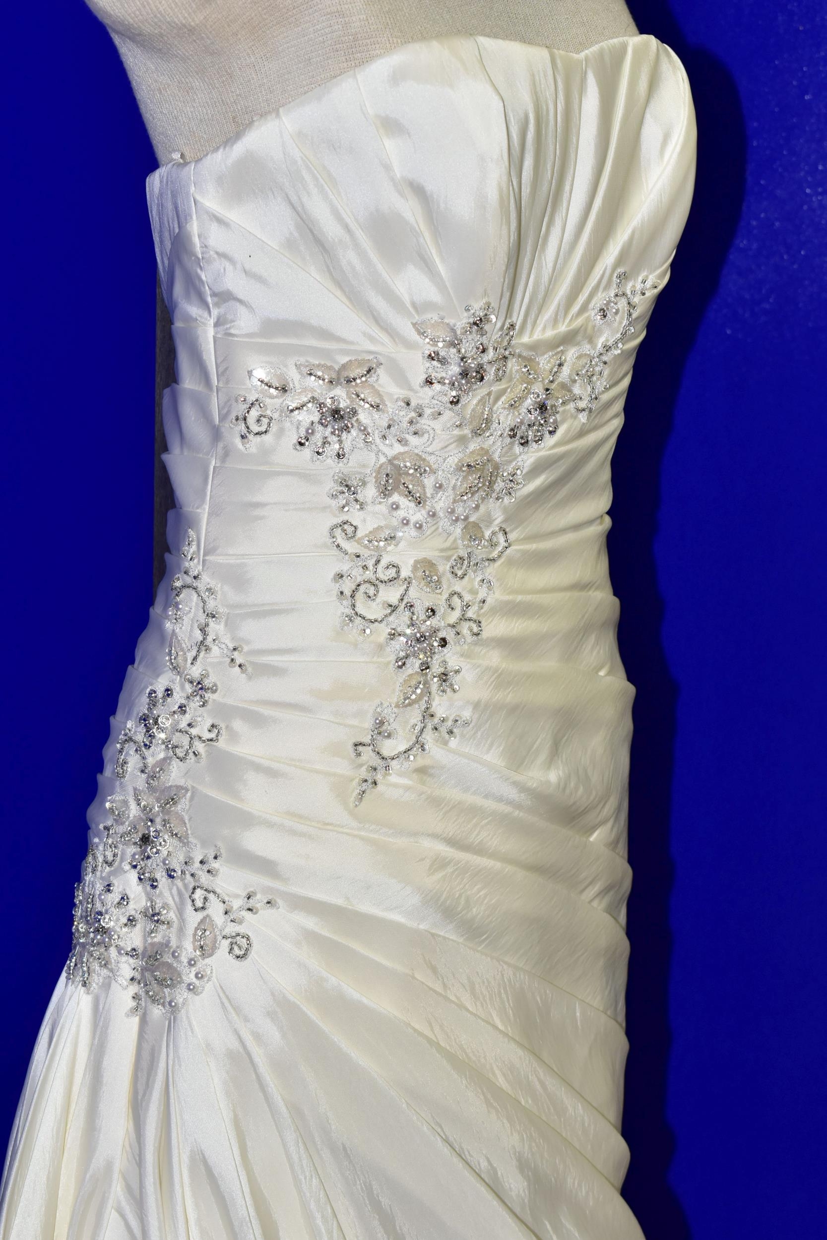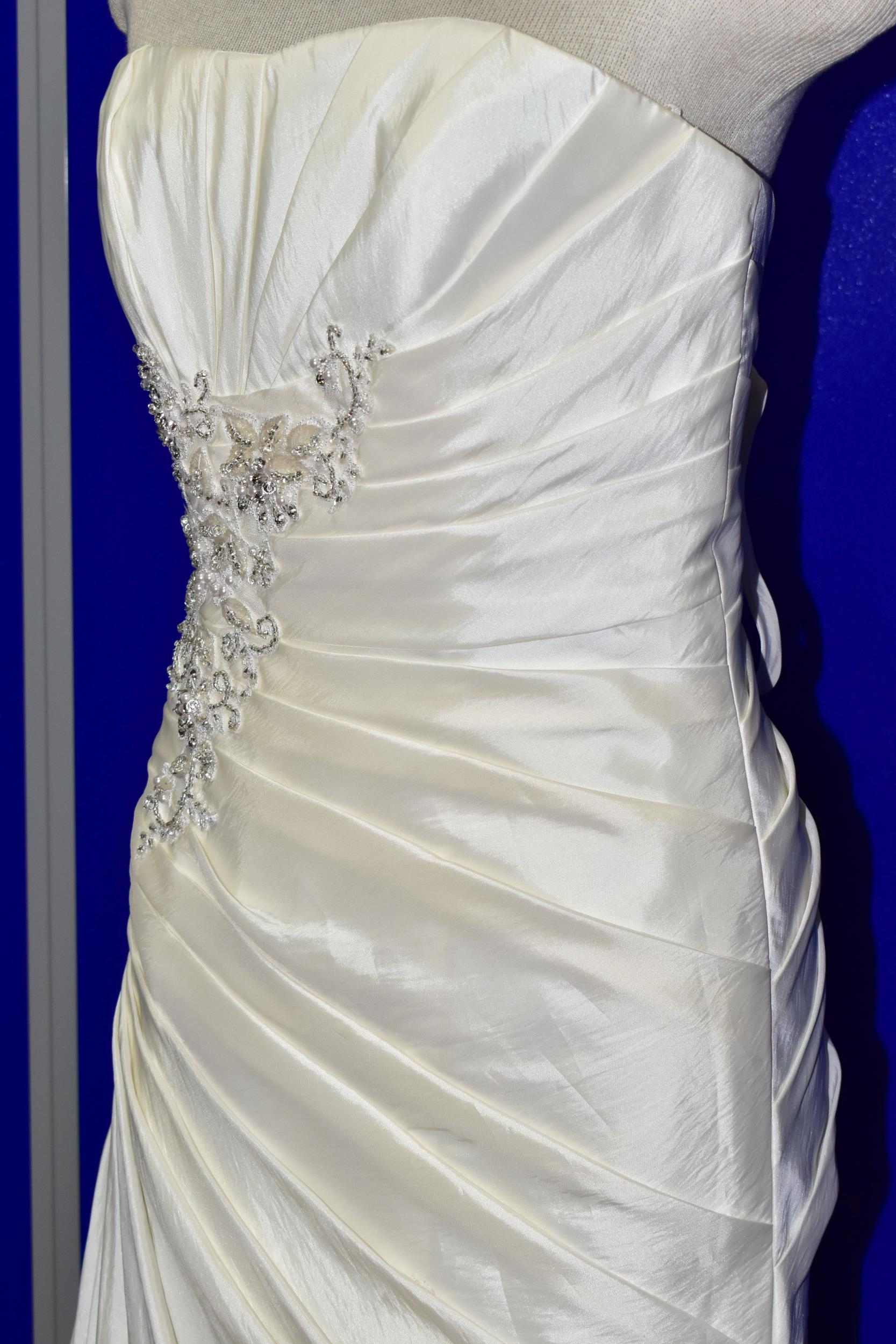 WEDDING DRESS, end of season stock clearance (may have slight marks) Ivory satin pleated, size 8, ribbon fastening for easy alteration (1)