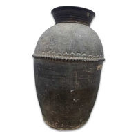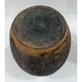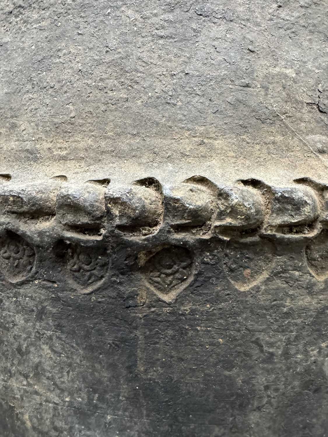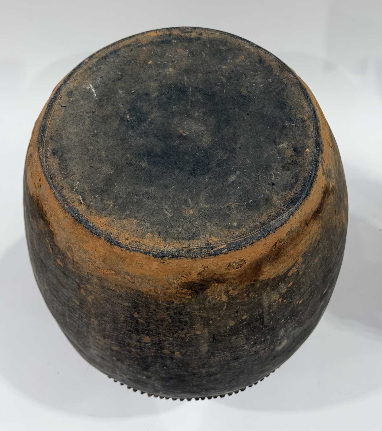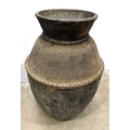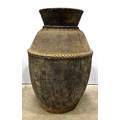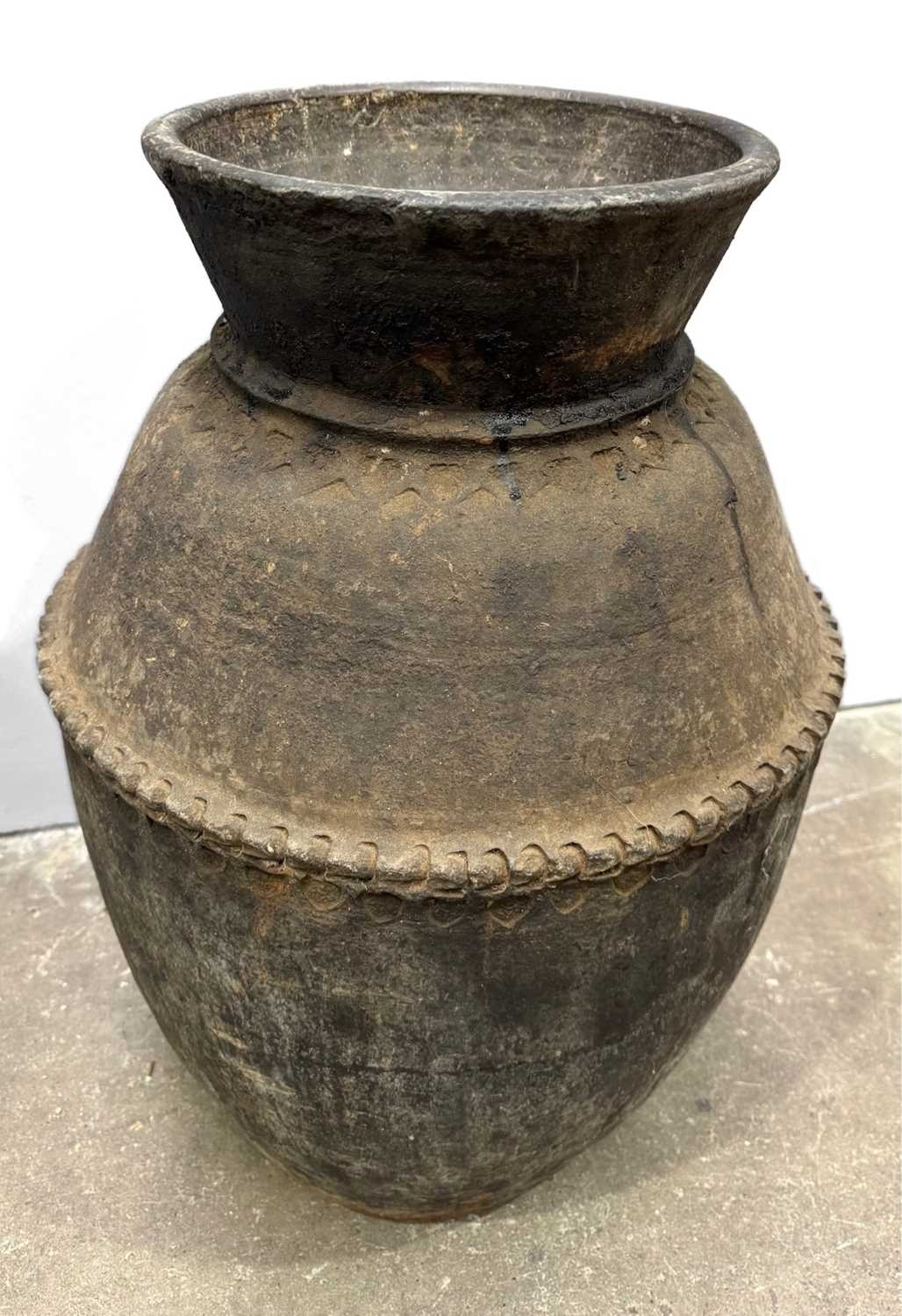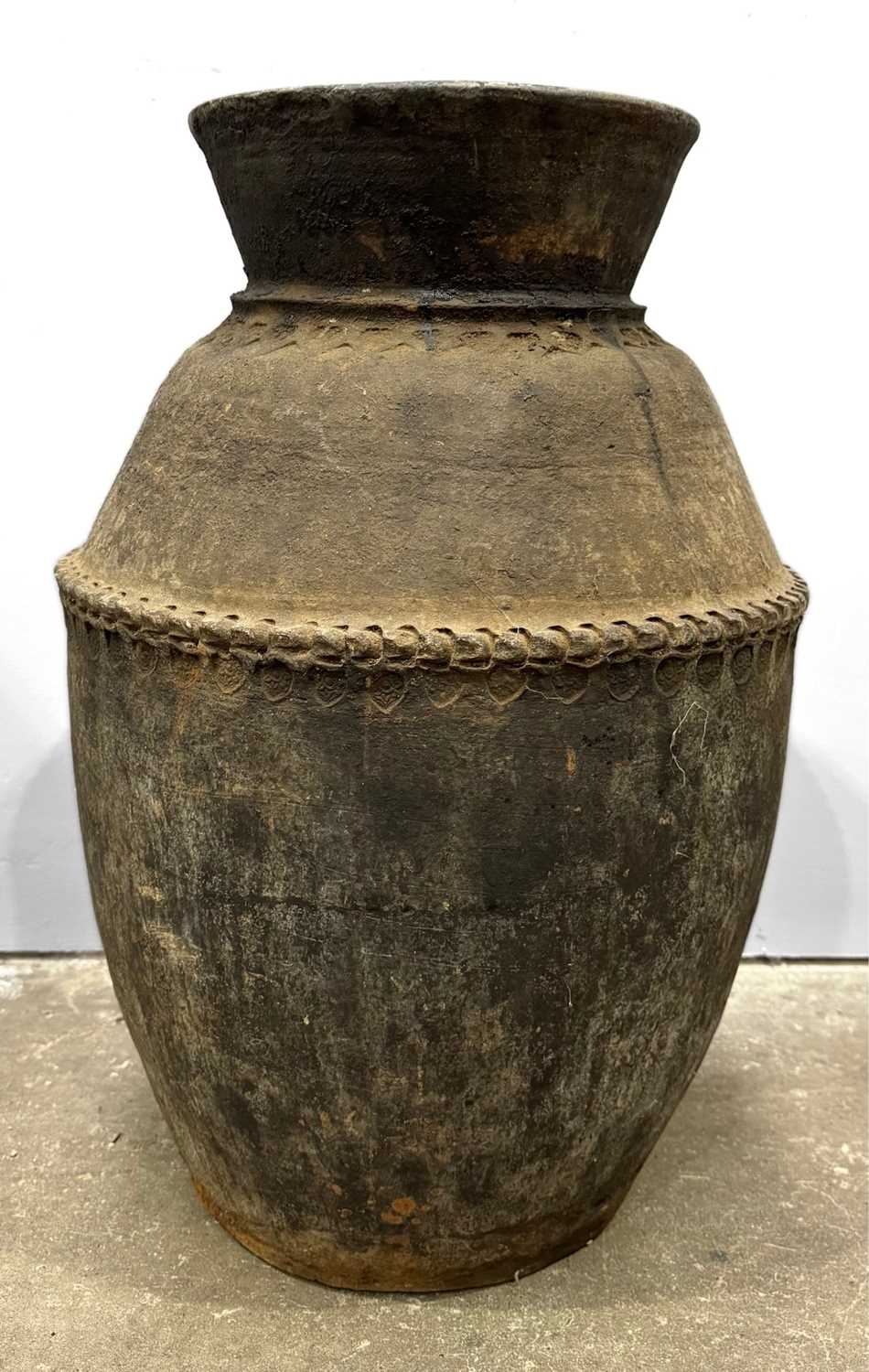 A large Newari hand-built earthenware vessel or 'Ghyampo' rice container, 18th century, flared rim above repeat leaf-form impressed decoration, with a relief beaded band bisecting the vessel body, h: 72cm, dia: 31cm, 18th century, Kathmandu valley, Nepal