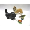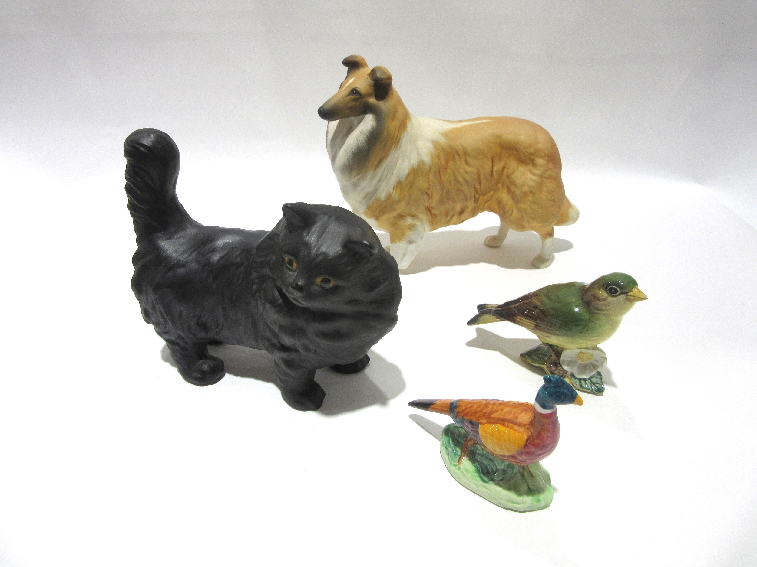 A Beswick Collie "Lochinvar of Ladypark" in matt, model no. 1791, Persian Cat in black matt, model no. 1898, small Pheasant, model no. 767B and Greenfinch, model no. 2105B