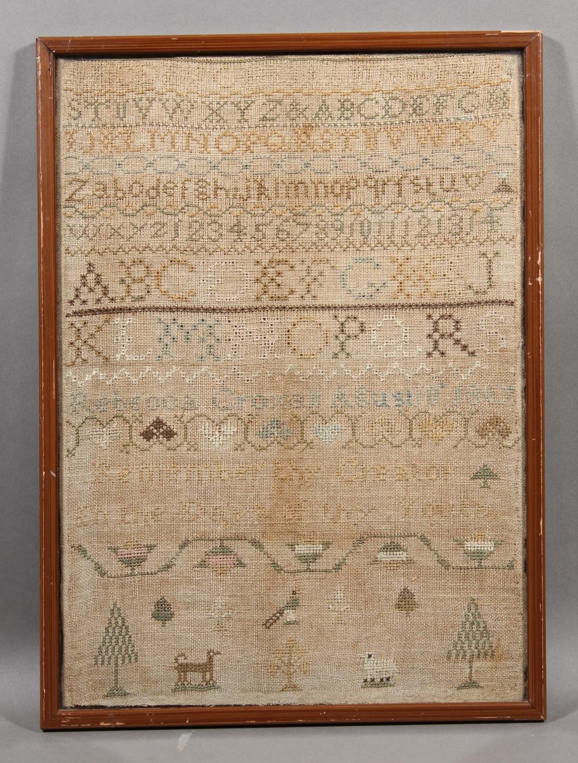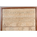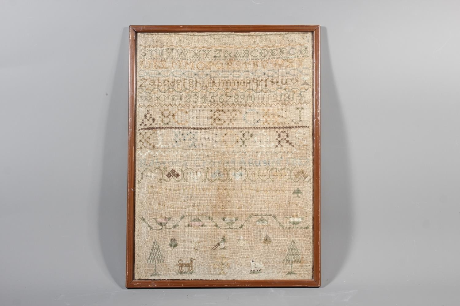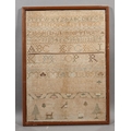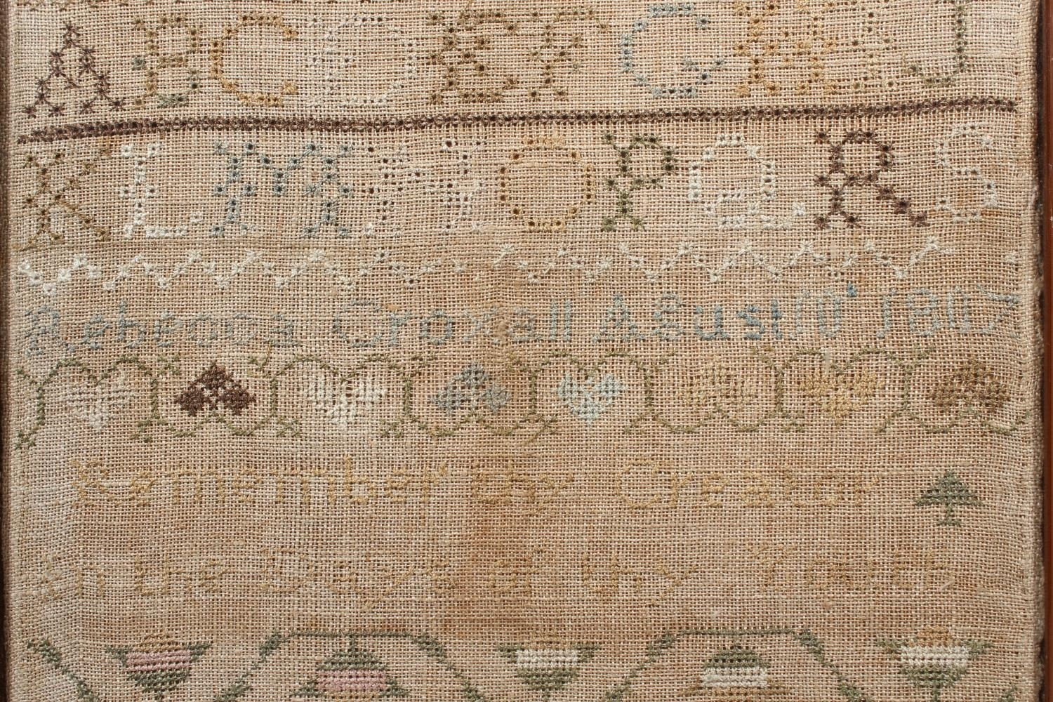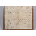 Antique needlework sampler with alphabet and numeral strands, bird, dog, sheep, trees and bible verse 'remember thy creator in the days of thy youth' executed by Rebecca Croxall 1807, 40cm x 29cm, frame 43cm x 32cm.
