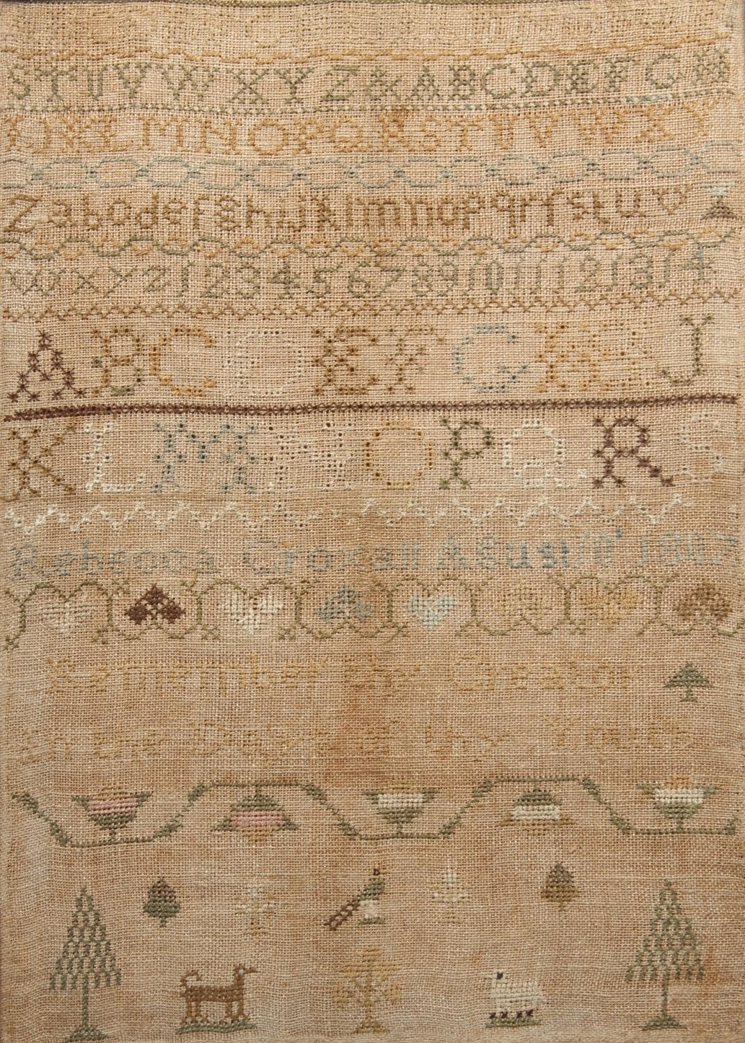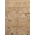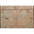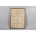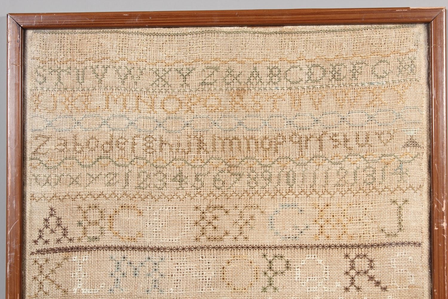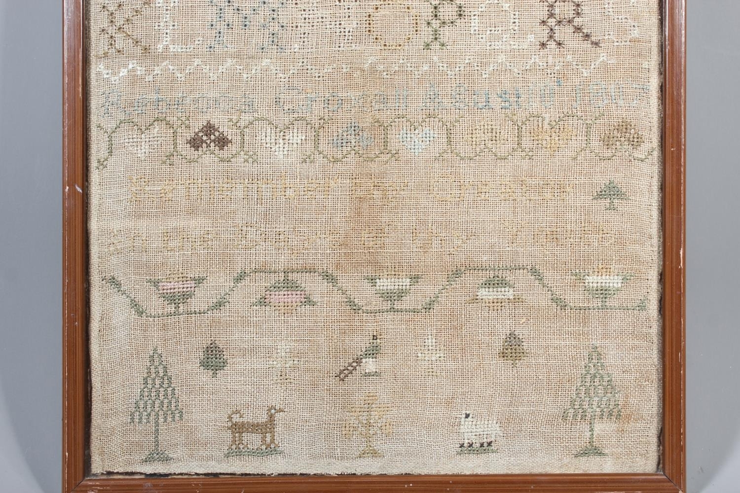 Antique needlework sampler with alphabet and numeral strands, bird, dog, sheep, trees and bible verse 'remember thy creator in the days of thy youth' executed by Rebecca Croxall 1807, 40cm x 29cm, frame 43cm x 32cm.