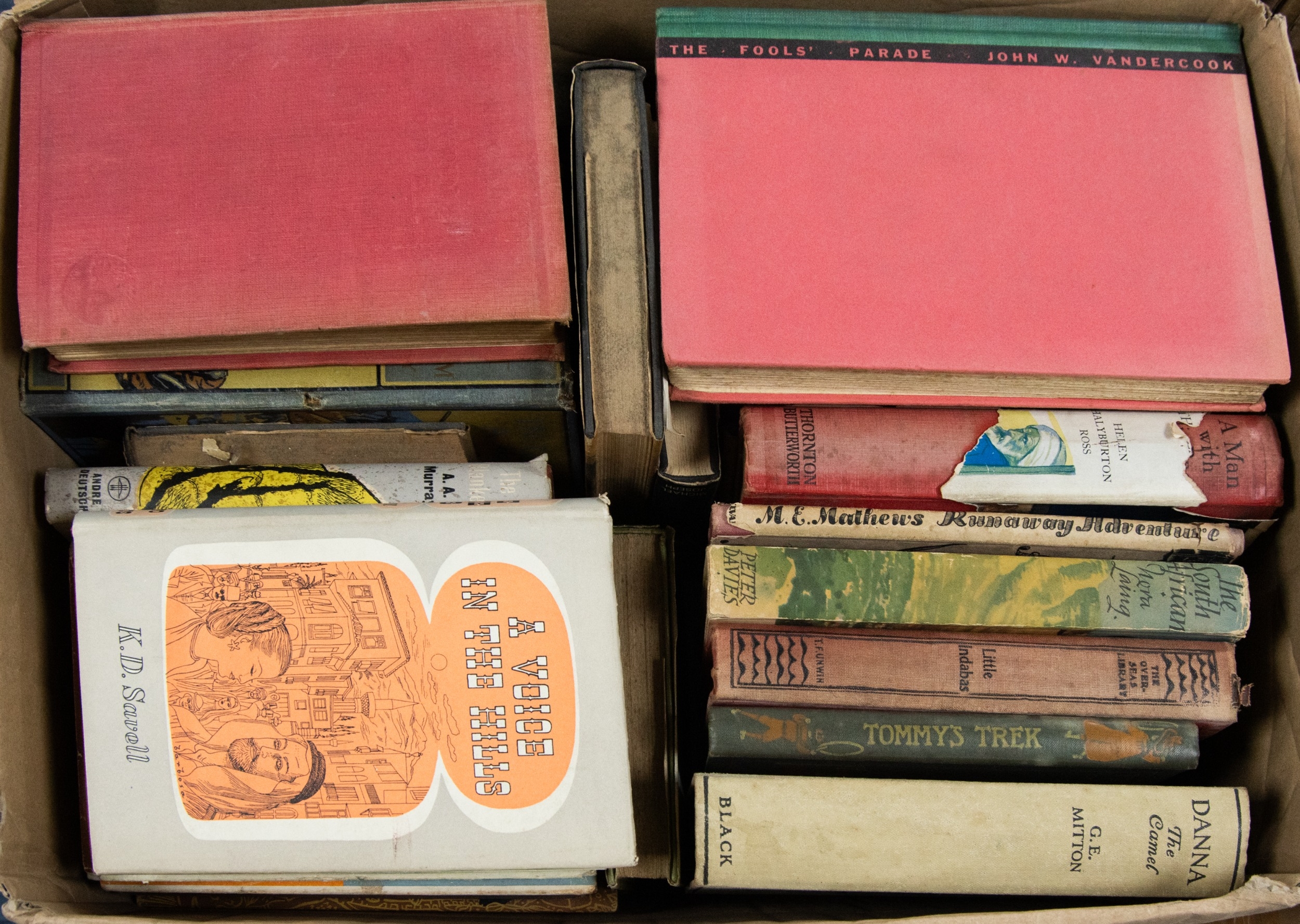 BESSIE MARCHANT - Tommy’s Trek, pub BLACKIE, n.d.. Florence Riddell- Out of the Mist, pub Thornton Butterworth. A A Murray - The Blanket- pub Andre Deutsch, pub Andre Deutsch, 1957 1st ed, dj. Together with a further group of COLONIAL FICTION, mainly relating to AFRICA & MIDDLE EAST, various authors to include K D SAVELL, DENISE ROBINS, F HORACE ROSE, JEAN KOLER, ARTHUR LEE KNIGHT, G E MITTON amongst others. Contents of a box