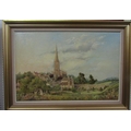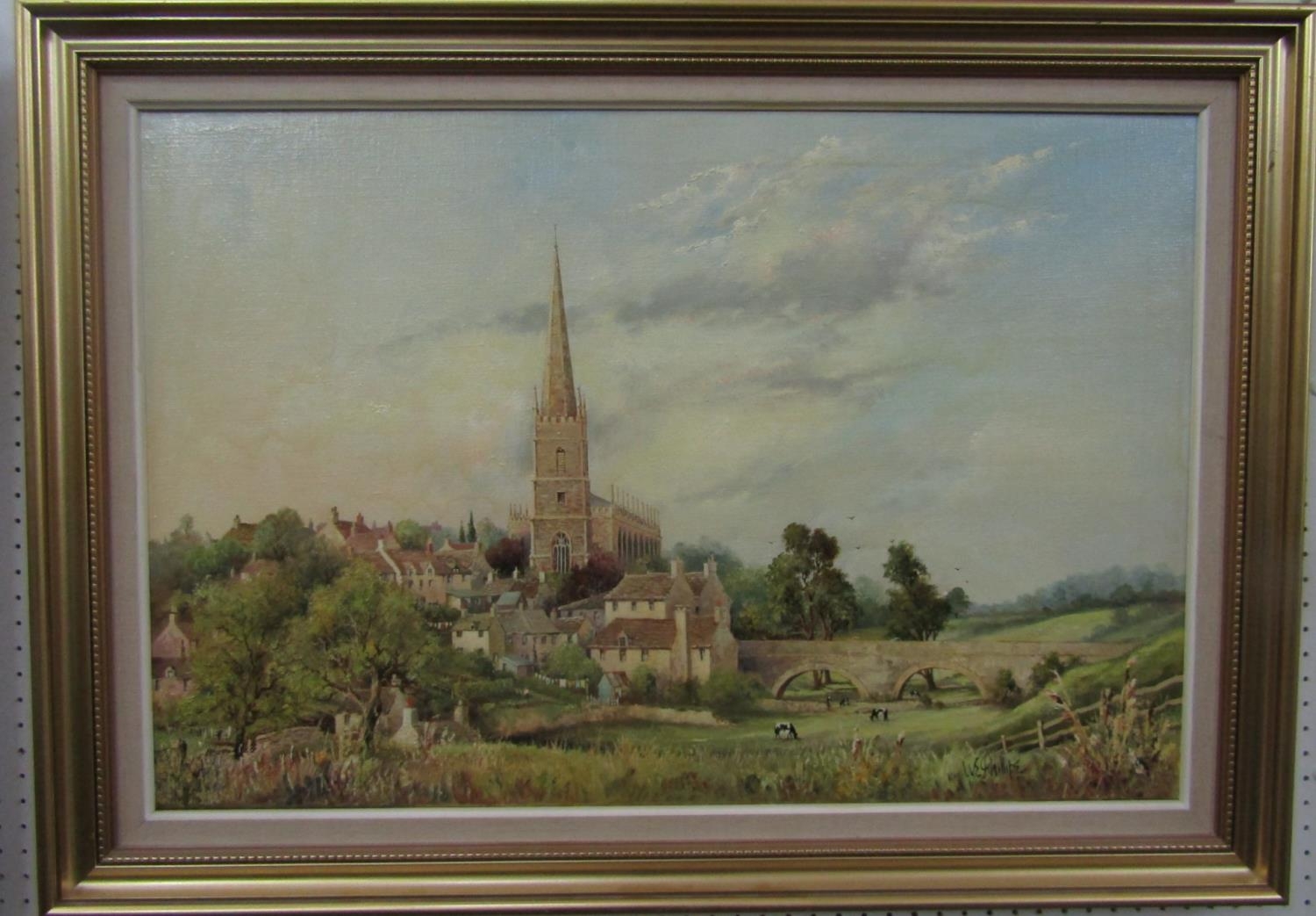 W E Philips (20th century British school) - A view of Tetbury Church, with bridge, cattle grazing, etc, oil on canvas, signed, 50 x 75cm approx, in gilt frame with linen slip