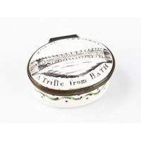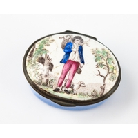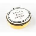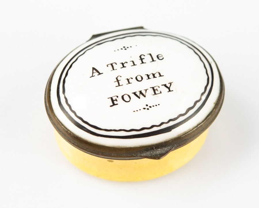 18TH CENTURY OVAL ENAMEL PATCH BOX inscribed in black on white 'A Trifle from Fowey', mirror to underside of hinge cover good, yellow base, 1½ wide (3.8cm)