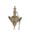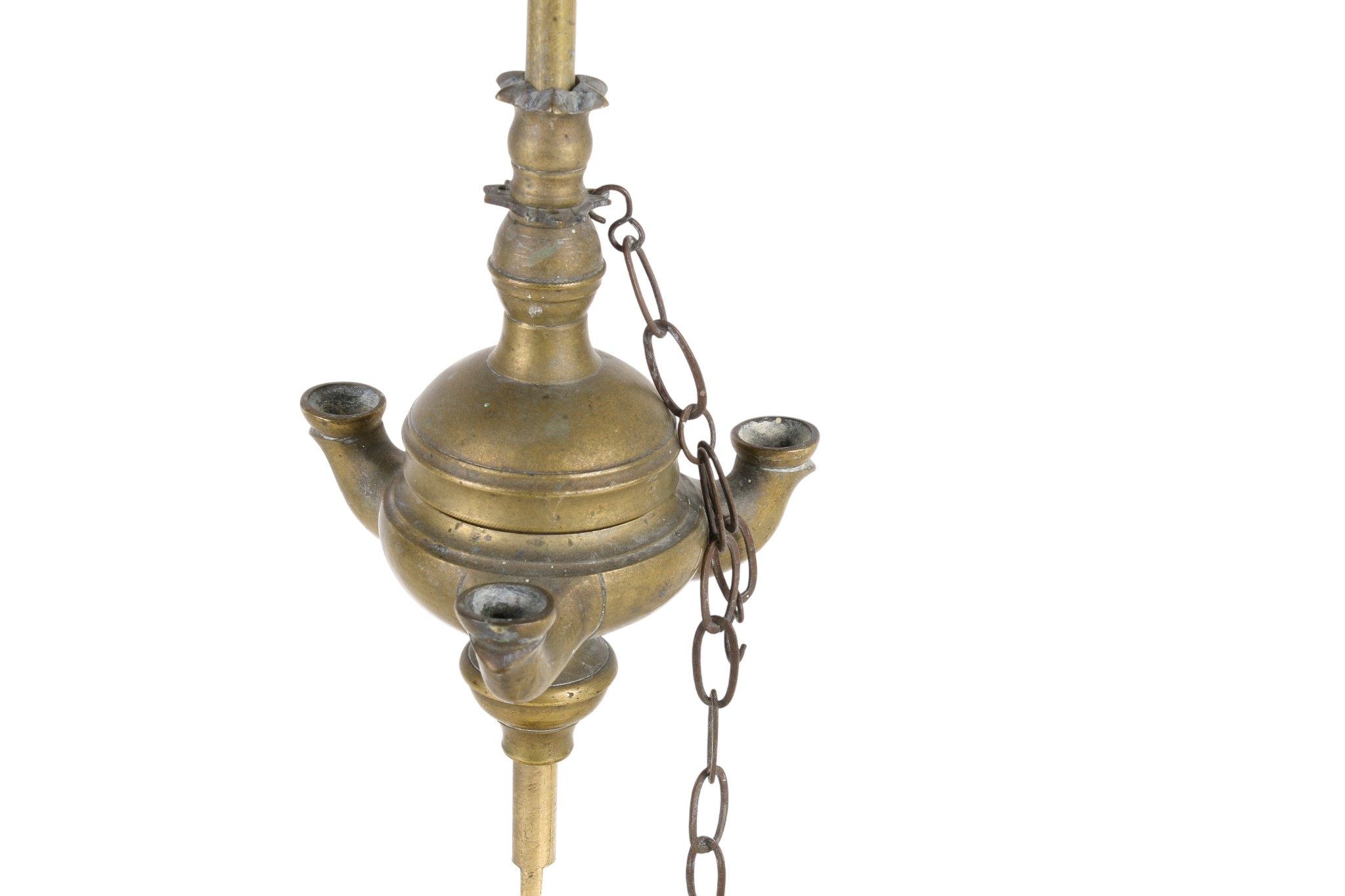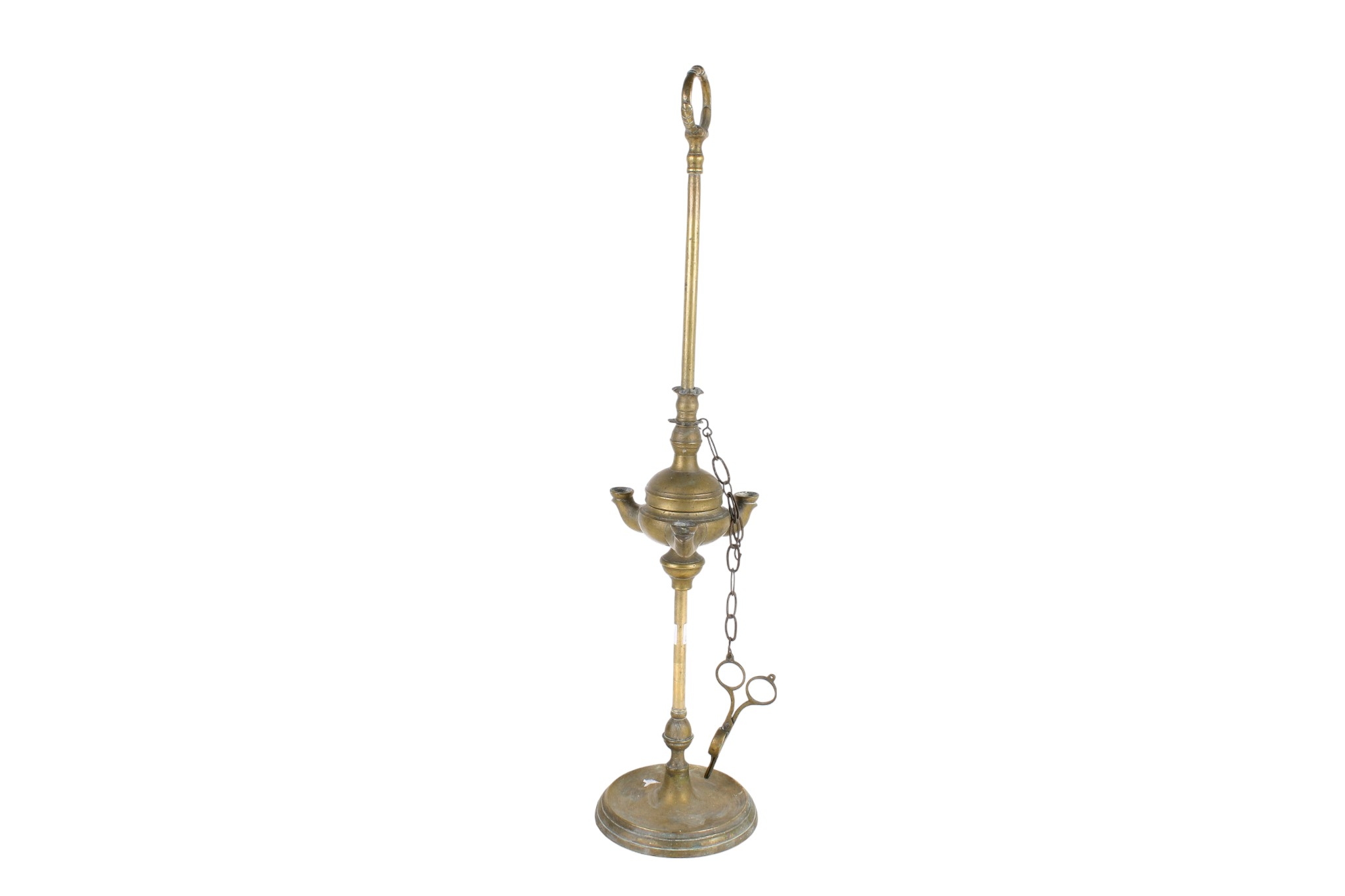 A late 19th century Lucerne brass oil lamp. Having a handle to the top, mounted on a circular base, H56cm.