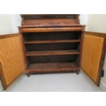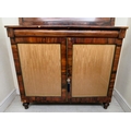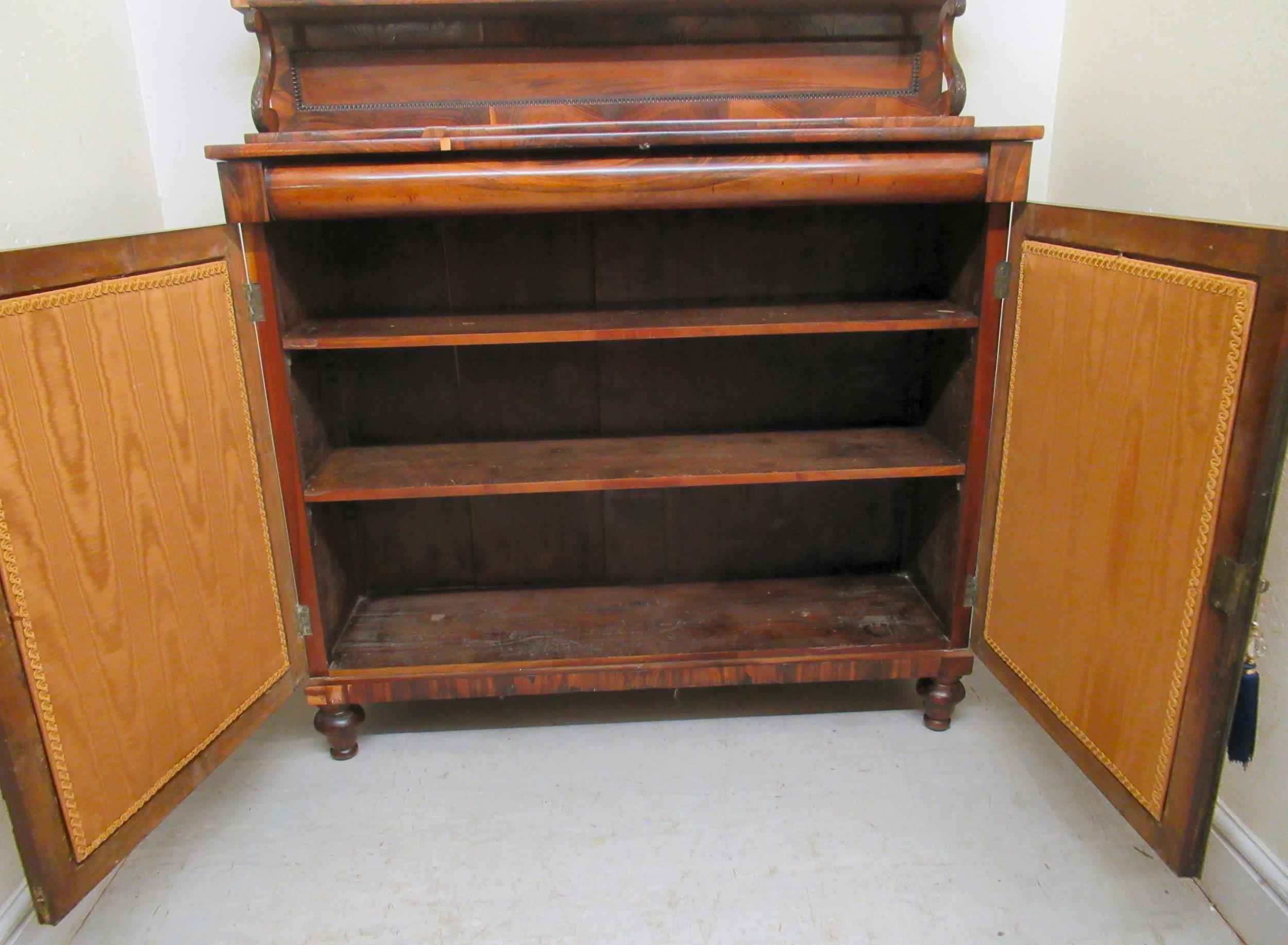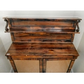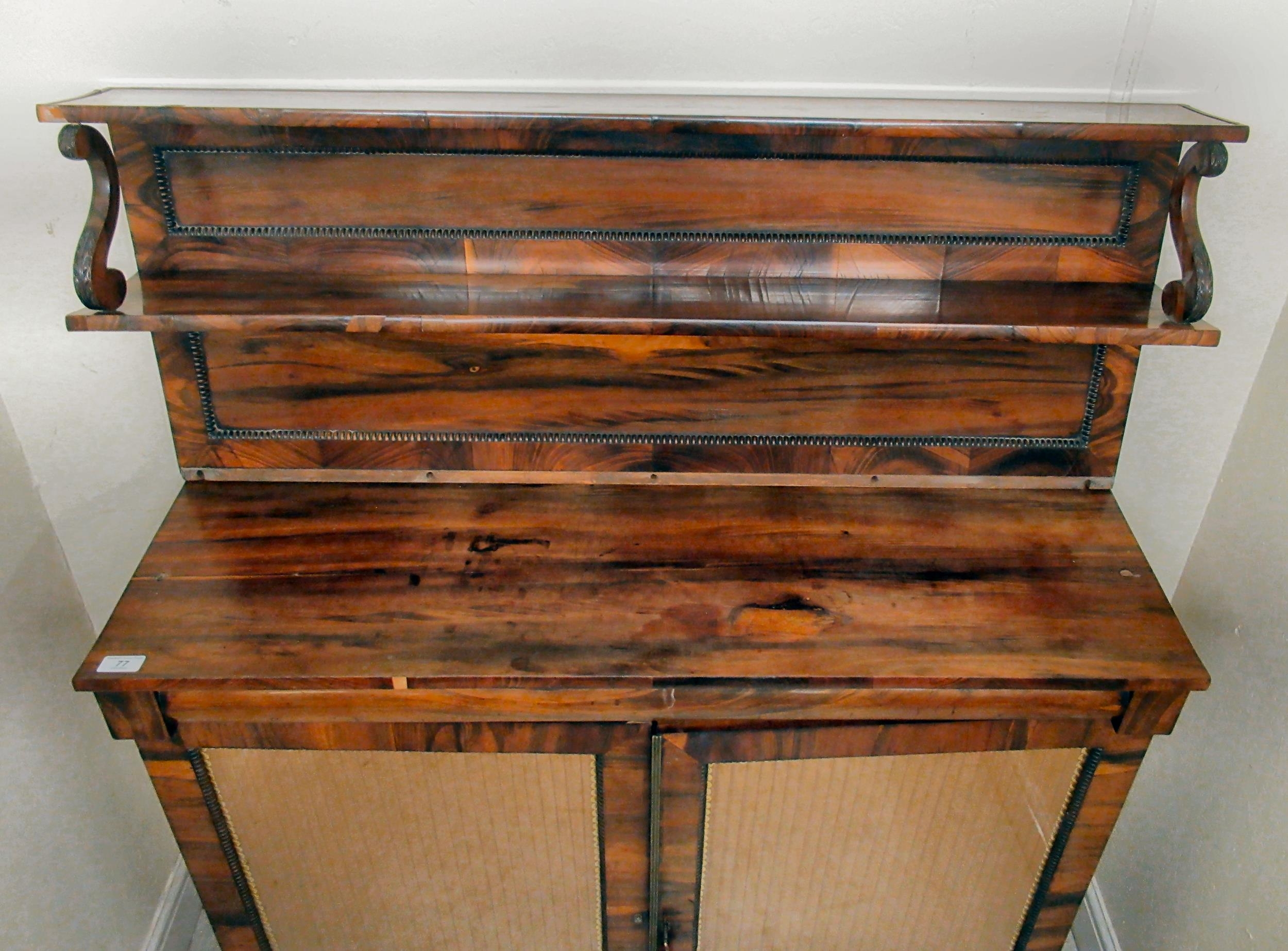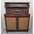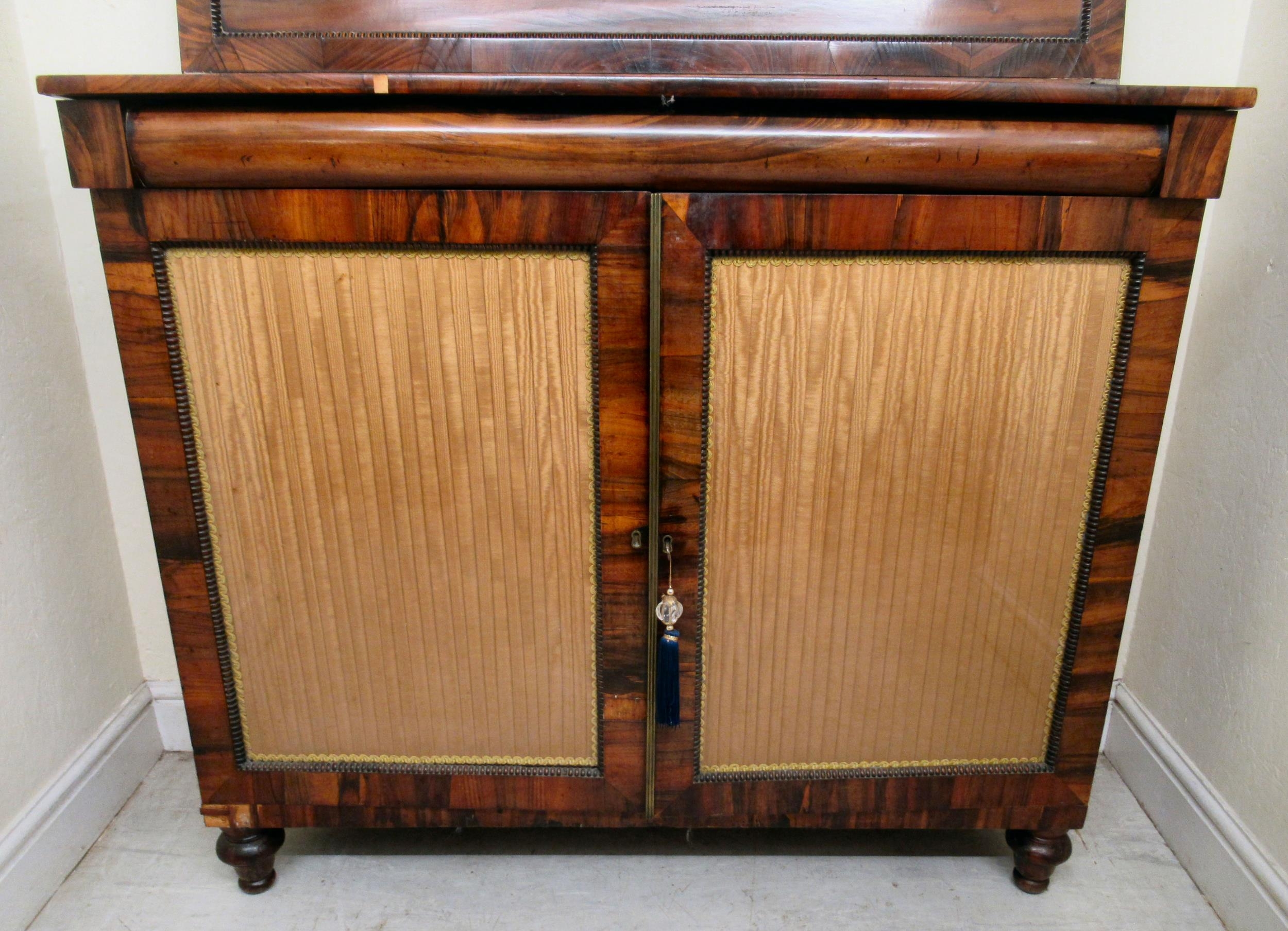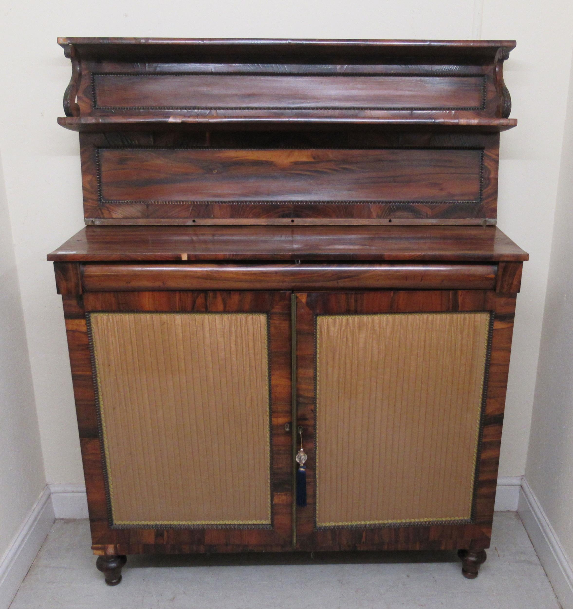 A Regency goncalo alves chiffoniere with bead carved borders, the shelved upper part over a pair of full height, glazed doors with pleated fabric panels, raised on short, turned feet 53"h 42"w
