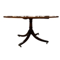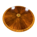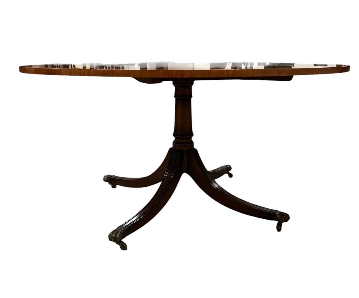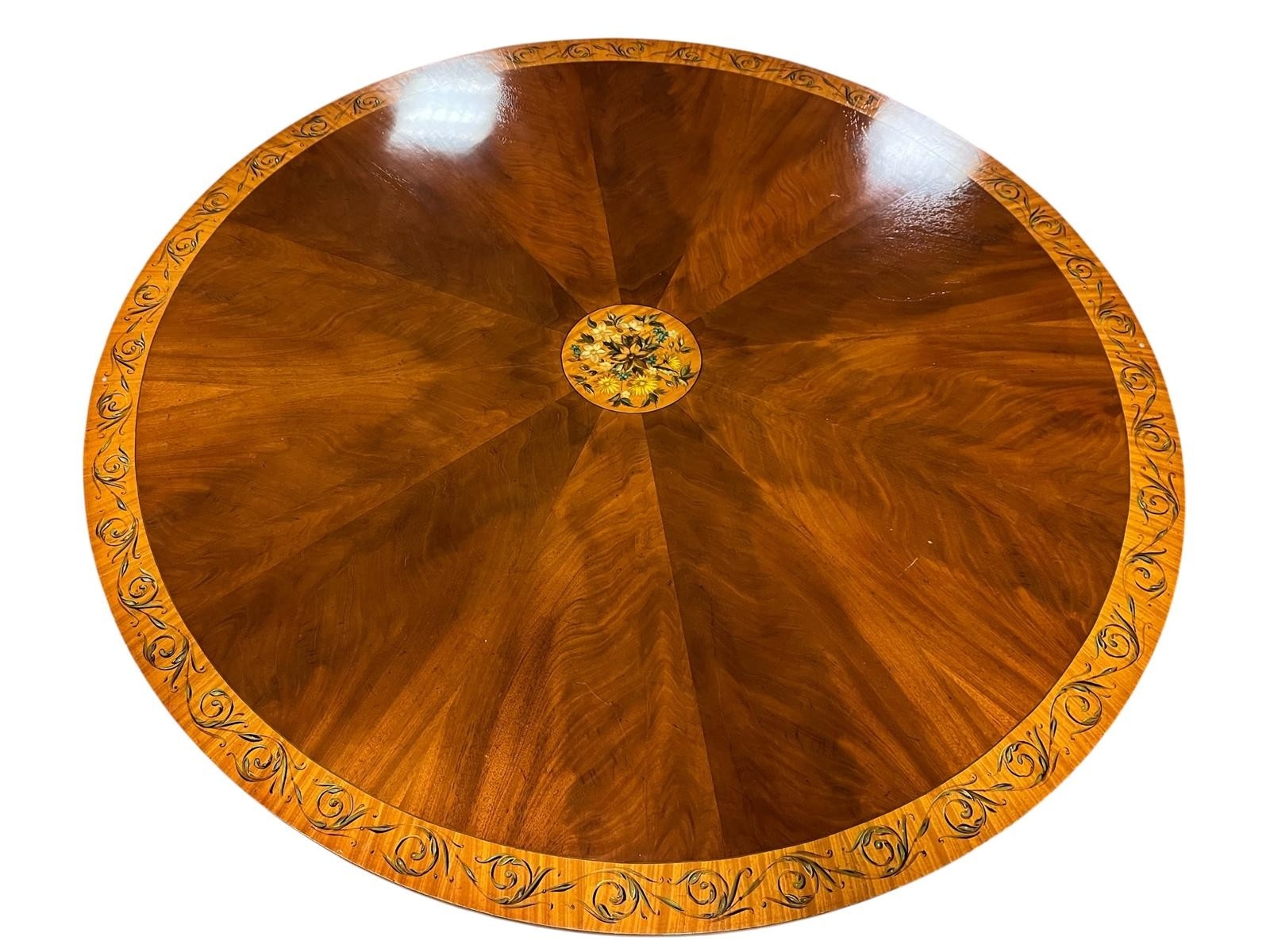 A GEORGIAN STYLE MAHOGANY SATINWOOD AND POLYCHROME POD TABLE the circular top with painted flowerheads and foliage with glazed panel raised on a baluster support on quadruped splayed legs with brass caps and castors 74cm (h) x 152cm (d)