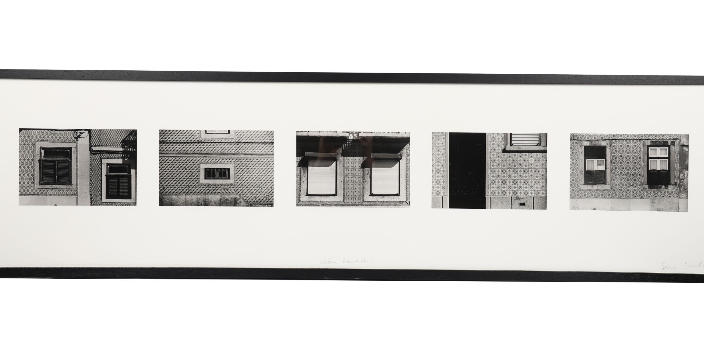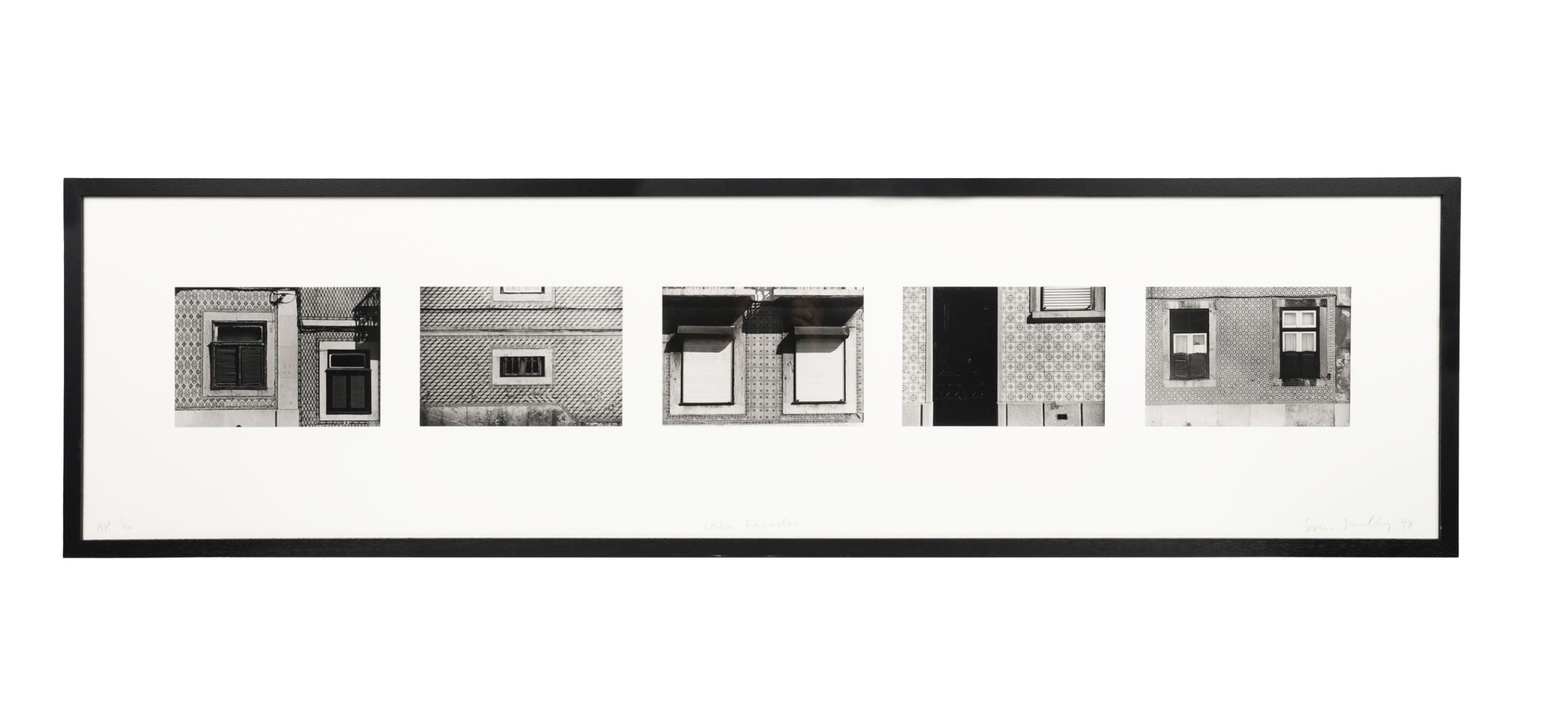 Limited edition silver gelatin print, No. 5 from an edition of 25, titled Lisbon Facades. Depicts a sequence of urban architectural details in black and white. Signed lower right, titled lower centre, and numbered lower left. Professionally framed and glazed. Image: each 15 x 23 cm. Framed: 41 x 155 cm. PICTURES AND PRINTS Thursday 11th December 2025 19:17:28