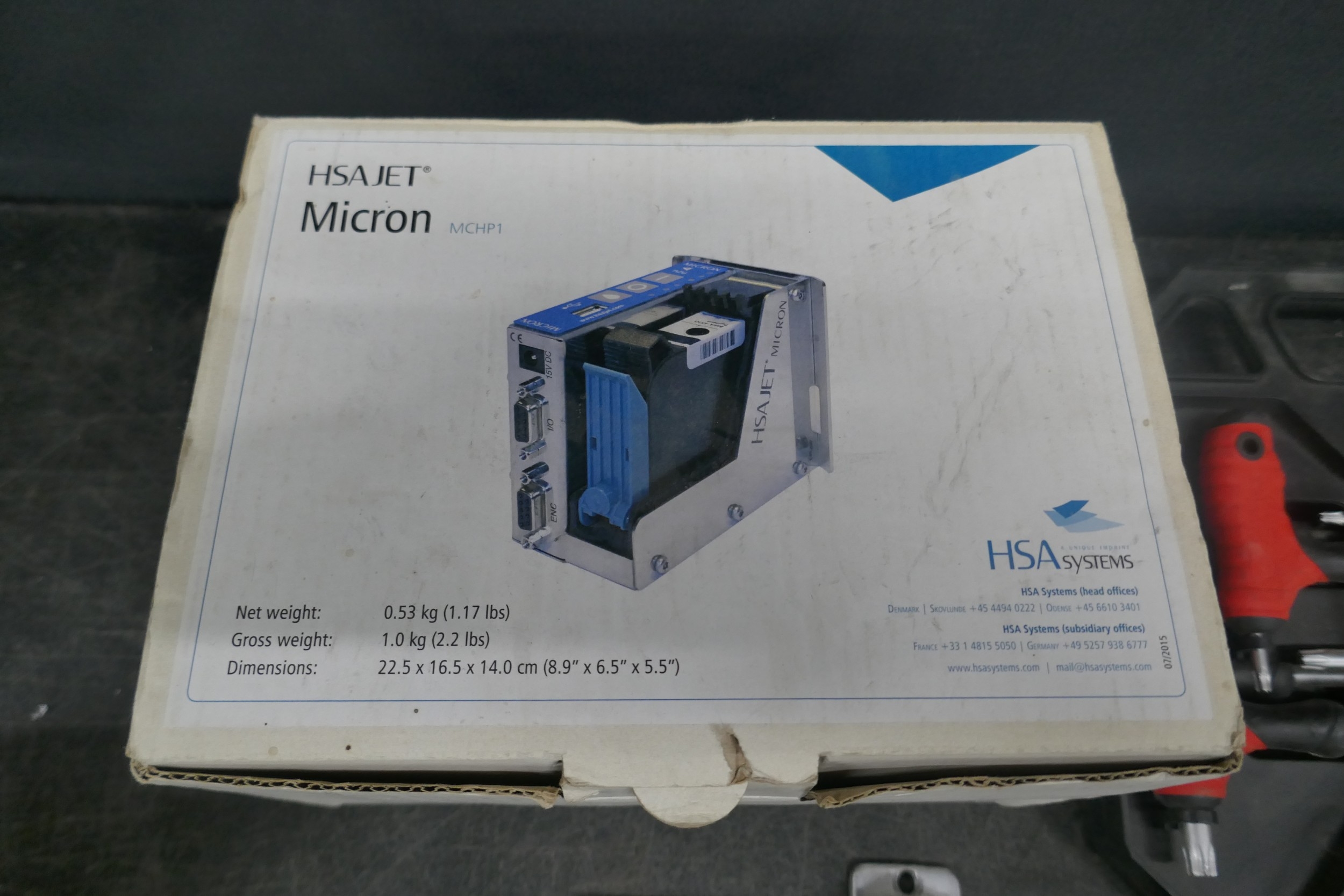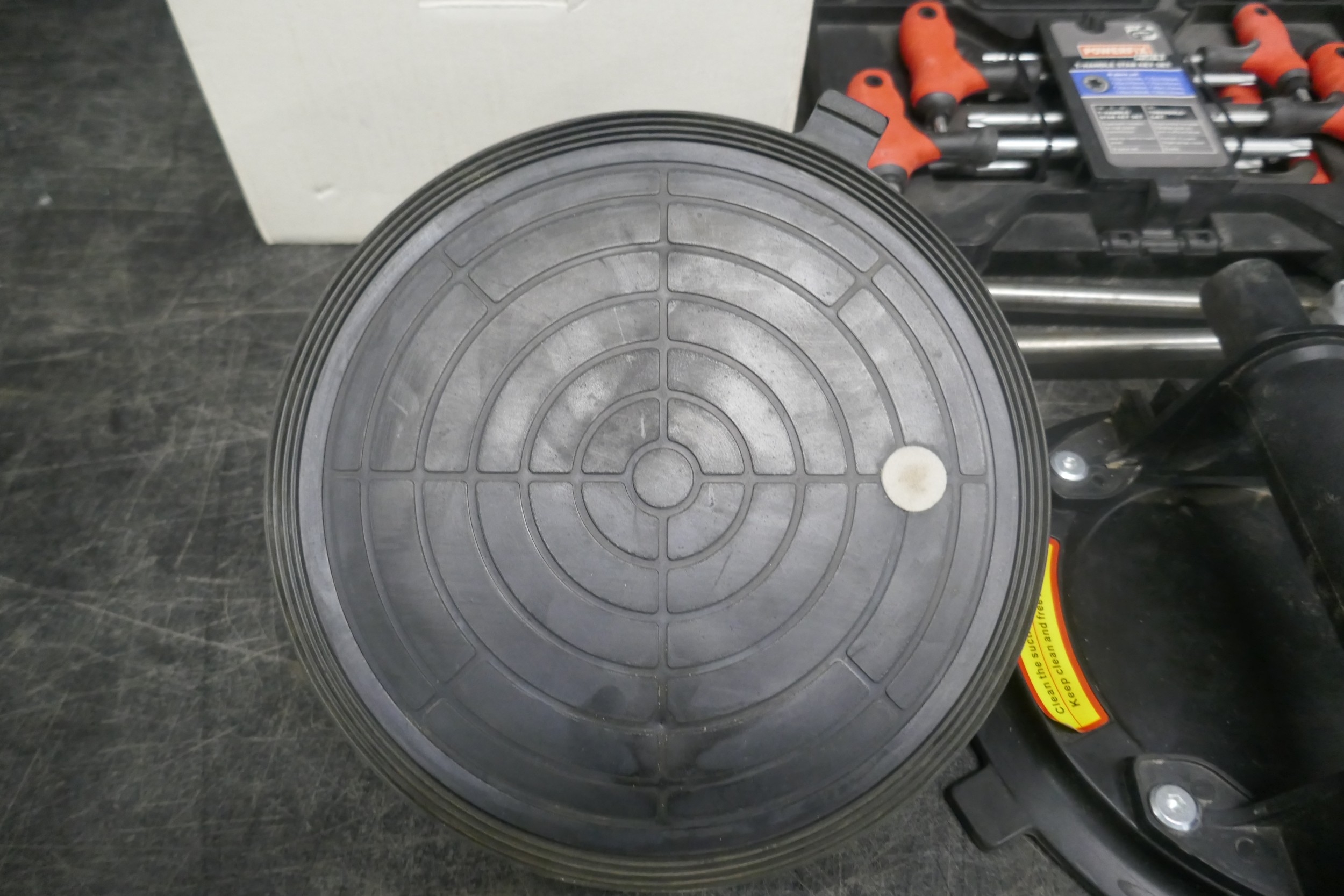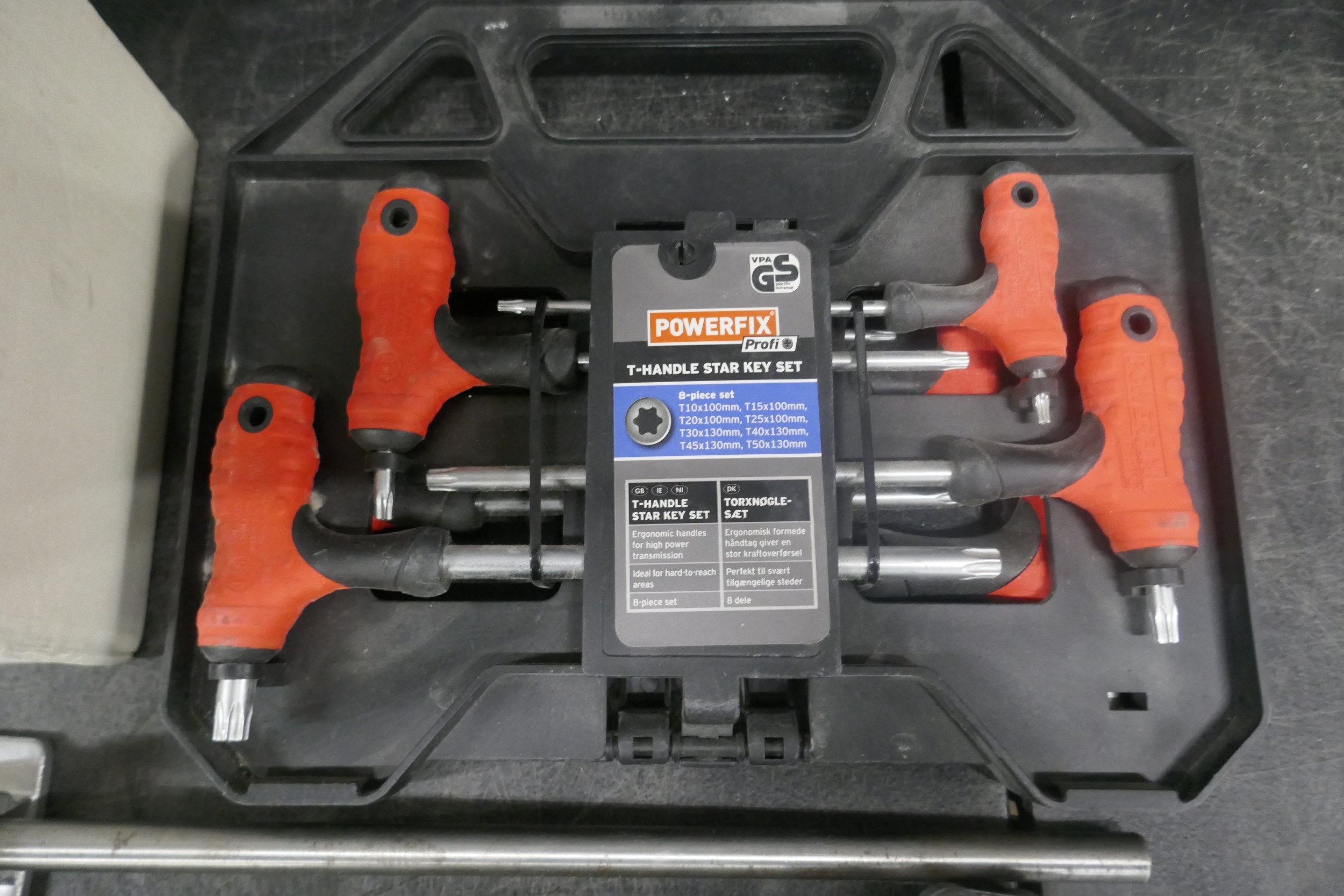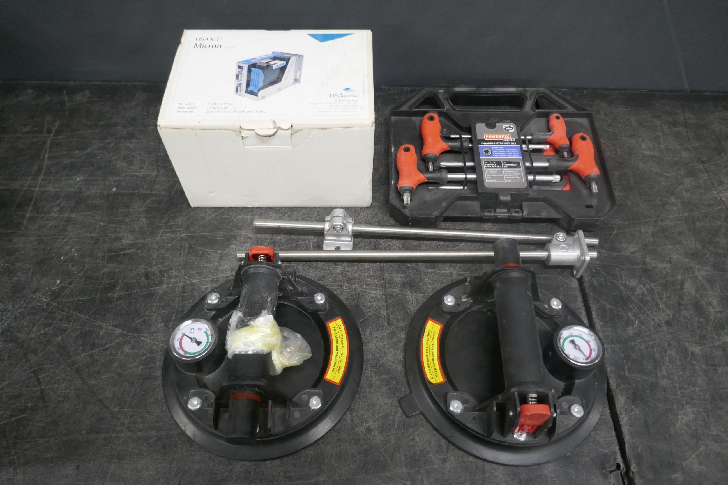 A Powerfix 8 piece X-handle star key set, (T10-T50), a pair of 8 inch vacuum pads, HSA Jet Micron industrial barcode printer, boxed