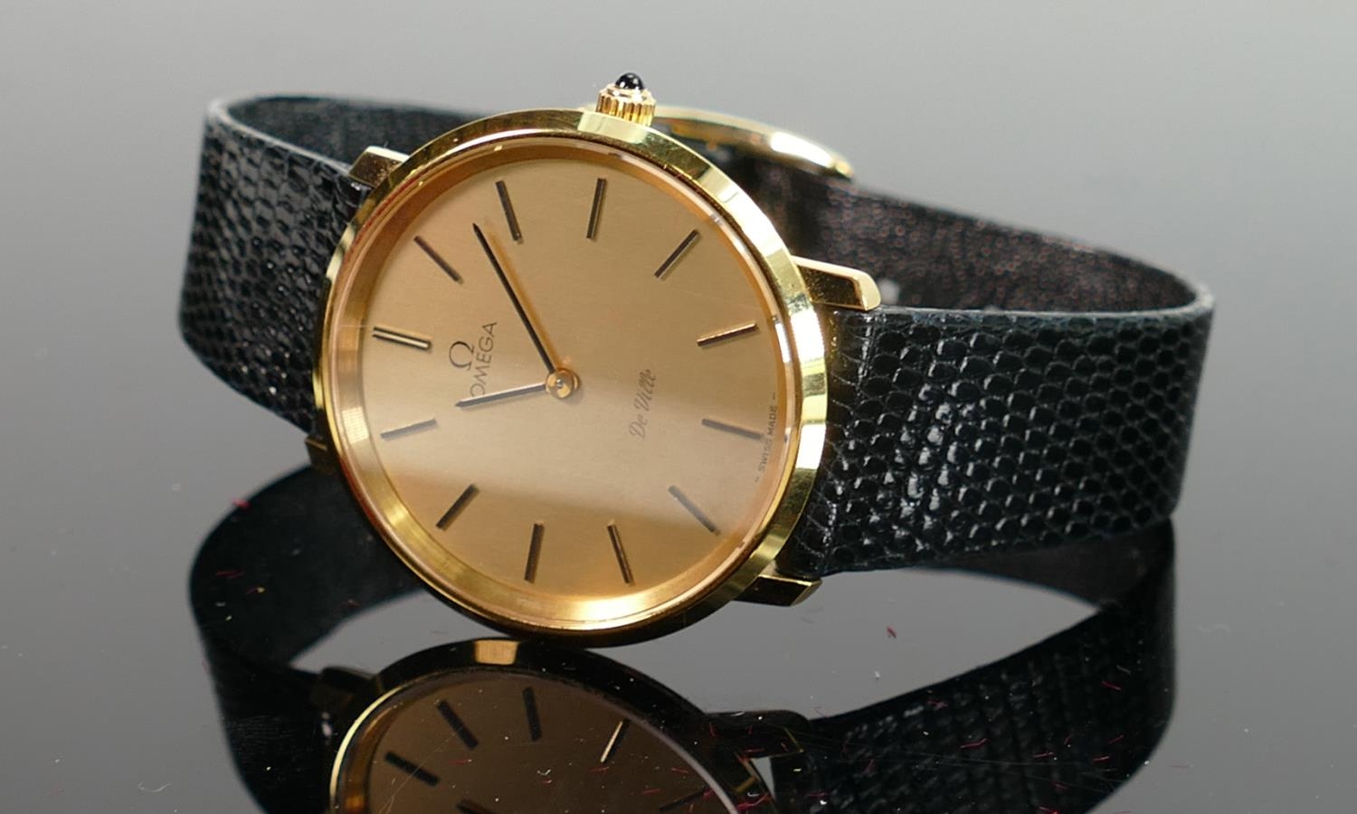 Omega de Ville wristwatch: Gentlemans 20m gold & steel wristwatch, leather strap with original box.