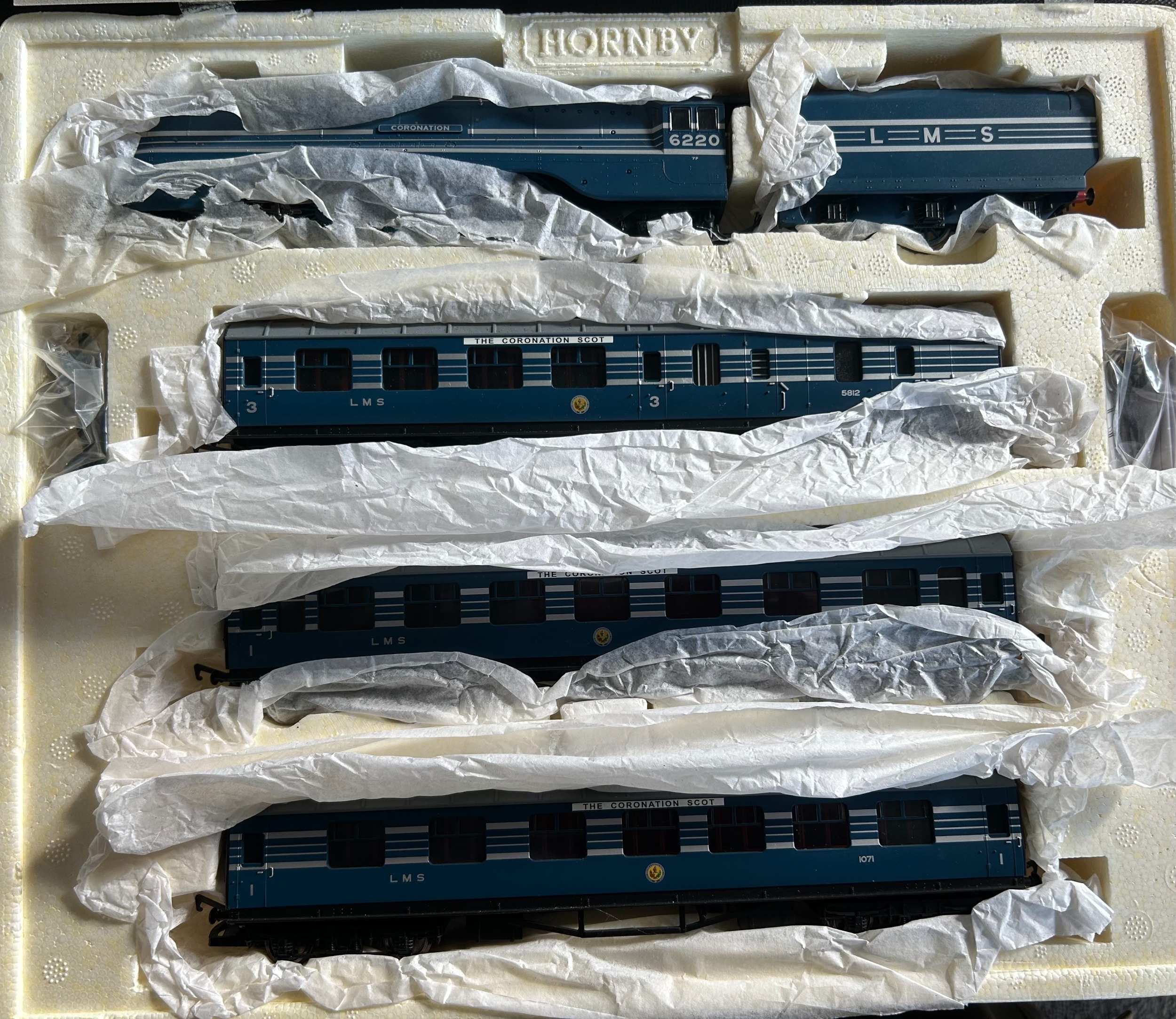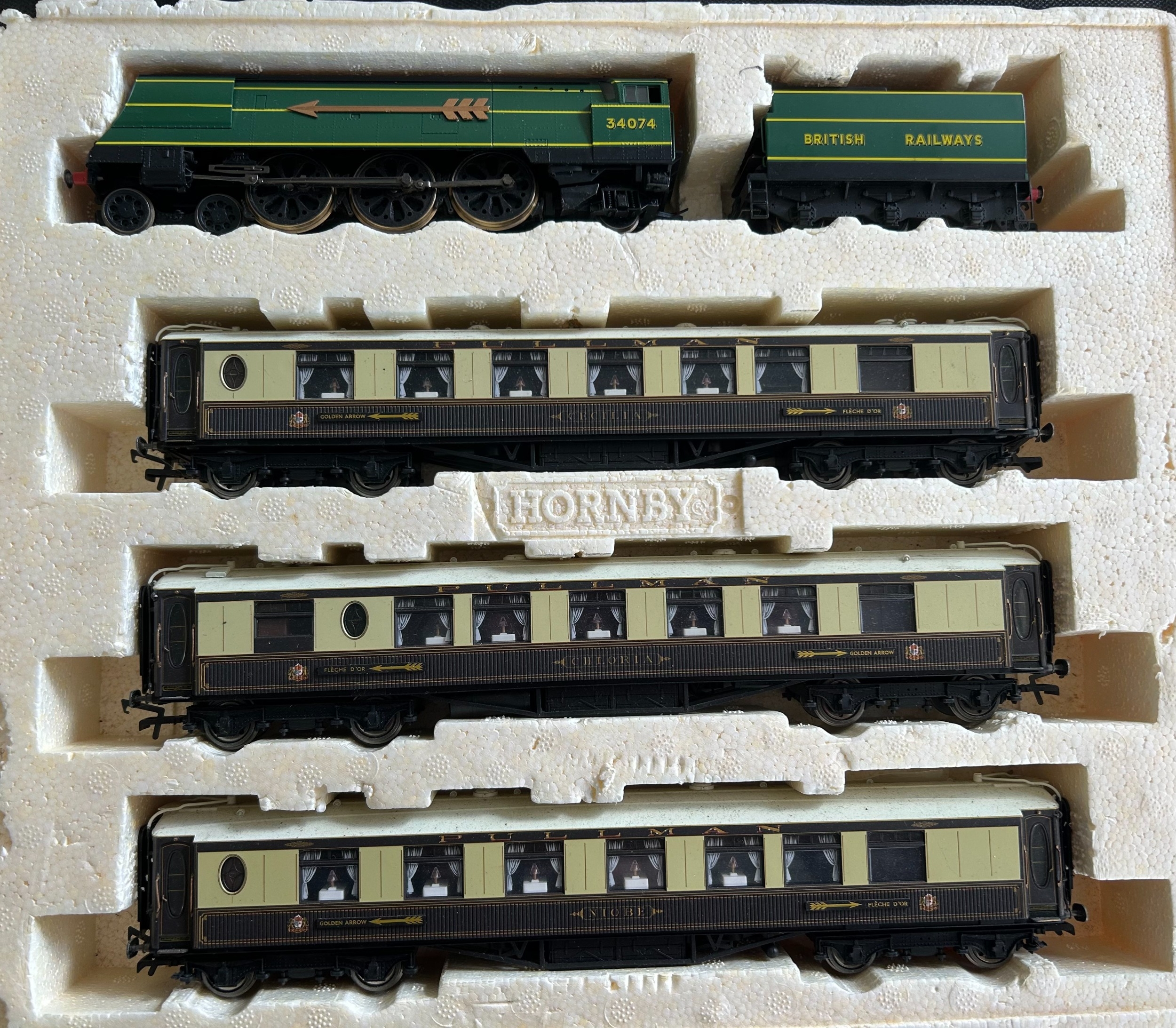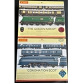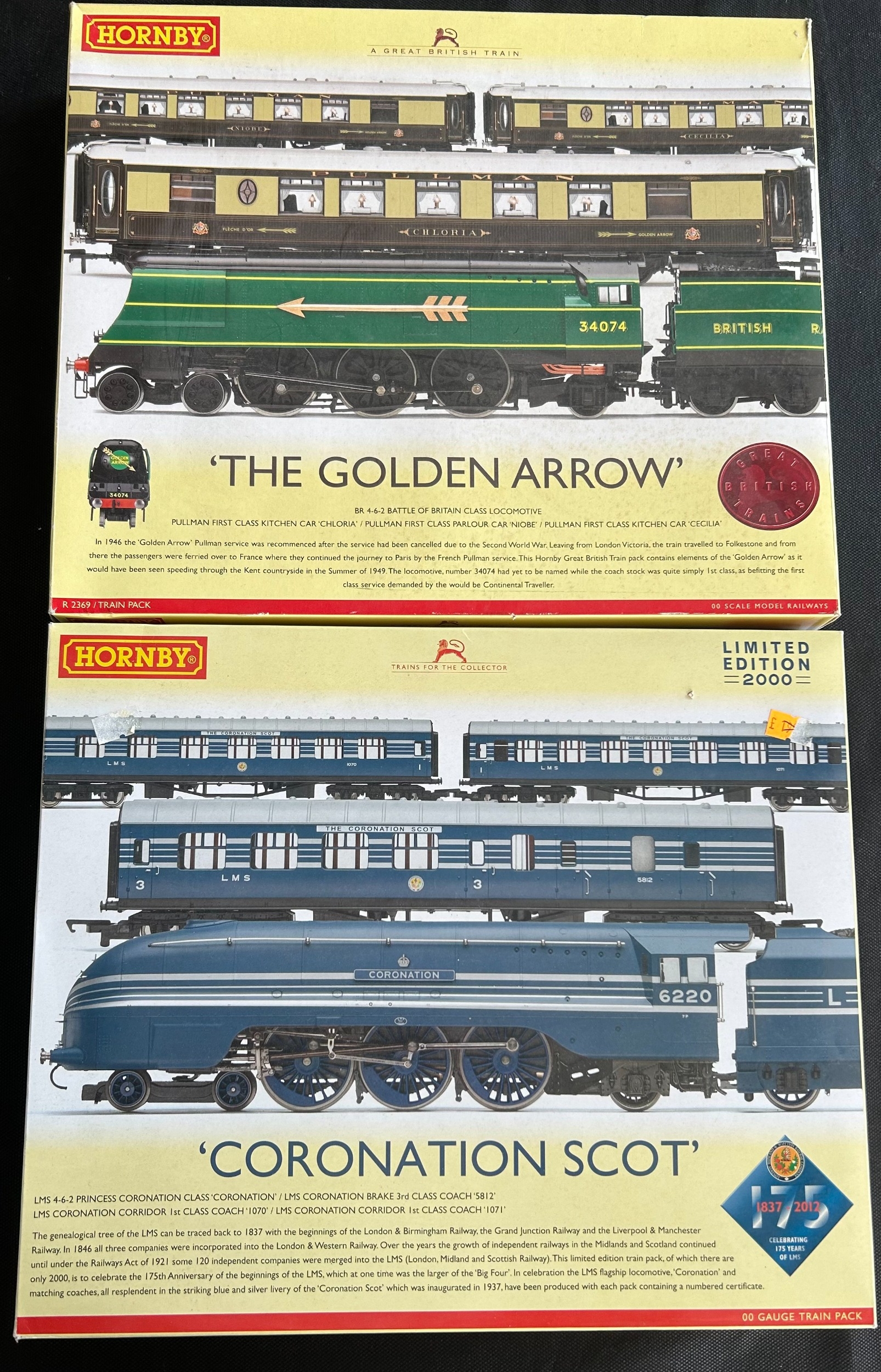 2 Hornby OO Train Packs. Coronation Scot (R.3092). Comprising 4-6-2 tender locomotive 'Coronation' 6220, plus 3 corridor coaches. Together with a Golden Arrow 2369. Comprising Battle of Britain Class tender locomotive 34074, plus 3 Pullman Cars, 'Niobe', 'Cecilia' and 'Chloria'. Both boxed, cleaning required. One internal packing piece worn and damaged. Contents VGC-Mint.