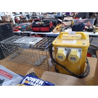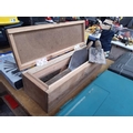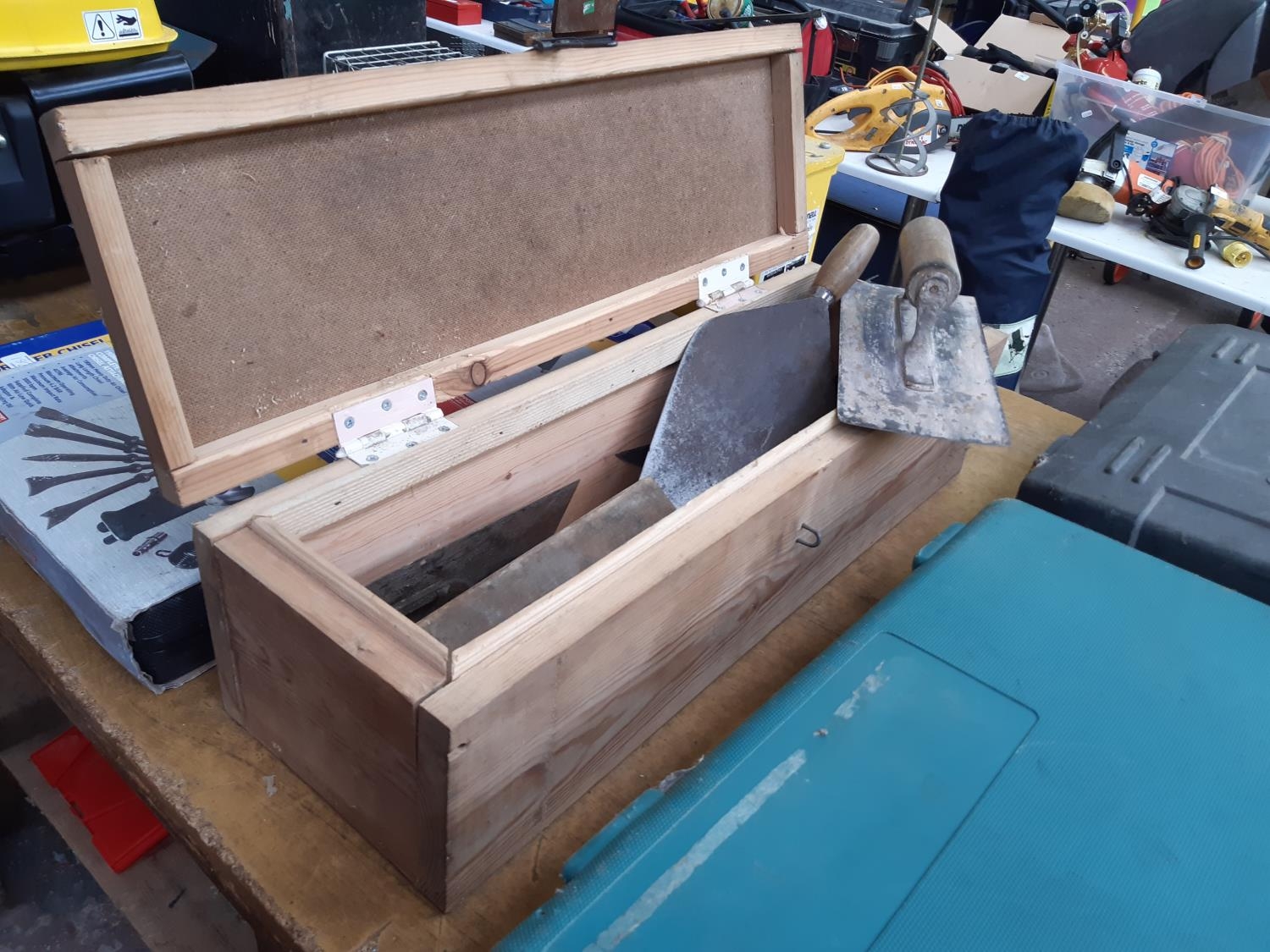 A WOODEN BOX CONTAINING PLASTERERS FLOATS, BRICK TROWEL, POINTING TROWEL, STONE CHISELS ETC.