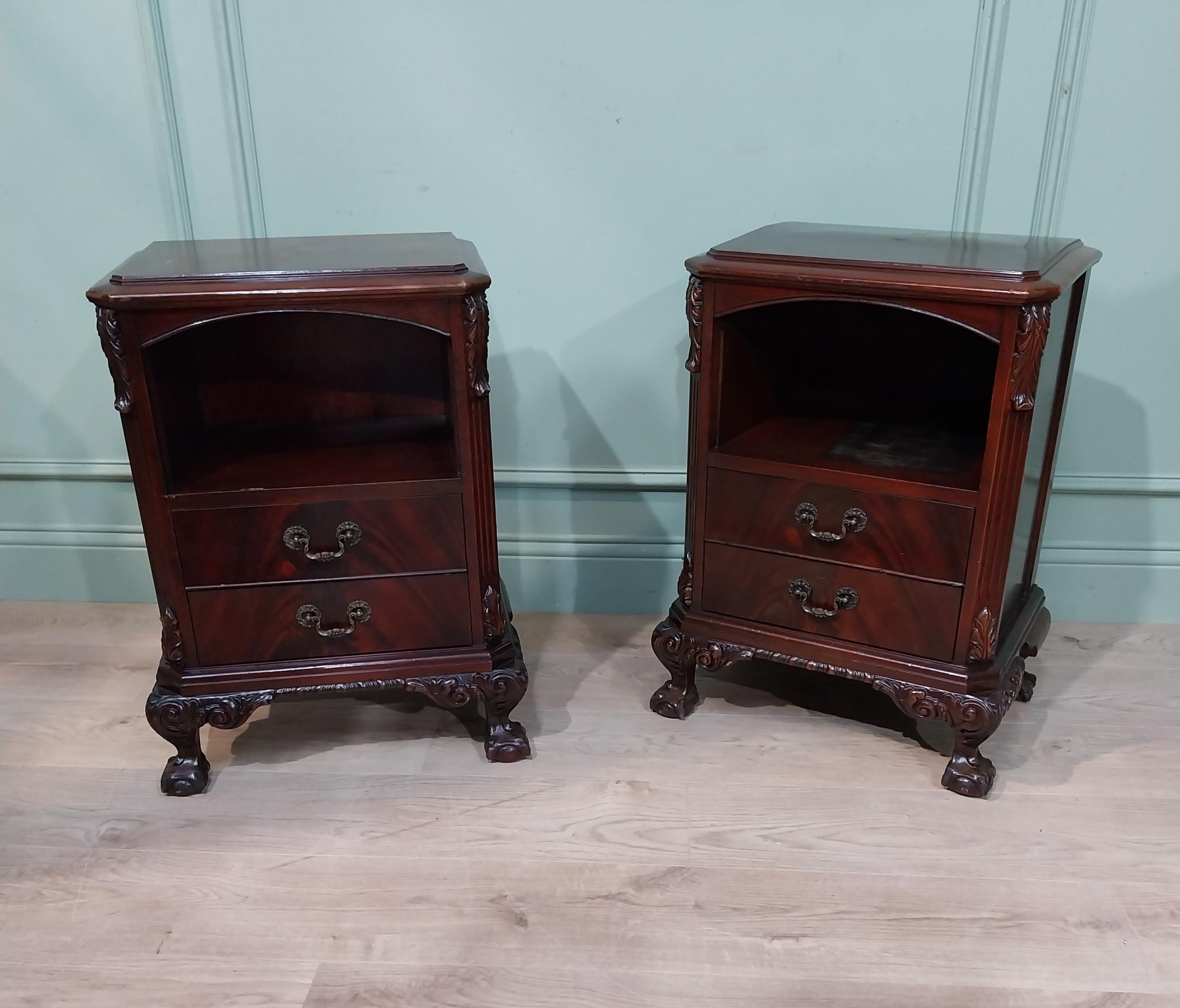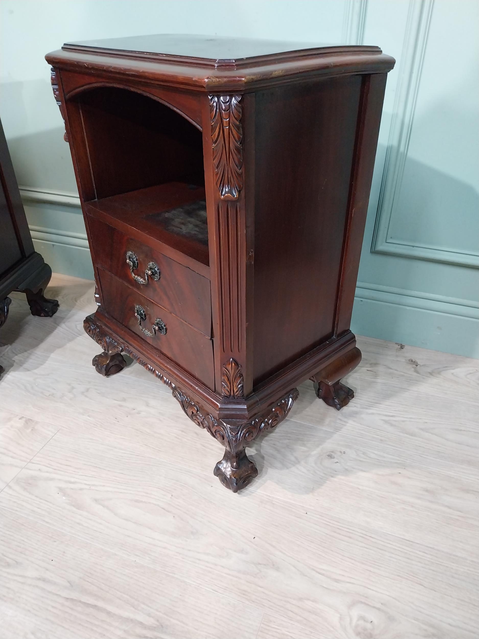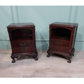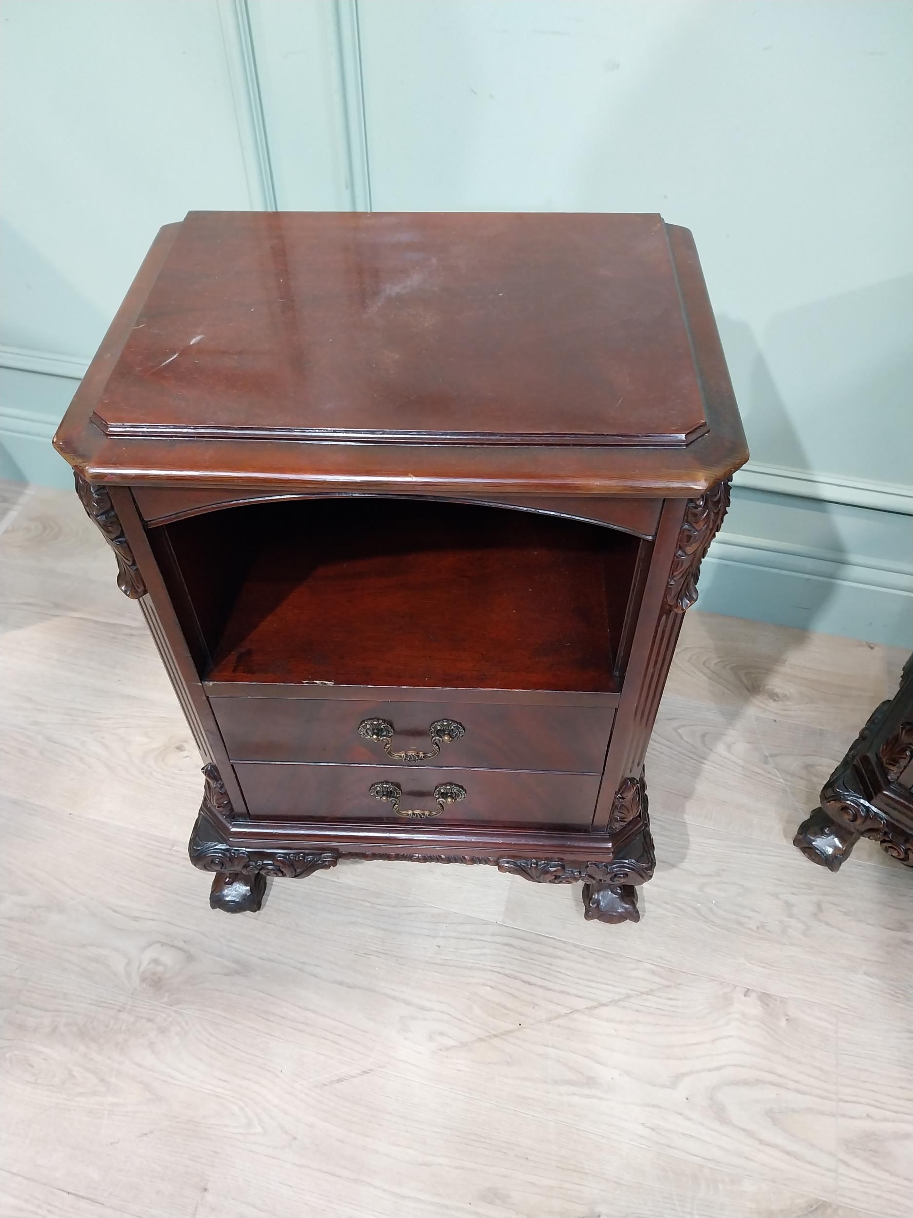 Pair of carved mahogany bedside cabinets in the Victorian manner. {67 cm H x 52 cm W x 35 cm D}.