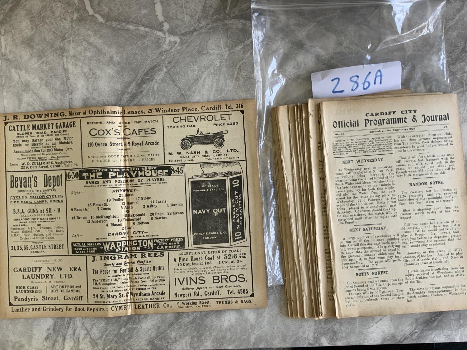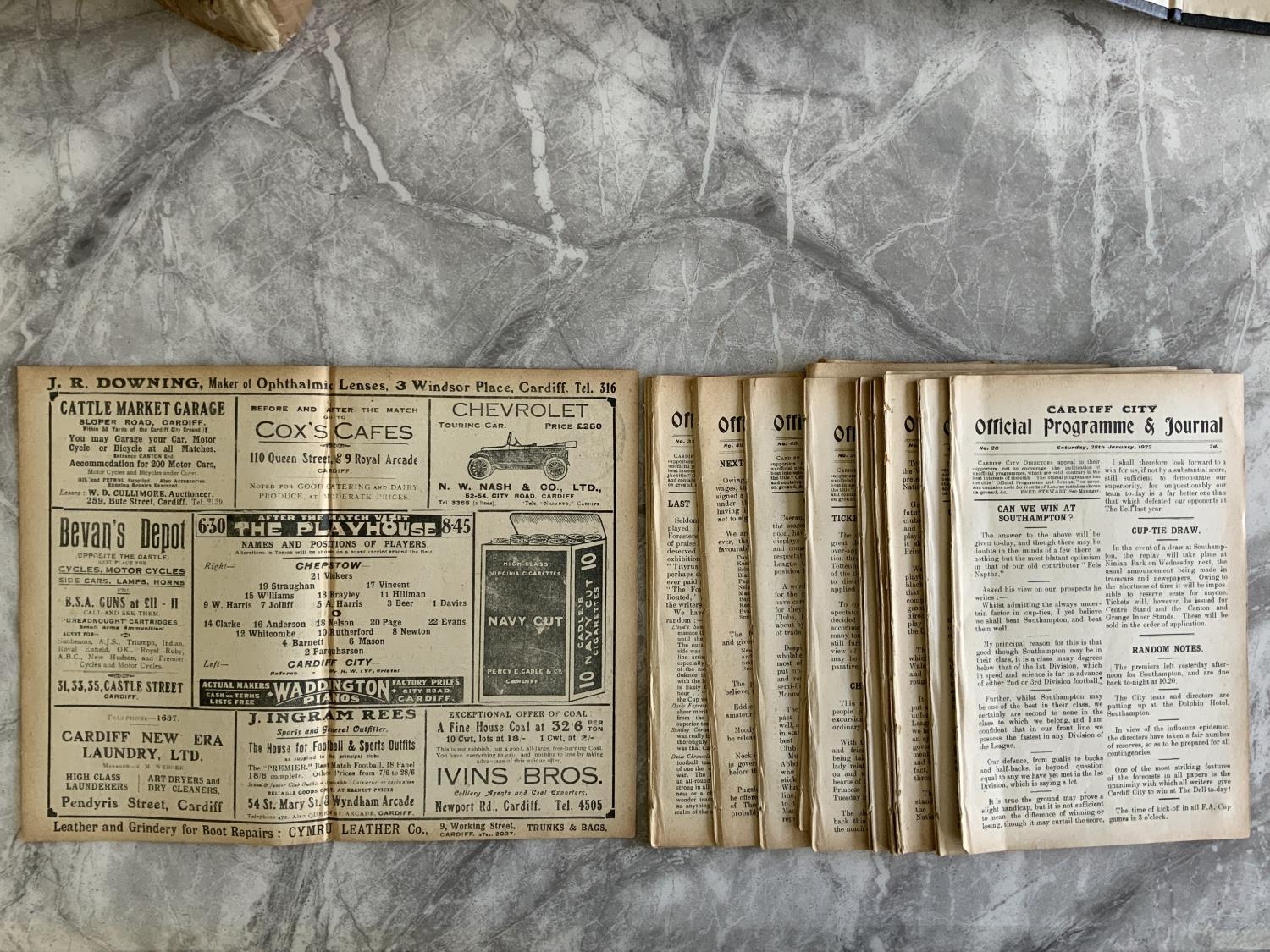 1921/1922 Cardiff City Home Welsh League Football Programmes: Reserve league and cup to include Rhymney Merthyr Town Bridgend Chepstow Mardy Pontypridd Aberaman and Ton Pentre. All ex bound volume with no covers. (19)
