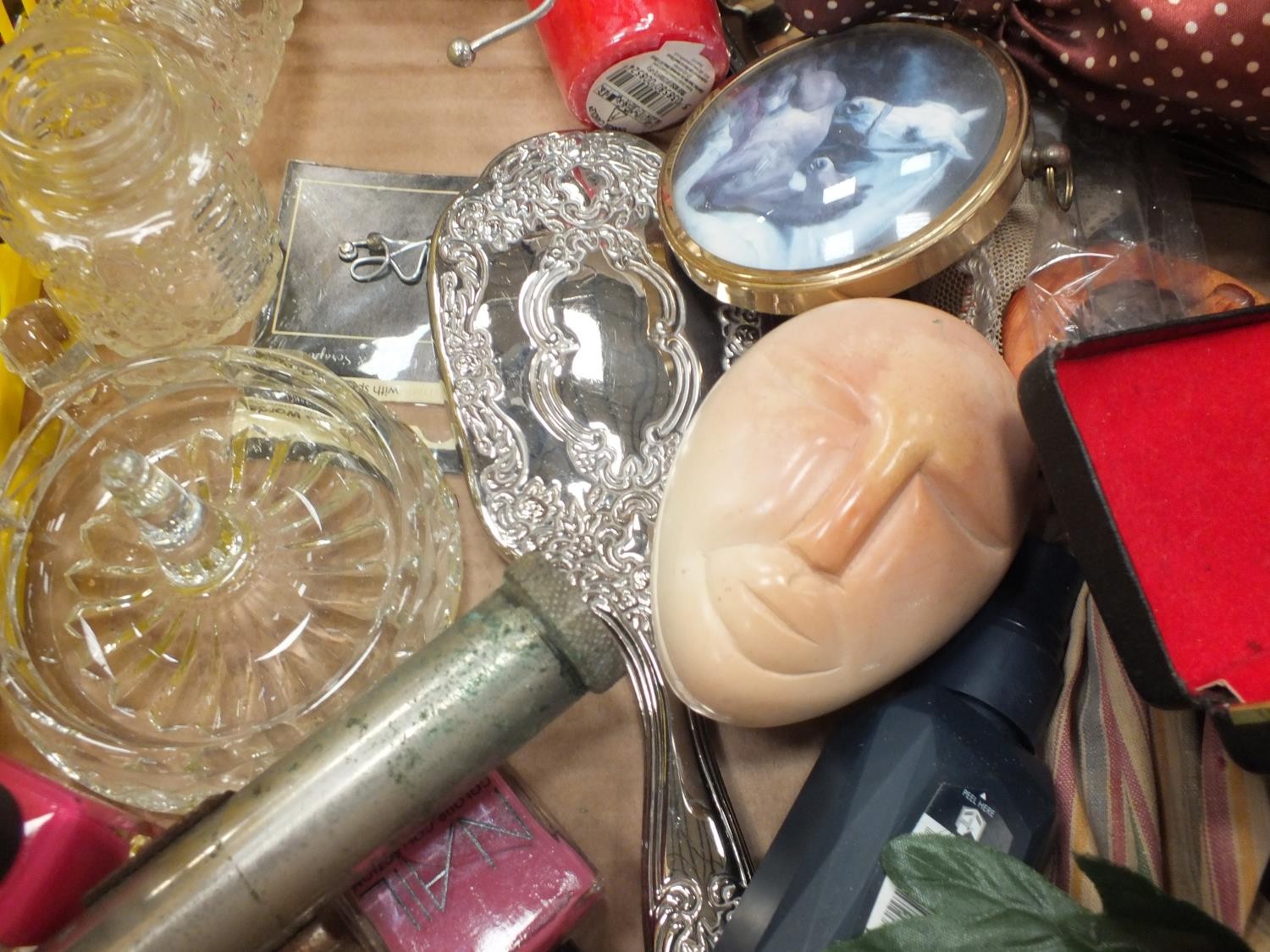 BOX OF MISC VINTAGE ITEMS INCLUDES BRASS WEIGHT SET ETC