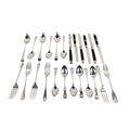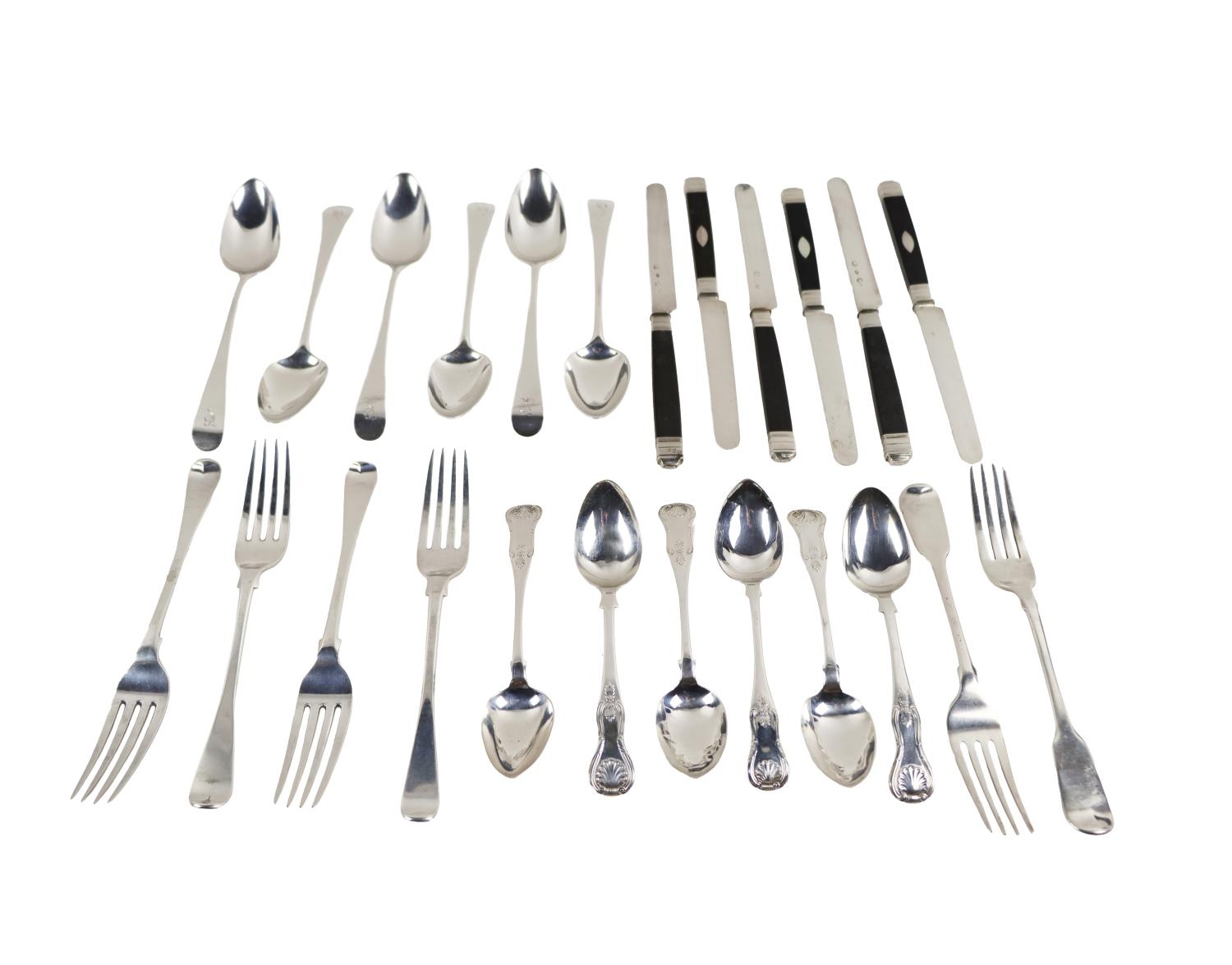 Silverware: A set of four early 19th Century English silver Forks, London, William Eaton, 1832, approx. 5.8 ounces; two William IV English Forks, London, John & Henry Lias, 1837, approx. 2.7 ounces; a set of 6 - 19th Century English silver Dessert Spoons, with engraved initials, London Thomas Wallis II, 1830, approx. 6.5 ounces; a set of 6 - Kings pattern Scottish Teaspoons (Matched) Glasgow, Davis McDonald, 1870 and Edinburgh, George Bell, approx. 3.4 ounces; a set of 6 - early 19th Century French ebony handles and silver blade Fruit Knives, by G. Fuchs & G.B., as a lot. (1)