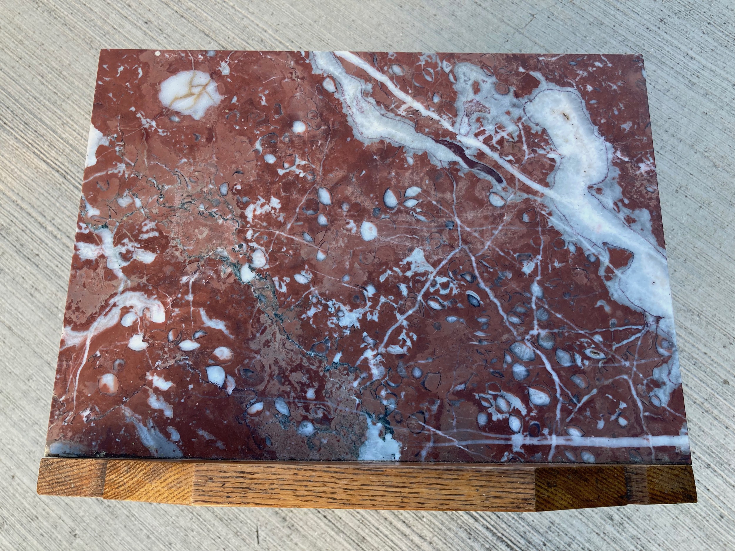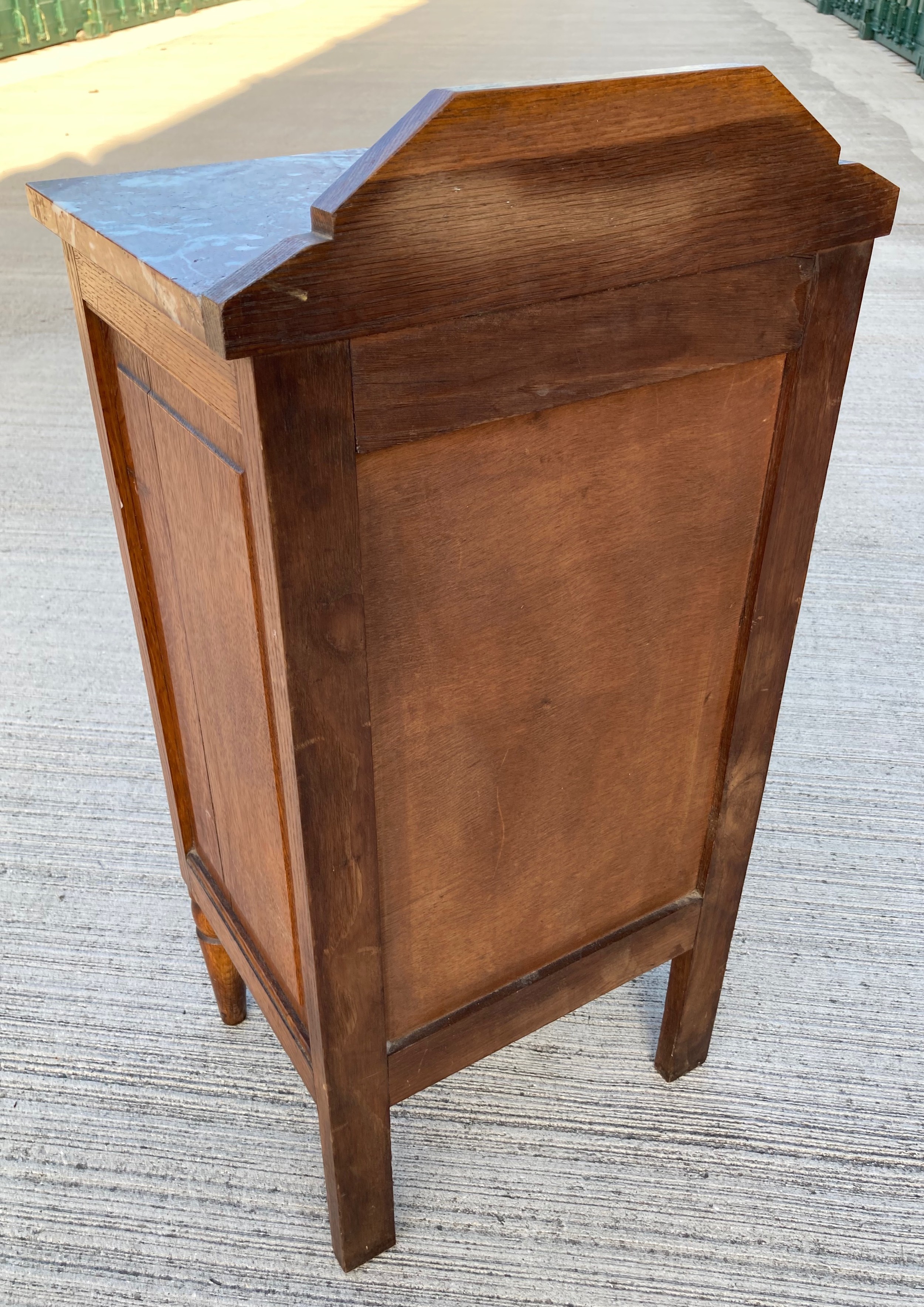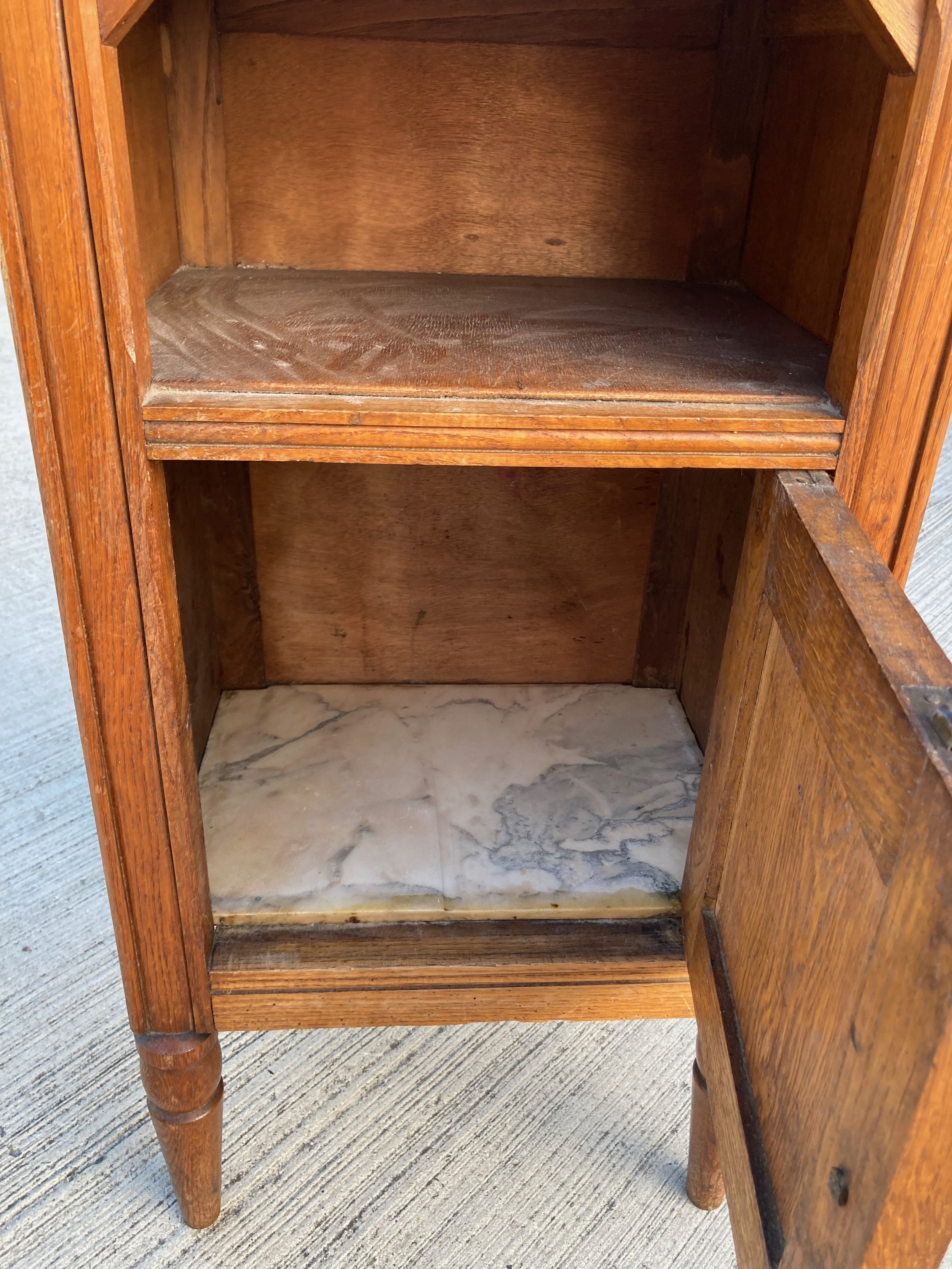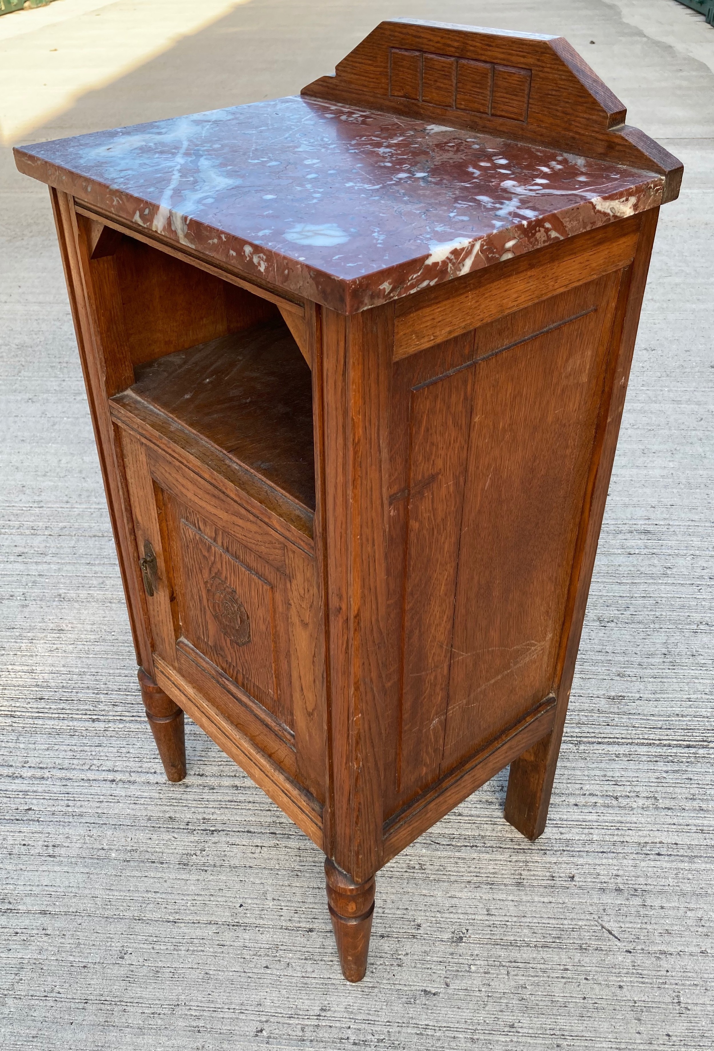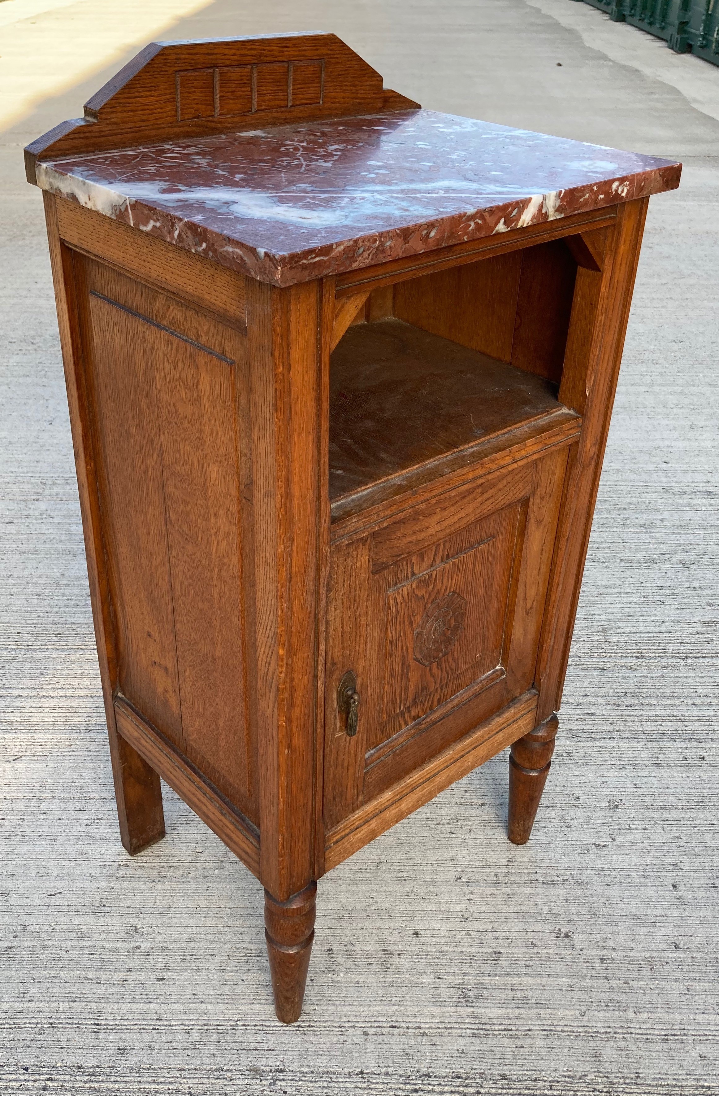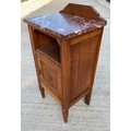 French mid century furniture, marble topped bedroom cabinet, cupboard has a marble line with open storage above and a pink marble top.