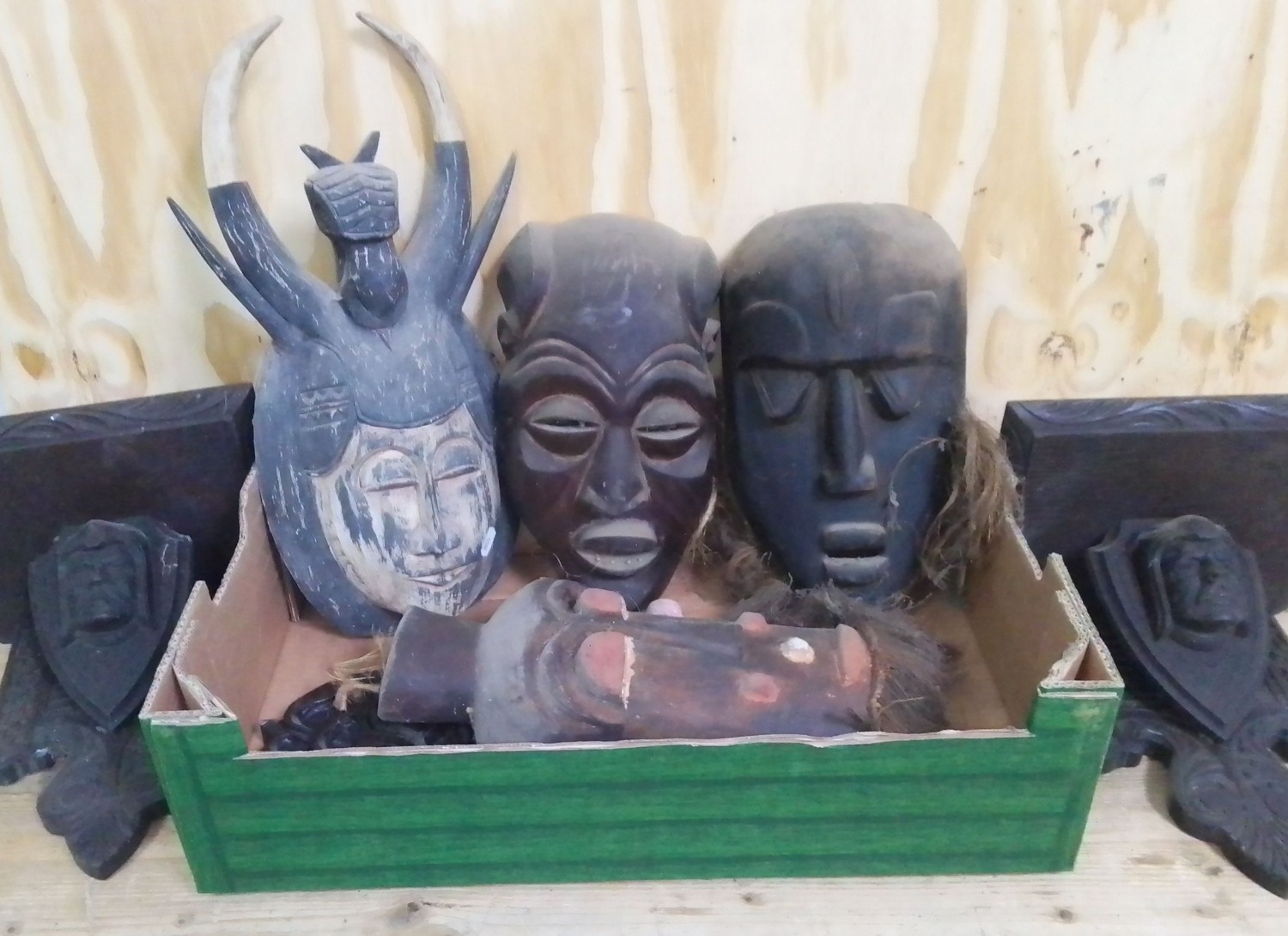 A box of assorted wooden masks and a pair of brackets.