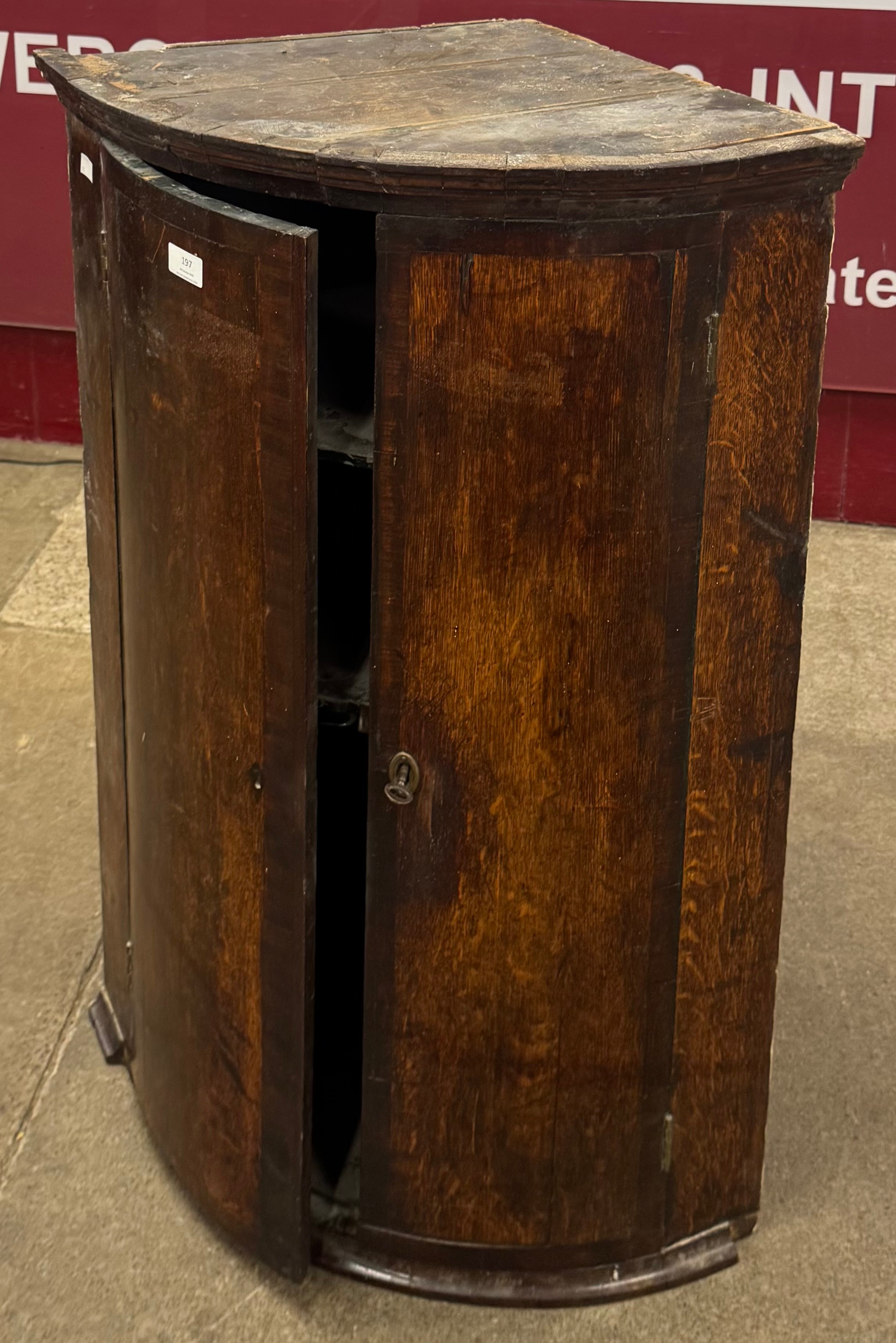 A George III oak bowfront two door wall hanging corner cabinet