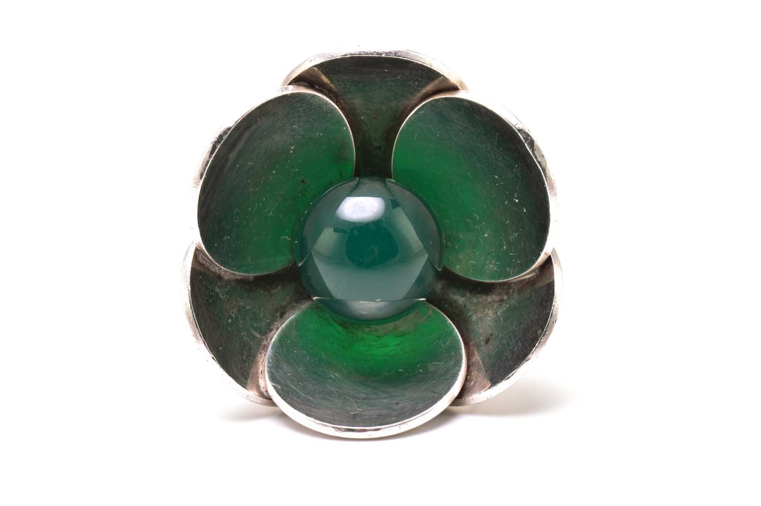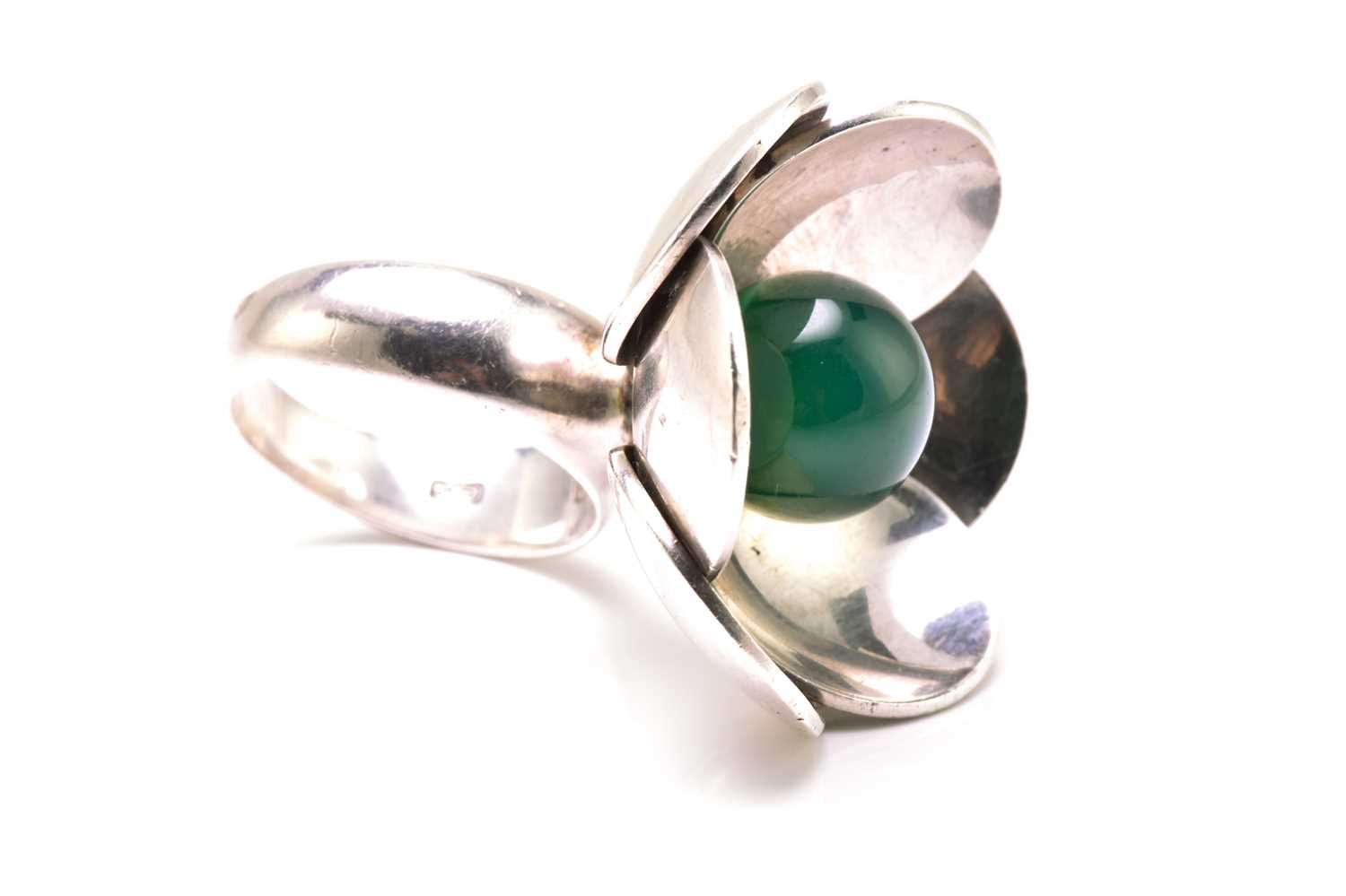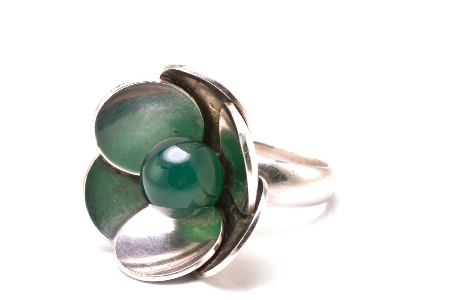 Georg Jensen - a silver flower ring with chrysoprase, with a chrysoprase bead set in a flowerhead mount, to a plain D-profile shank, designed by Nanna Ditzel, No. 202, post-1945 maker's mark, ND maker's mark, British import marks, dated 1977, ring size P, head measuring 3.1 cm across, total weight of item 23.3 grams.