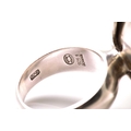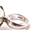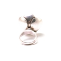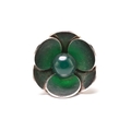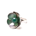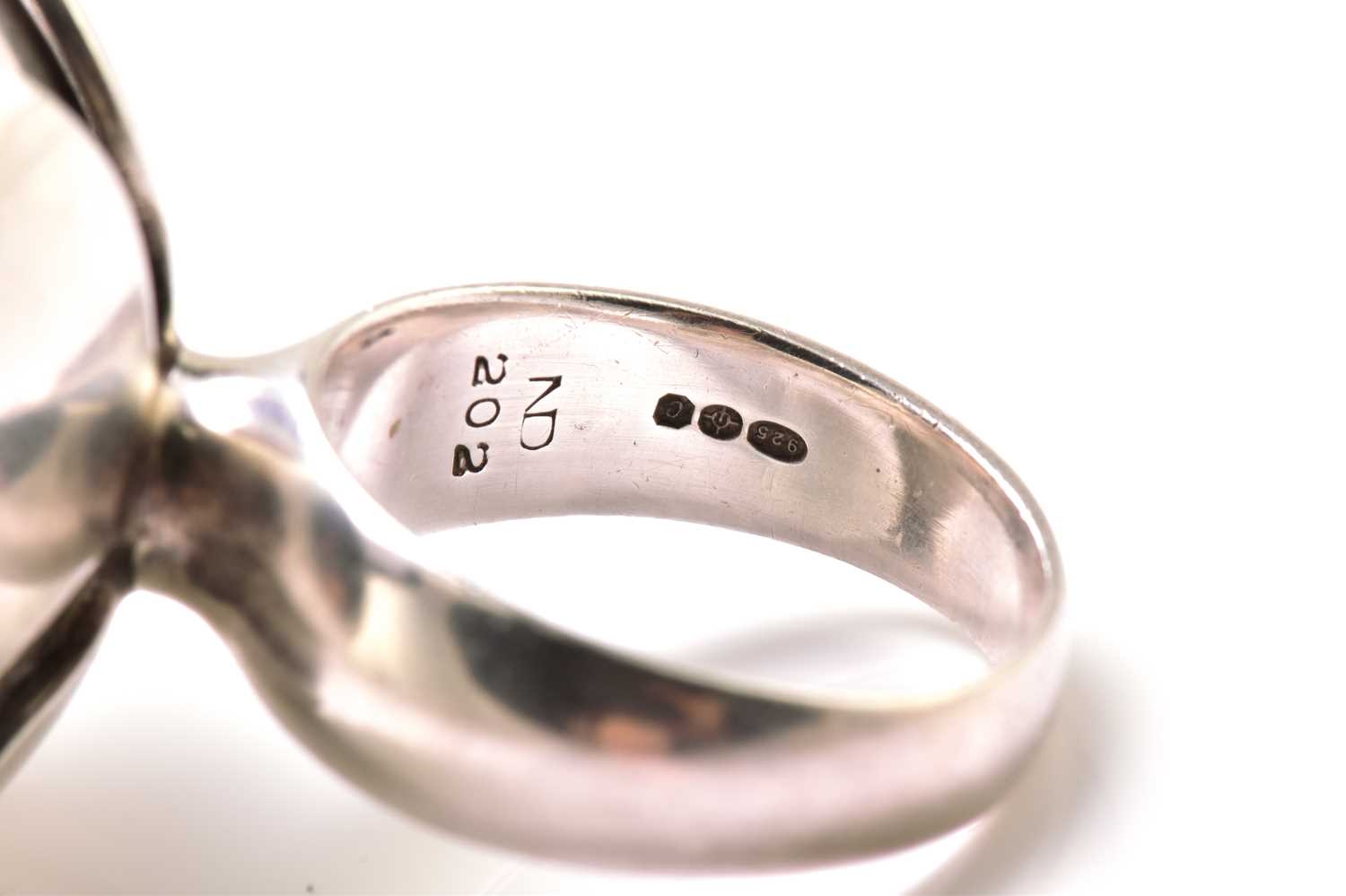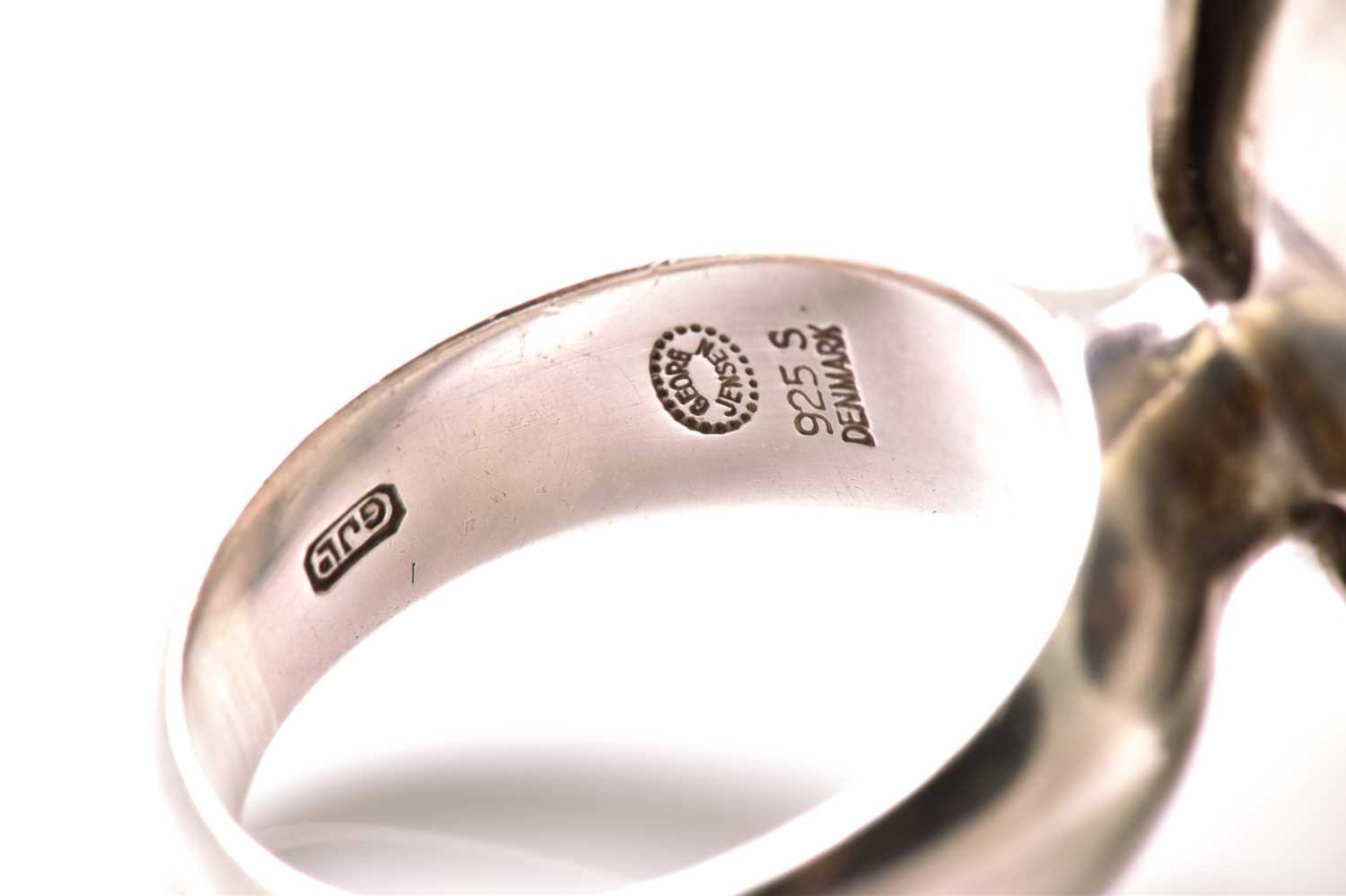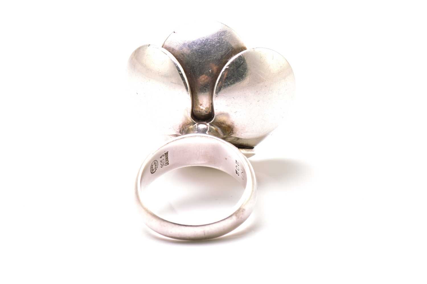 Georg Jensen - a silver flower ring with chrysoprase, with a chrysoprase bead set in a flowerhead mount, to a plain D-profile shank, designed by Nanna Ditzel, No. 202, post-1945 maker's mark, ND maker's mark, British import marks, dated 1977, ring size P, head measuring 3.1 cm across, total weight of item 23.3 grams.