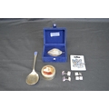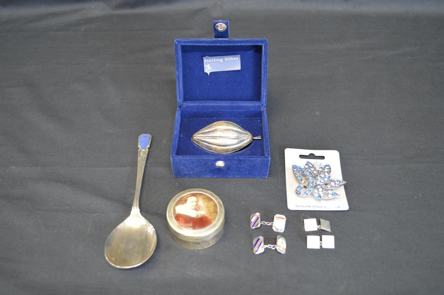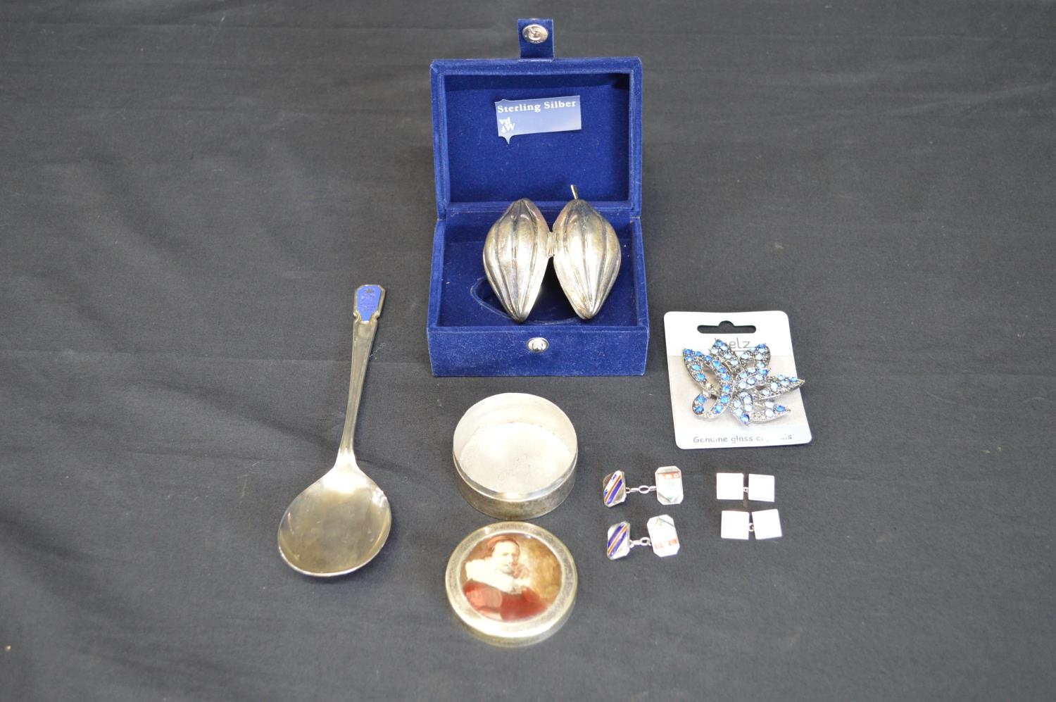 Quantity of sundry items to include: silver cocoa pod trinket box with engraving, silverplated Jubilee spoon, brooch, circular trinket box, pair of silver cufflinks and pair of base metal cufflinks
