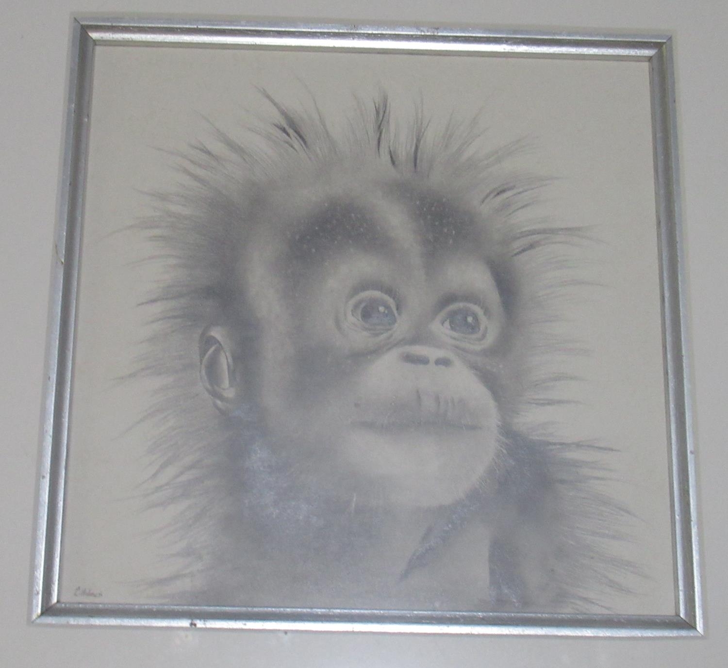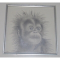 Lisa-Anne Holmes, "Baby Orangutan" , signed, pencil.18x18cm approx. Framed and glazed.