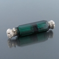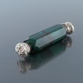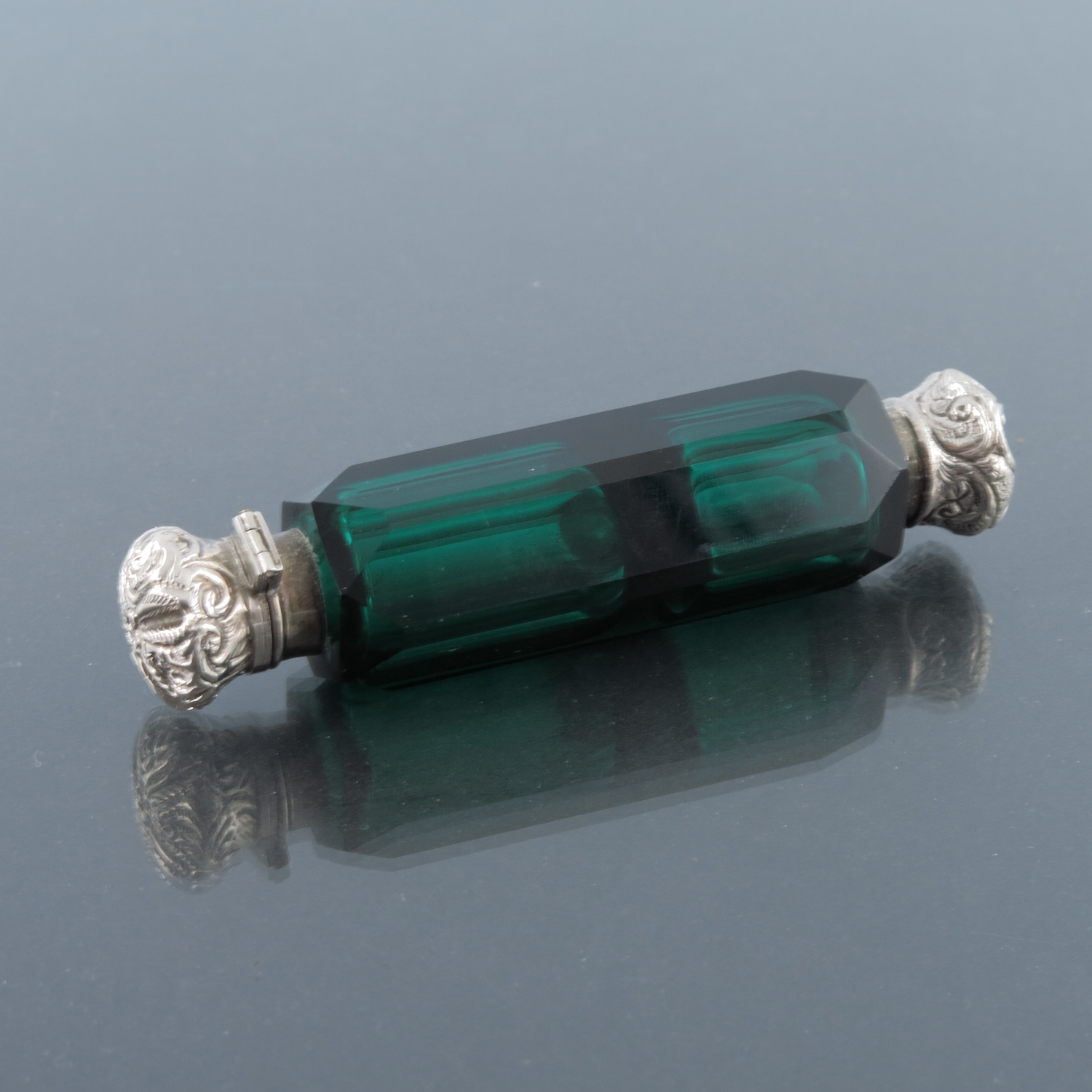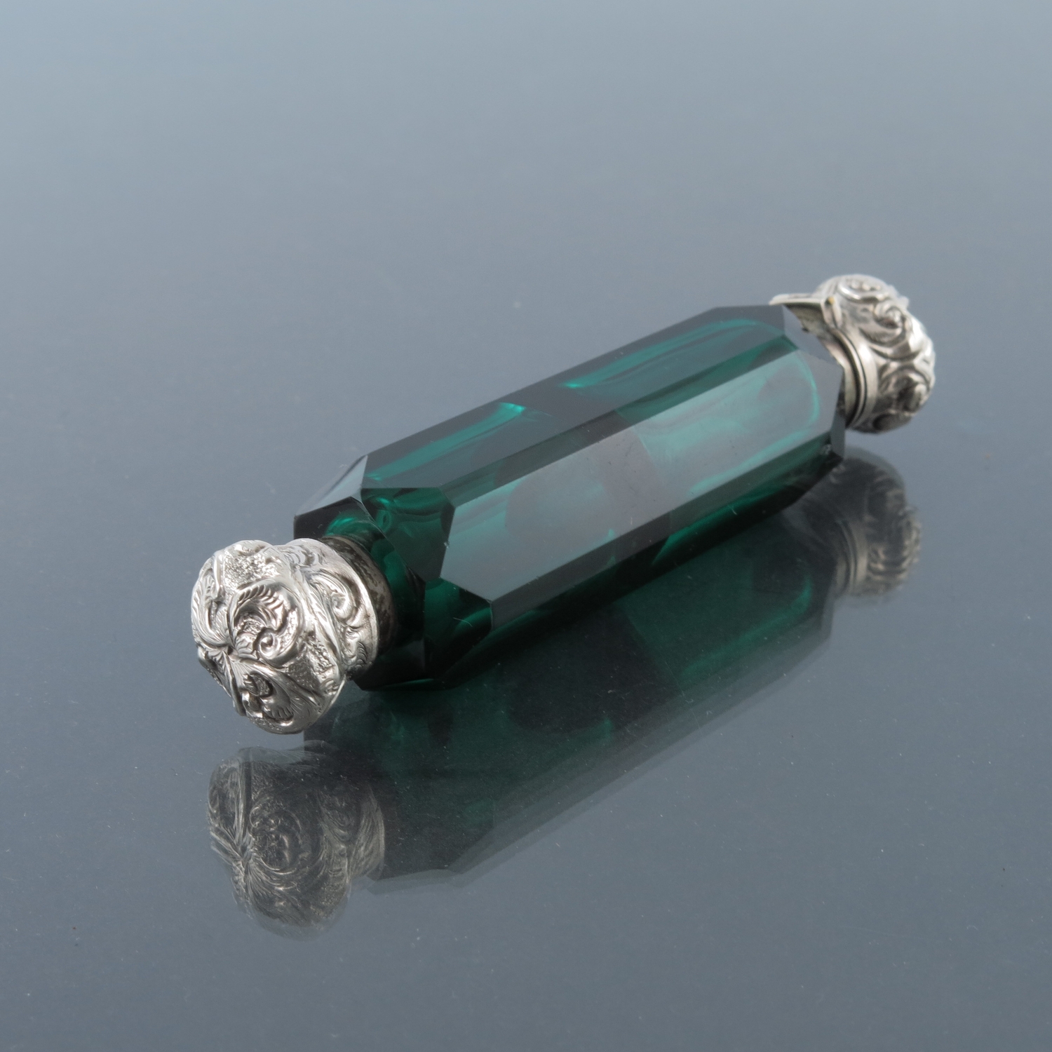 A Victorian silver and green glass double ended scent bottle, hexagonal section faceted body with screw and hinge caps, embossed and chased foliate scroll decoration, 10cm long