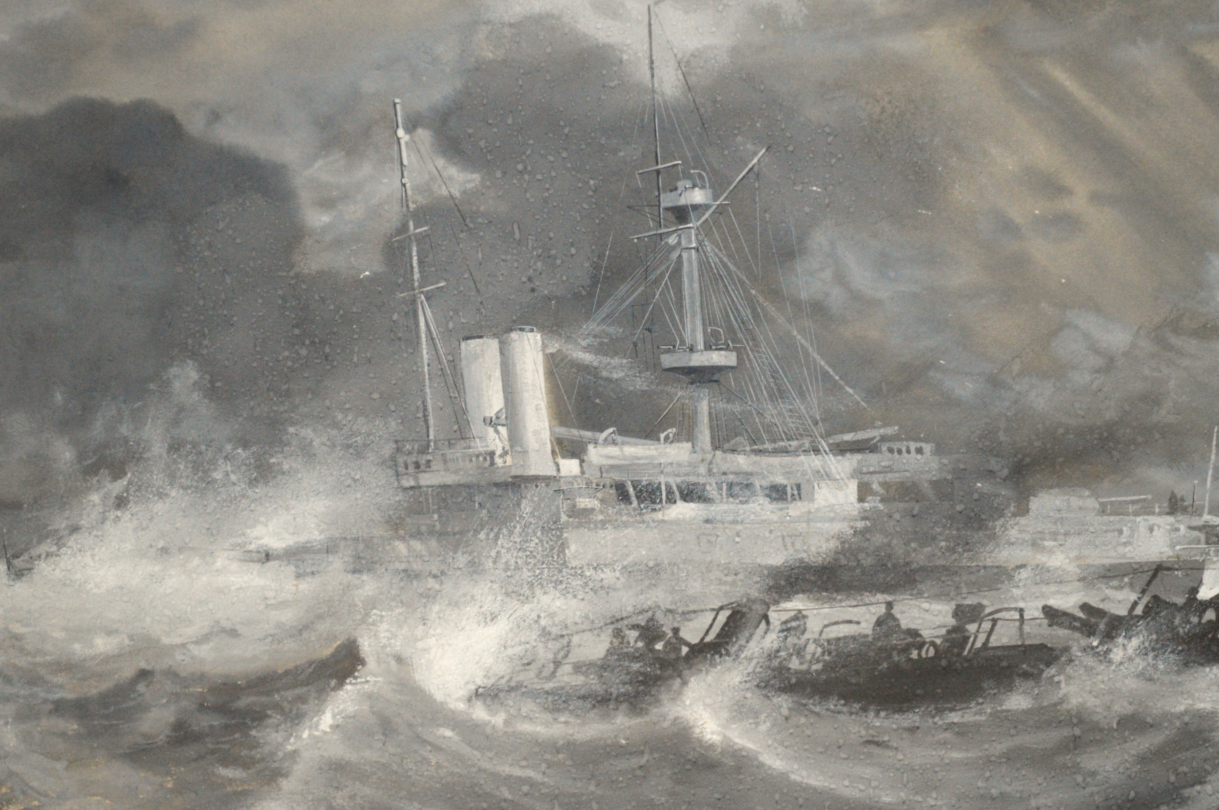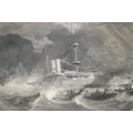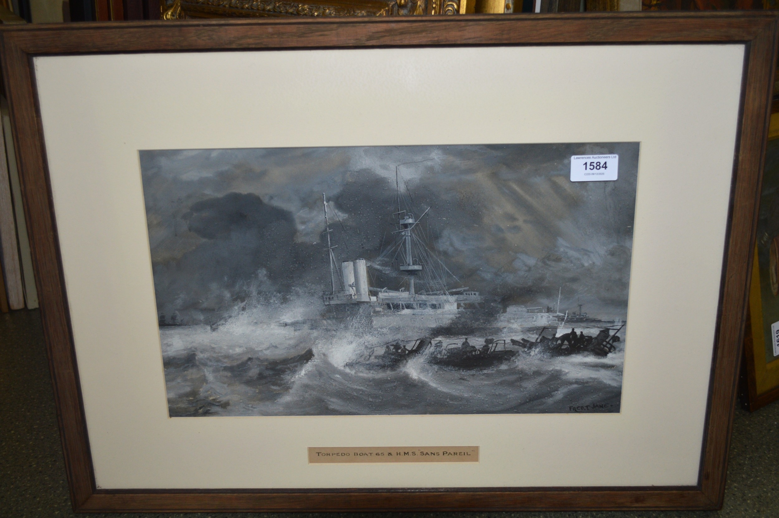 Frederick T Jane, gouache painting, maritime scene, inscribed ' Torpedo Boat 65 and HMS Sans Pareil ', signed, 24 x 40cm