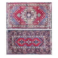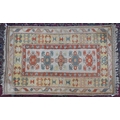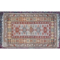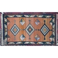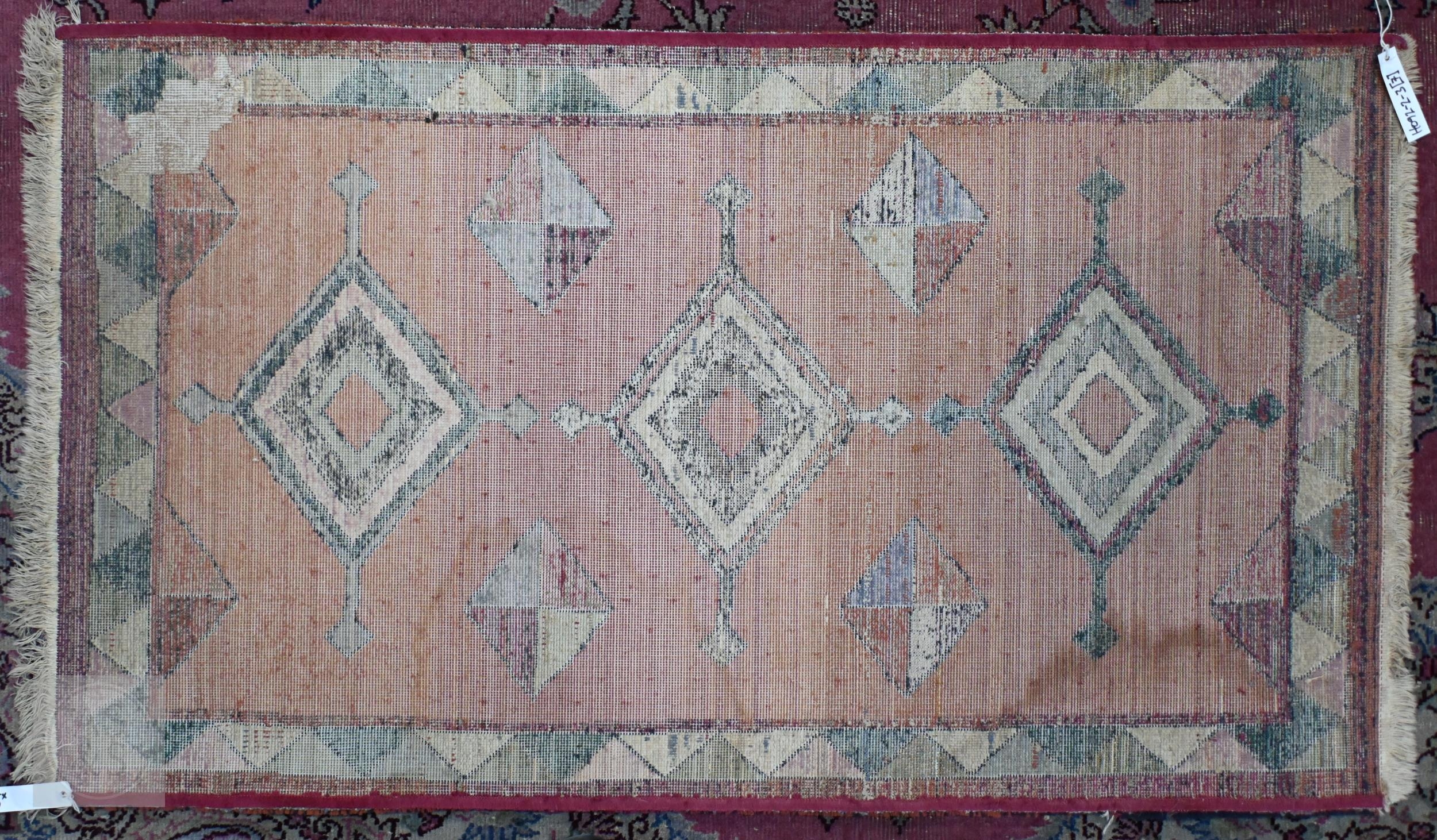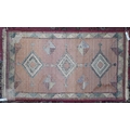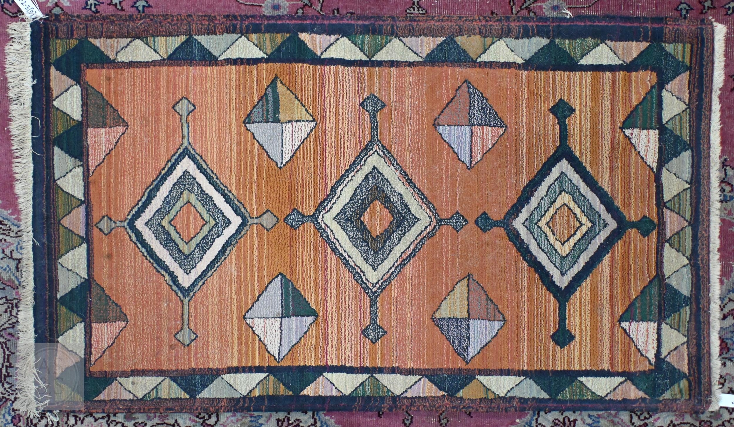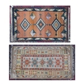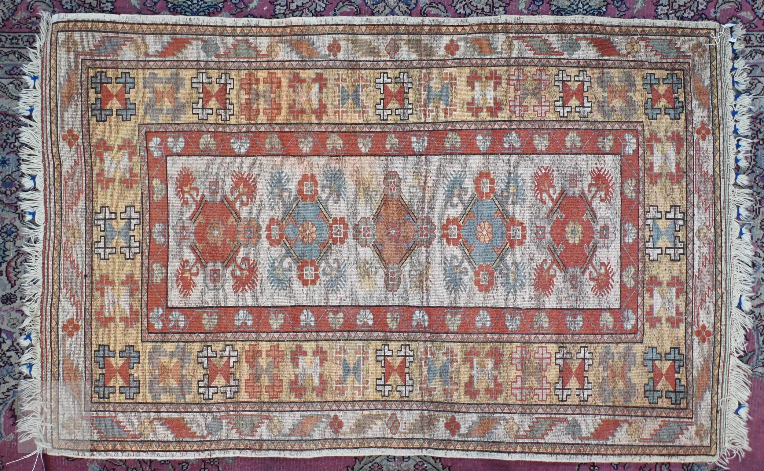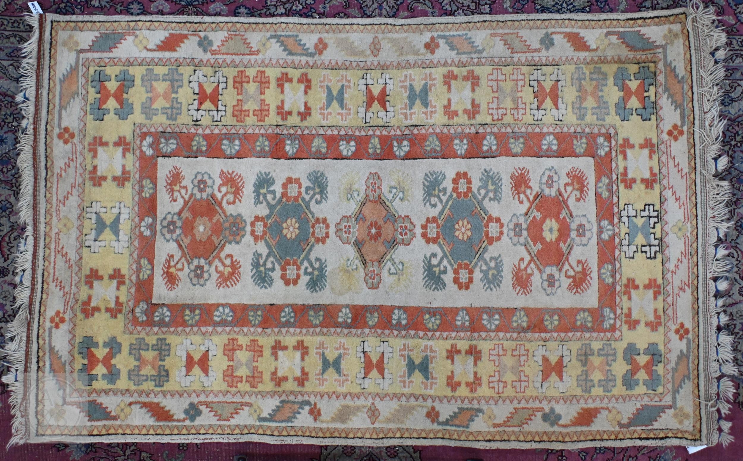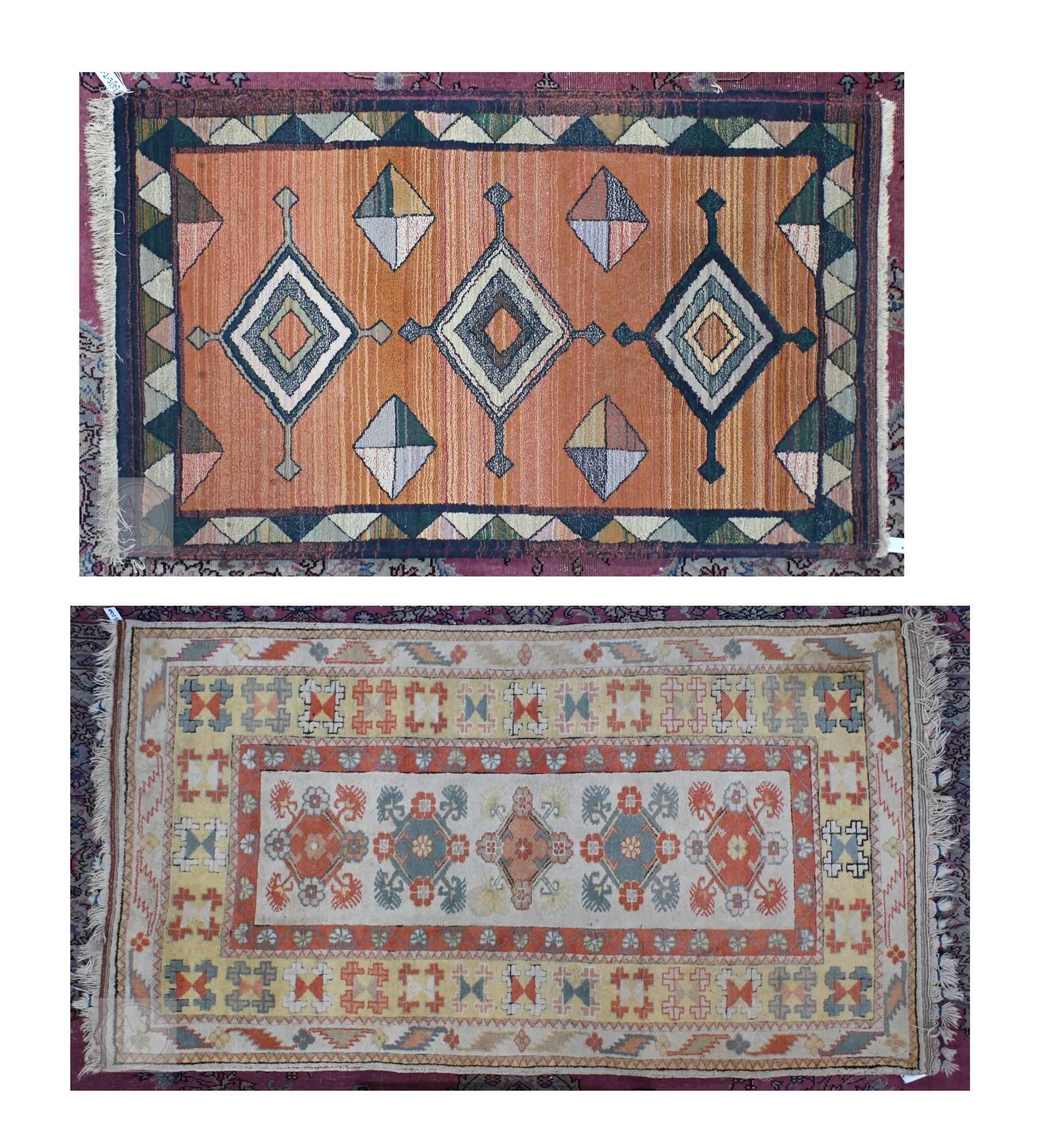A Turkish Milas cream ground rug with floral diamond medallions and yellow border, 182 x 121 cm to/w another Turkish geometric rug on terracotta ground, 137 x 80 cm (2)