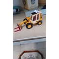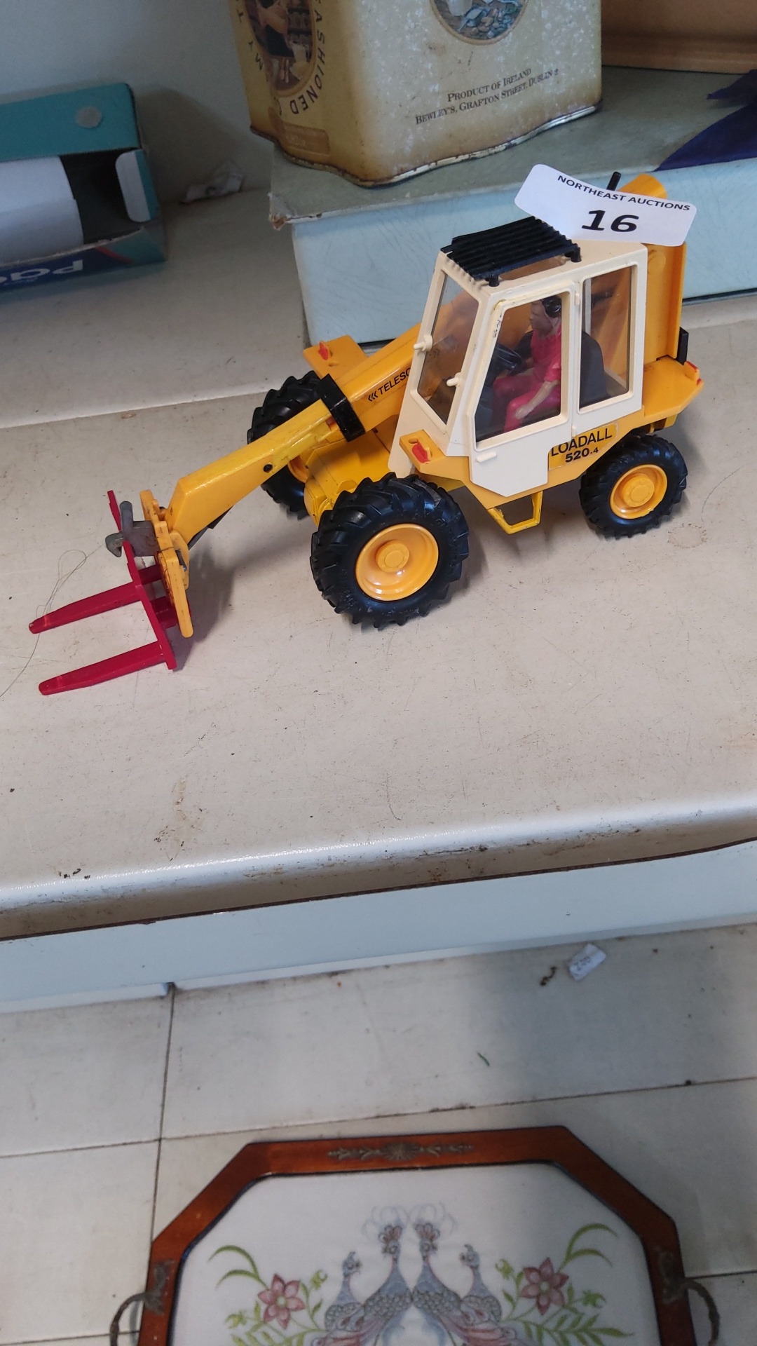 A toy construction vehicle model, a Telescopic Loadall 520-4 articulated loader in yellow and white plastic, with glazed cab and driver figure, fitted front fork attachment and four rubber tyres.