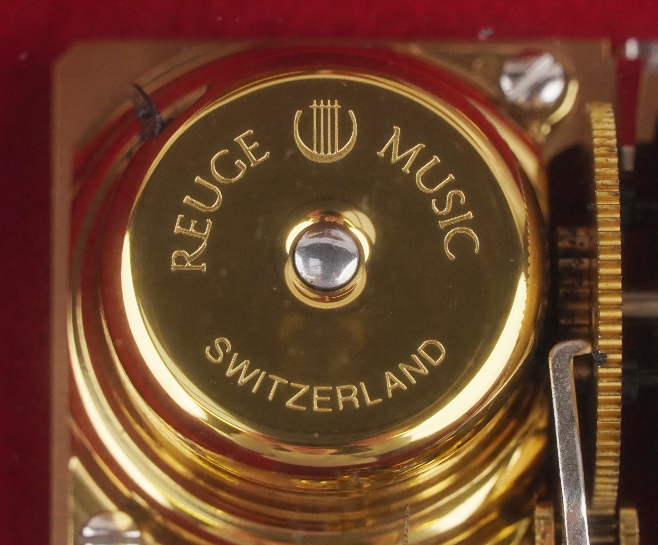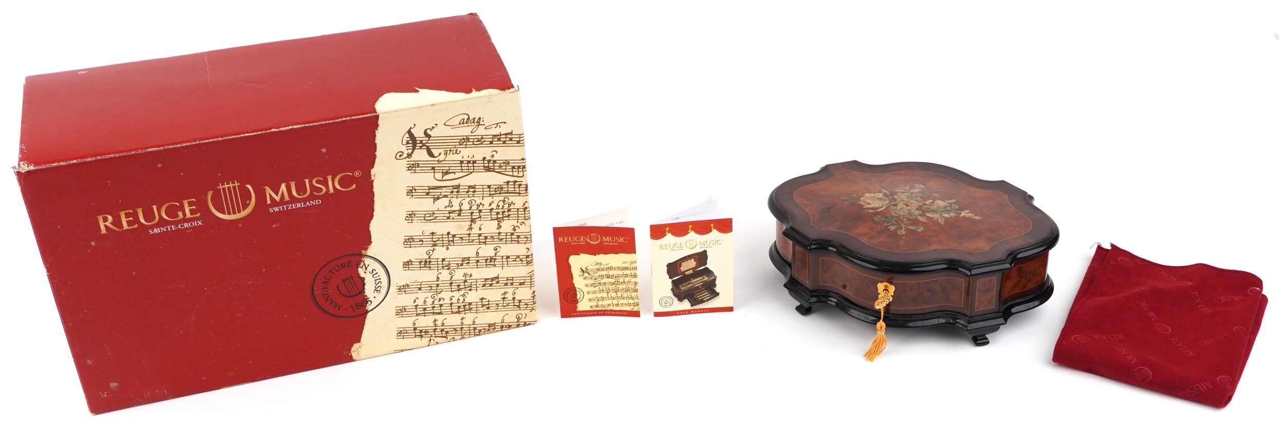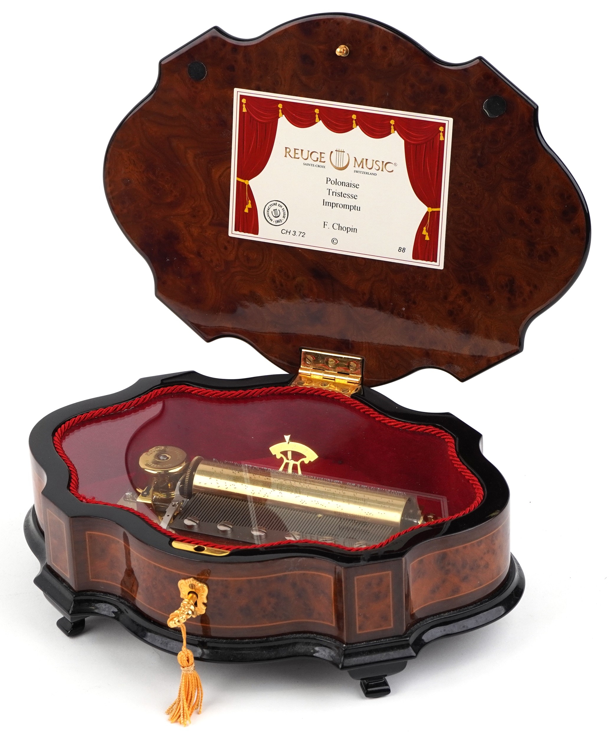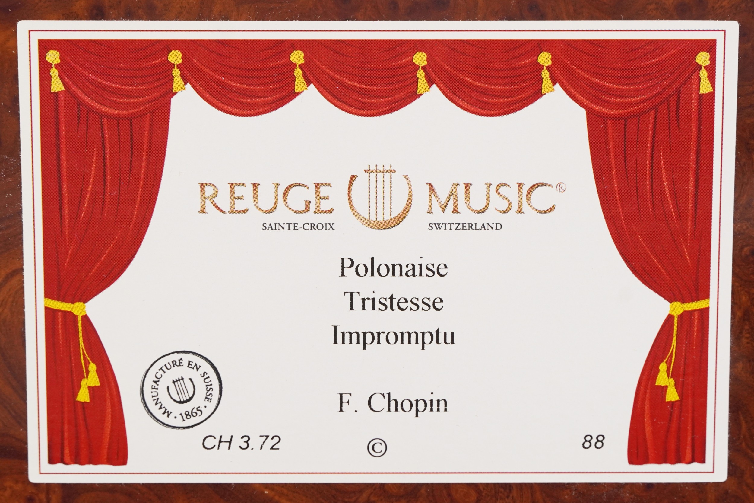 A Reuge Music rosewood and burr walnut mechanical music box playing F Chopin, 11cm high x 27cm wide with box and certificate.
