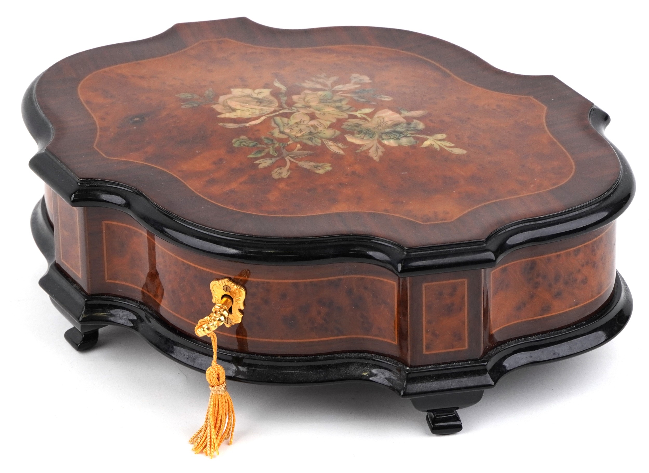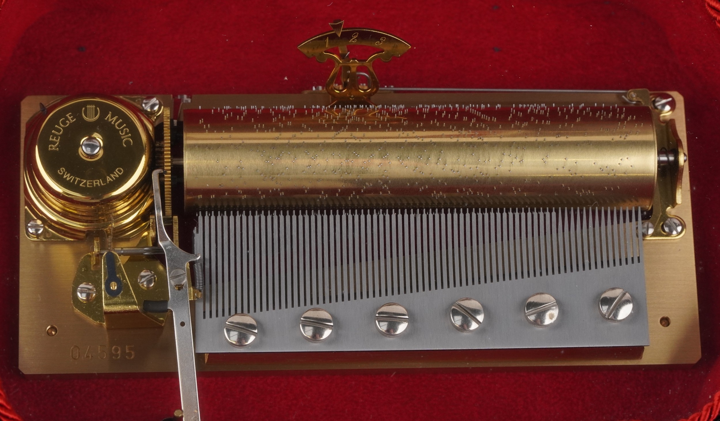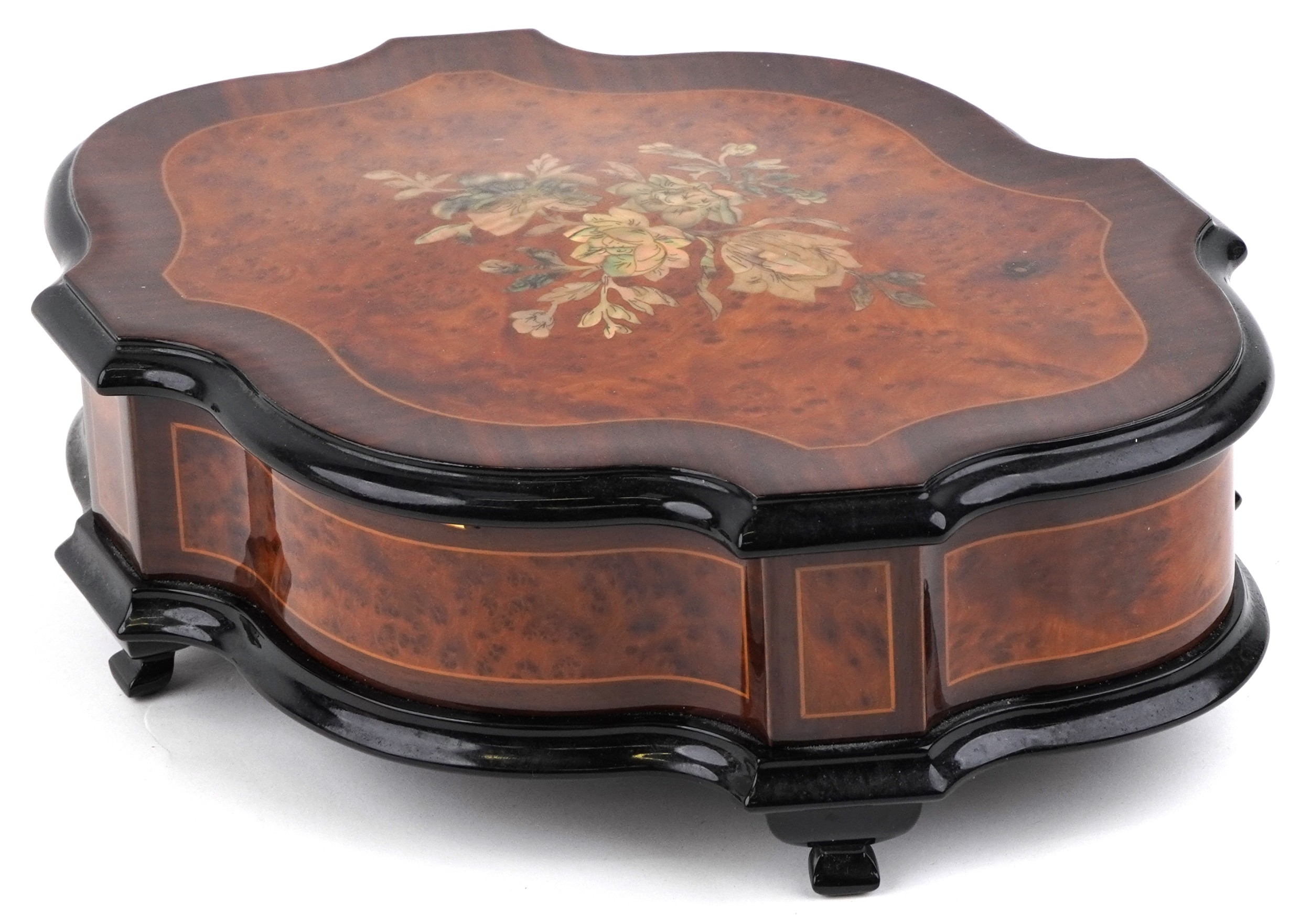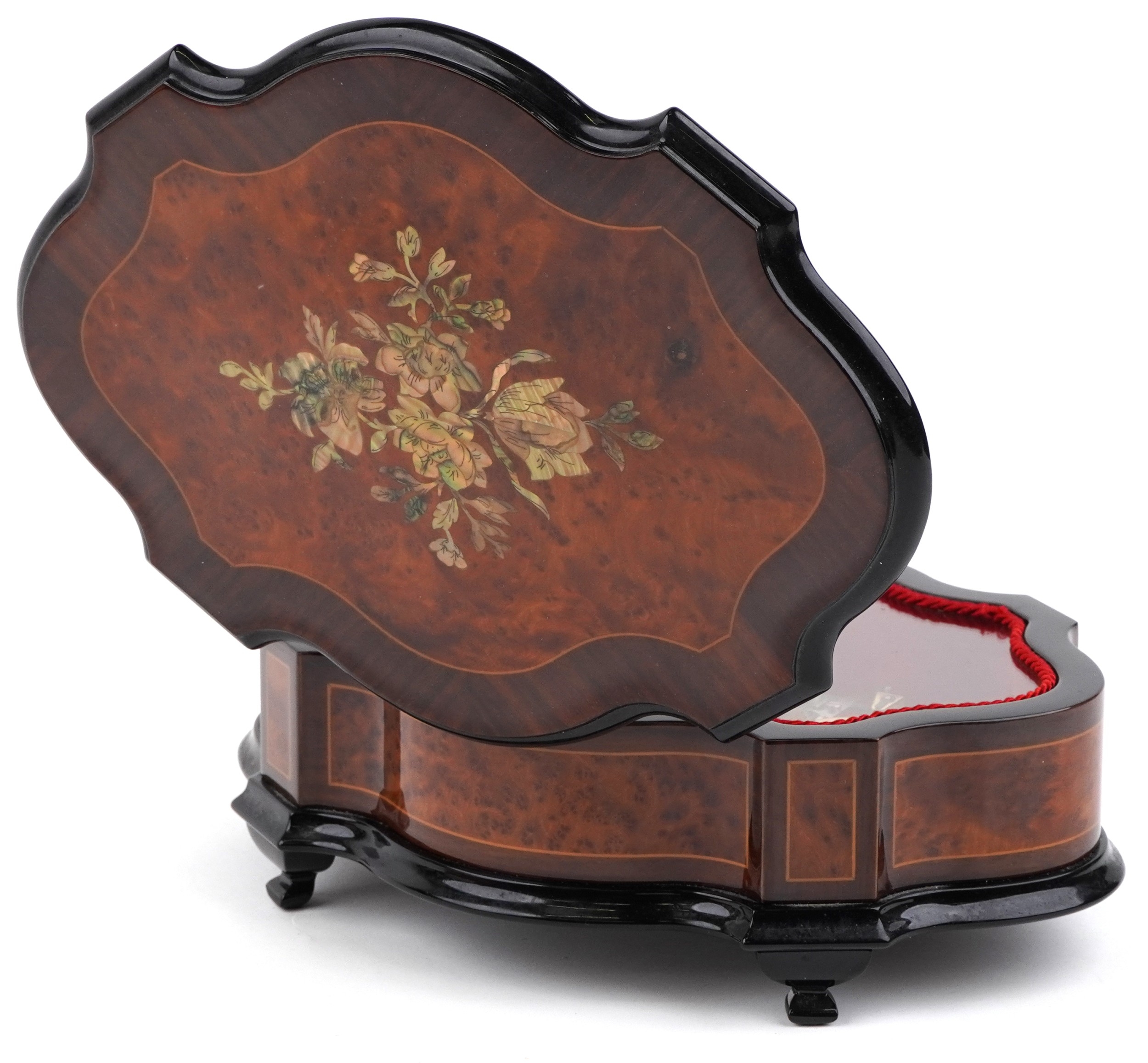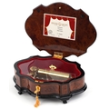A Reuge Music rosewood and burr walnut mechanical music box playing F Chopin, 11cm high x 27cm wide with box and certificate.