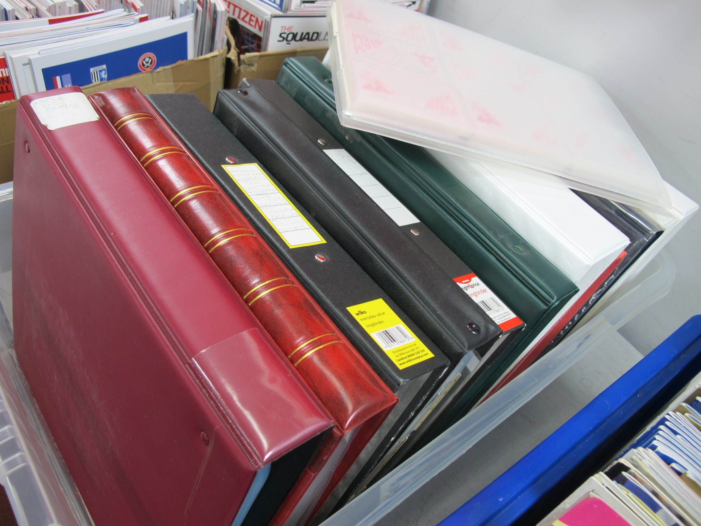 Twelve Albums of Trade Cards, including Buffy, David J Hunter Infantry Regimental Colours, Sweetule, Cadbury's Pop Ten, Sonny Boy, Sharp's, Rington's, PG Tips, X-Files, Esso Squelchers, Bob Marley, Thunderbirds, Galactica, Batman, Xena, Baywatch, Marilyn Monroe, 007, Here's Bo, Beverly Hills, Pro Set Super Stars, Star Trek - huge quantity.