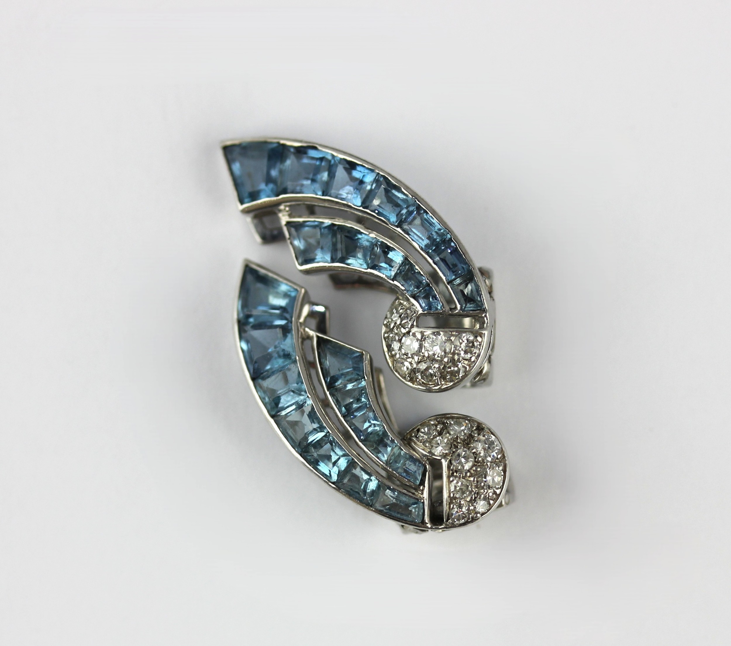 A pair of aquamarine and diamond ear clips designed as sprays circa 1940 unmarked