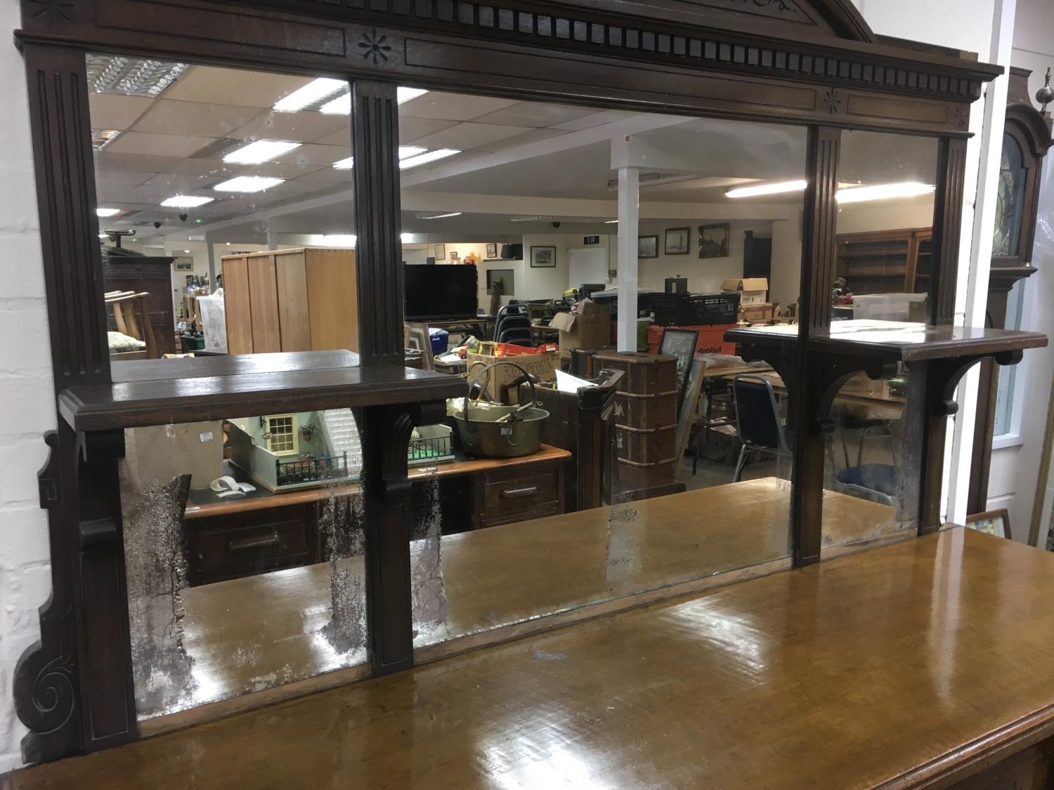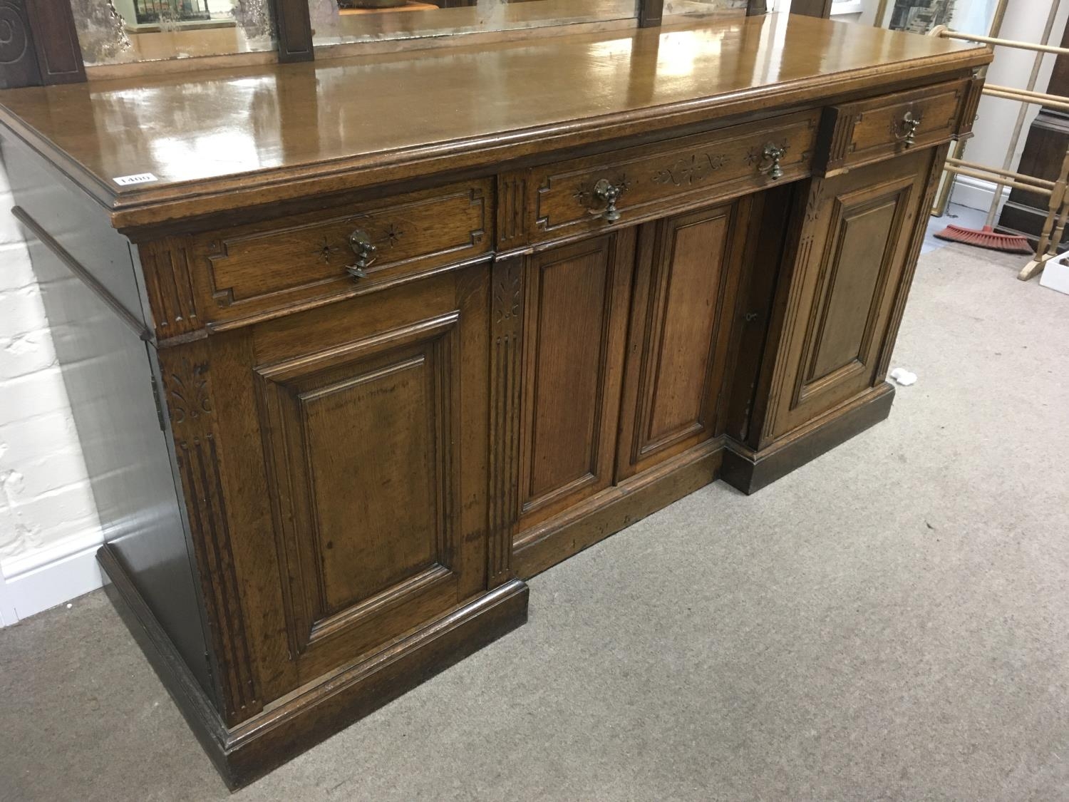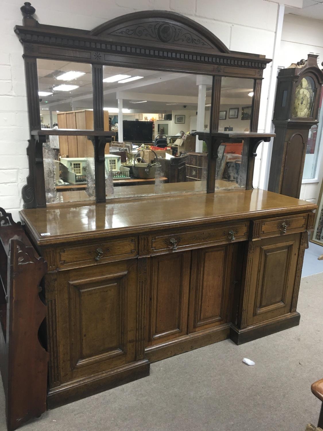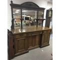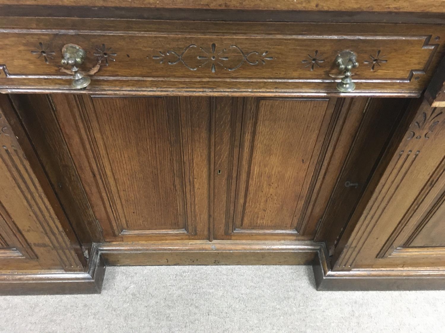 A Victorian oak sideboard the mirror back above three drawers and cupboards under on a plinth base . 190 cm by 180 cm - NO RESERVE