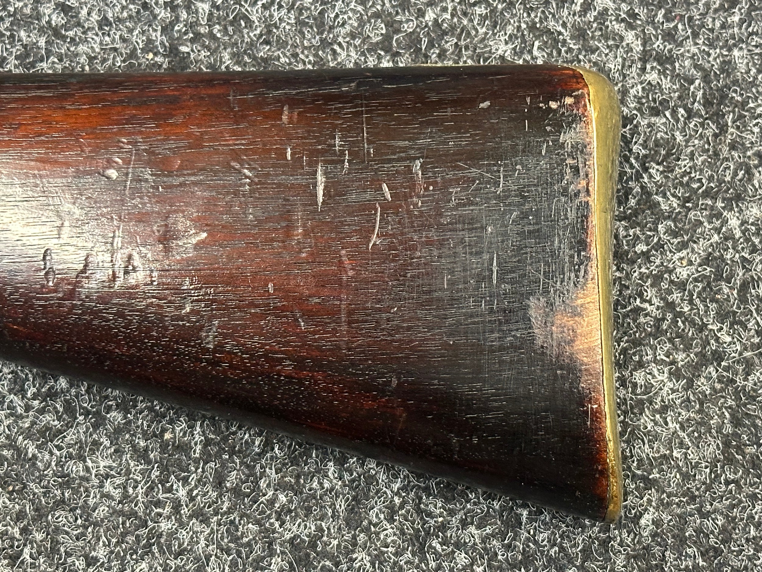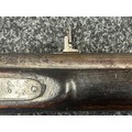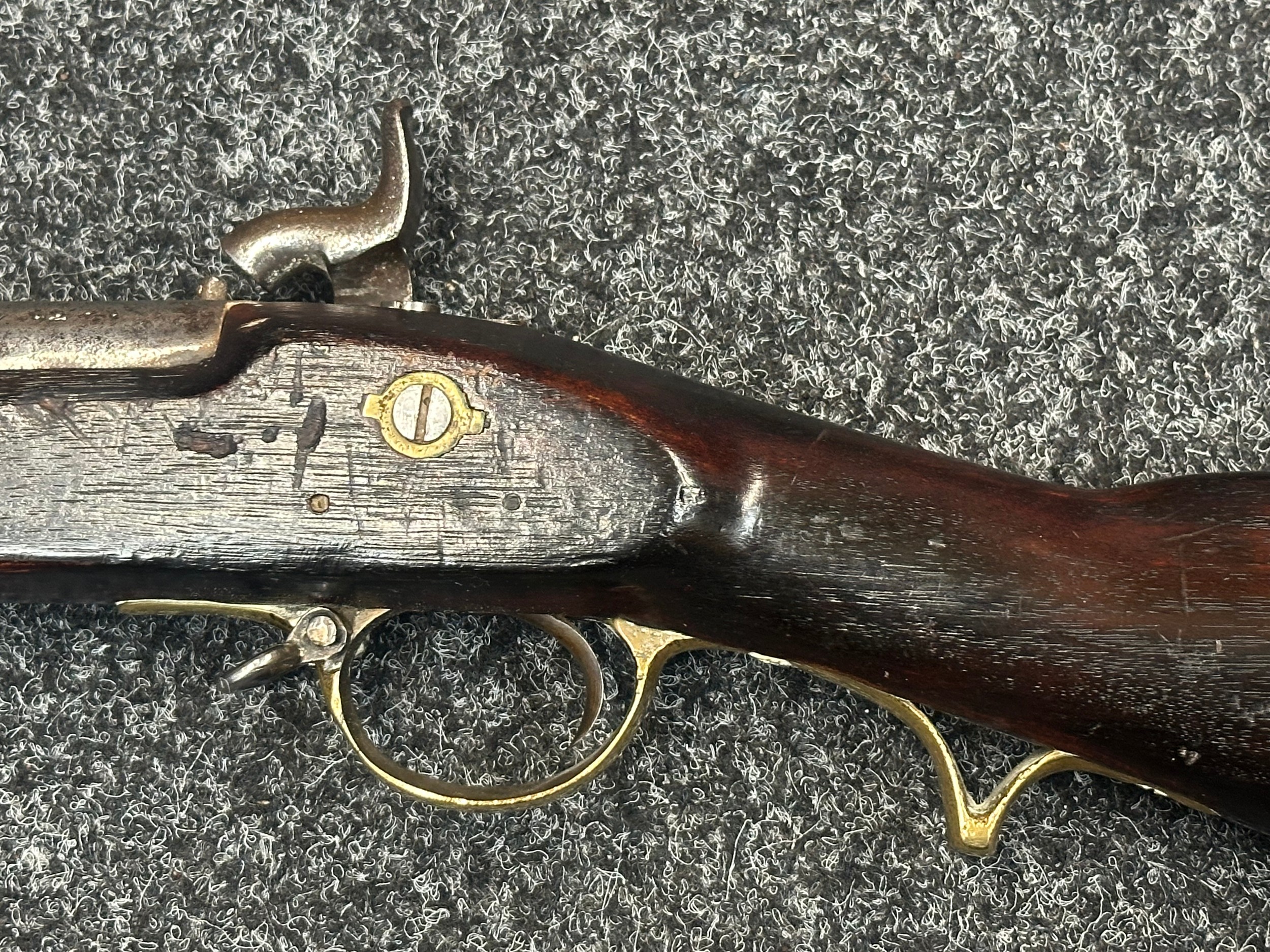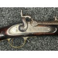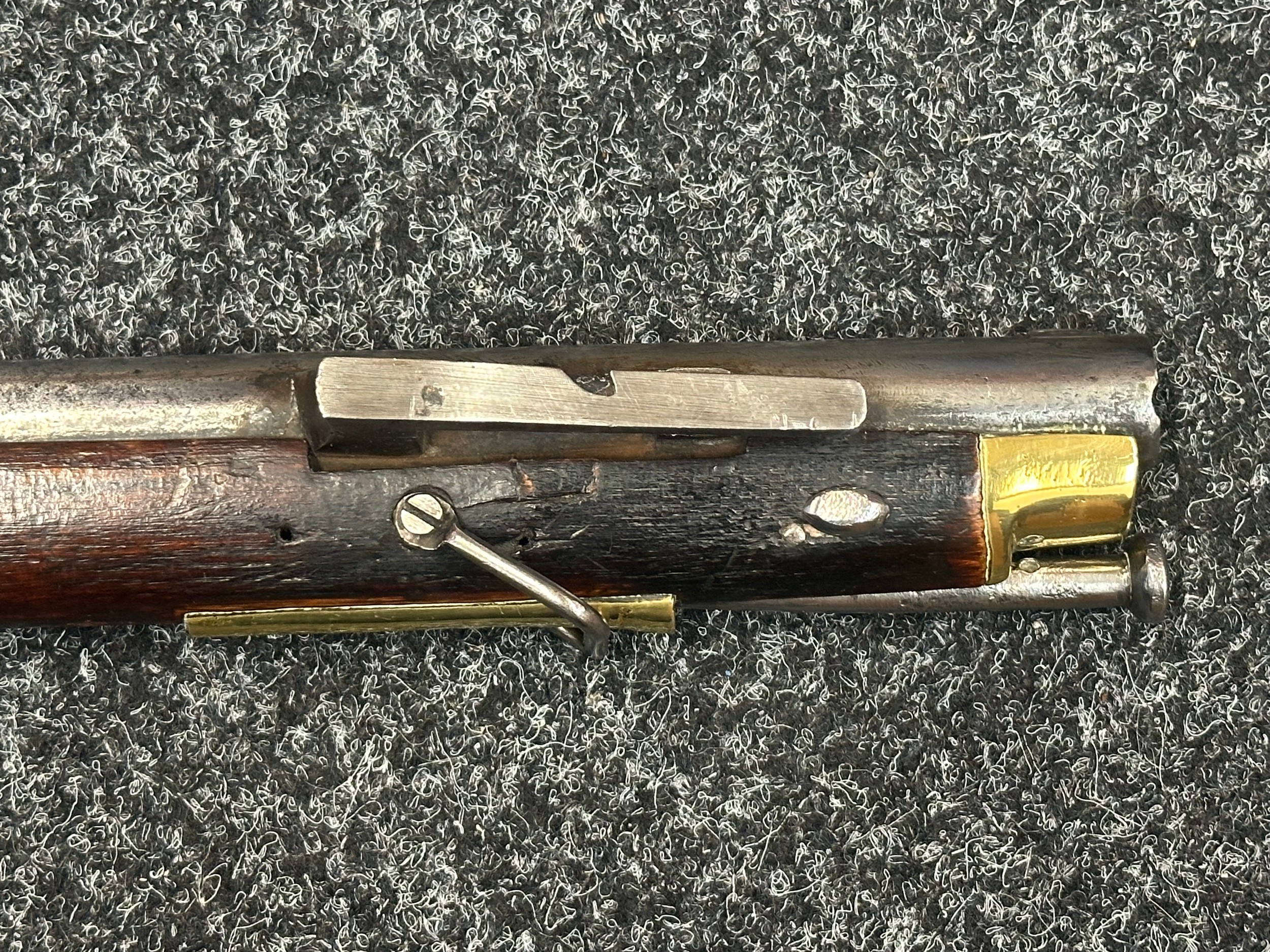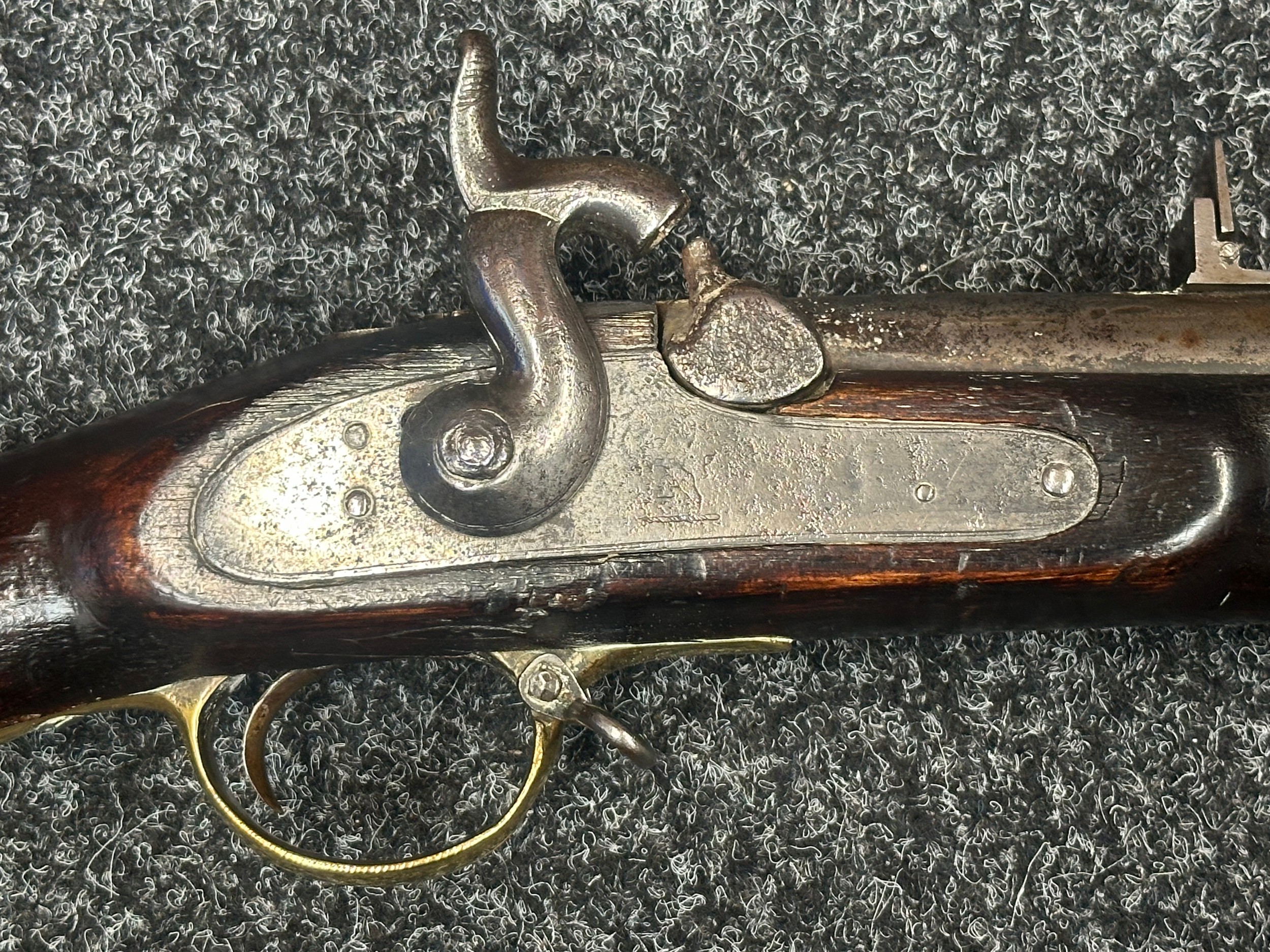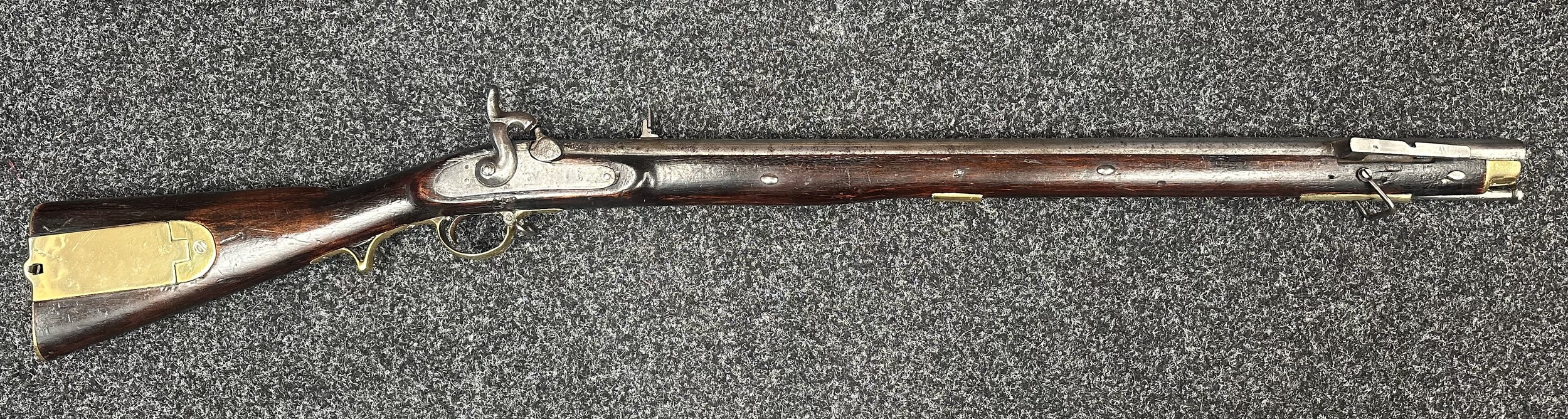 British P-1847 2nd Pattern Side Action Lock Brunswick 2-Groove Percussion Cap Rifle bearing the British East India Company "Rampant Lion" marking on the lock plate. Action a/f does not hold at either half or full cock. Two position flip up sight. Brass fittings. Barrel length 750mm. Overall length 115.5cm. Complete with ramrod. NOTE: Section 58 (2) No licence required in the UK.