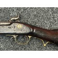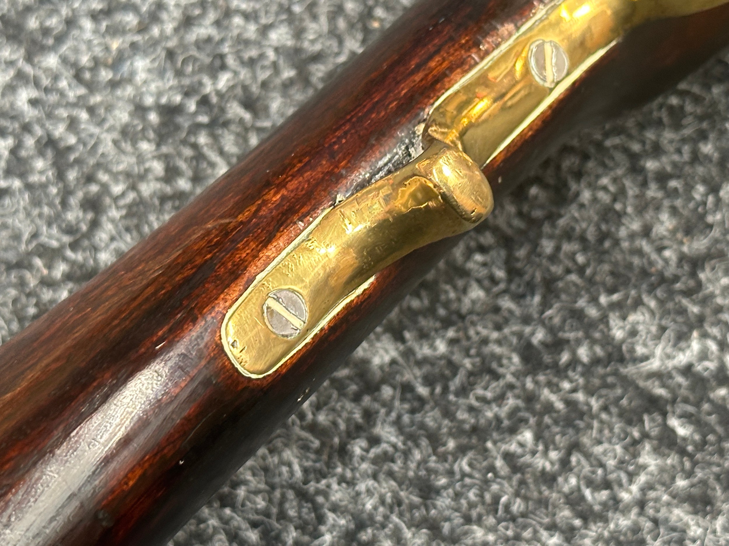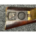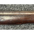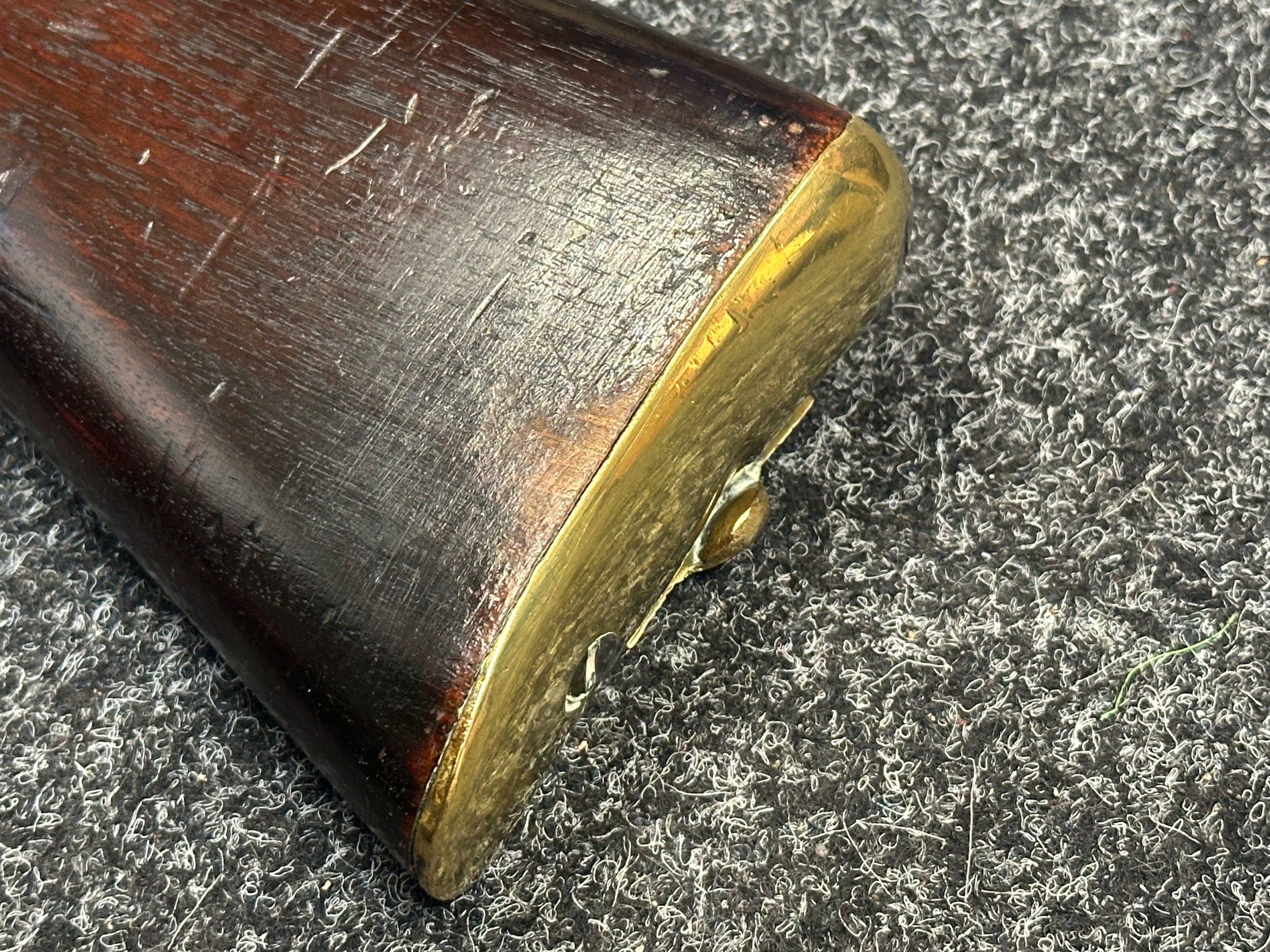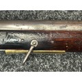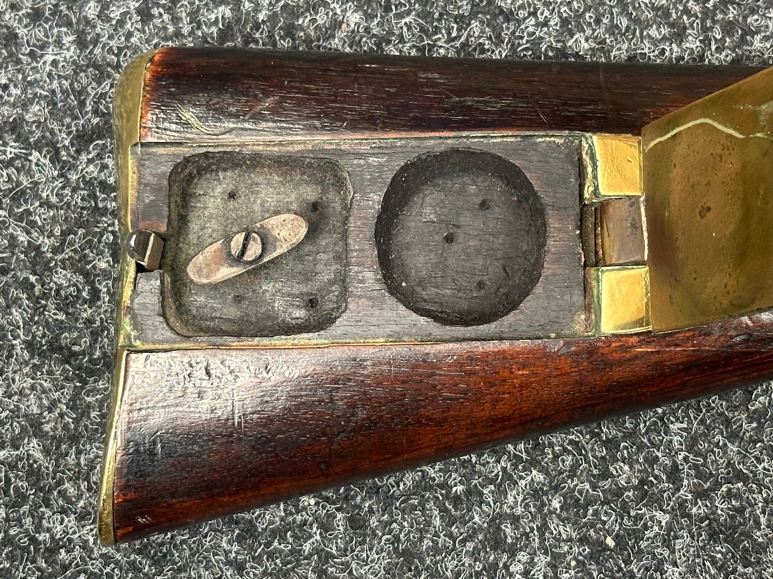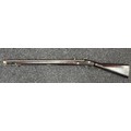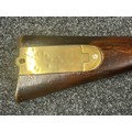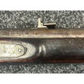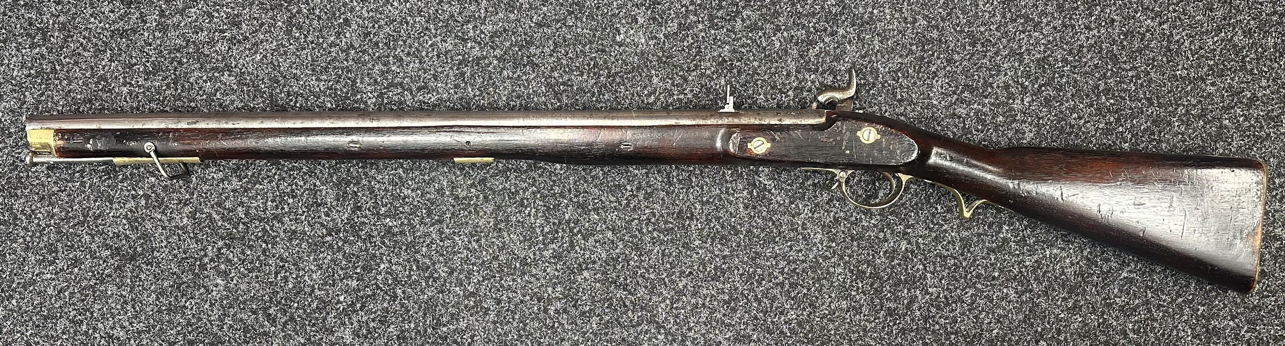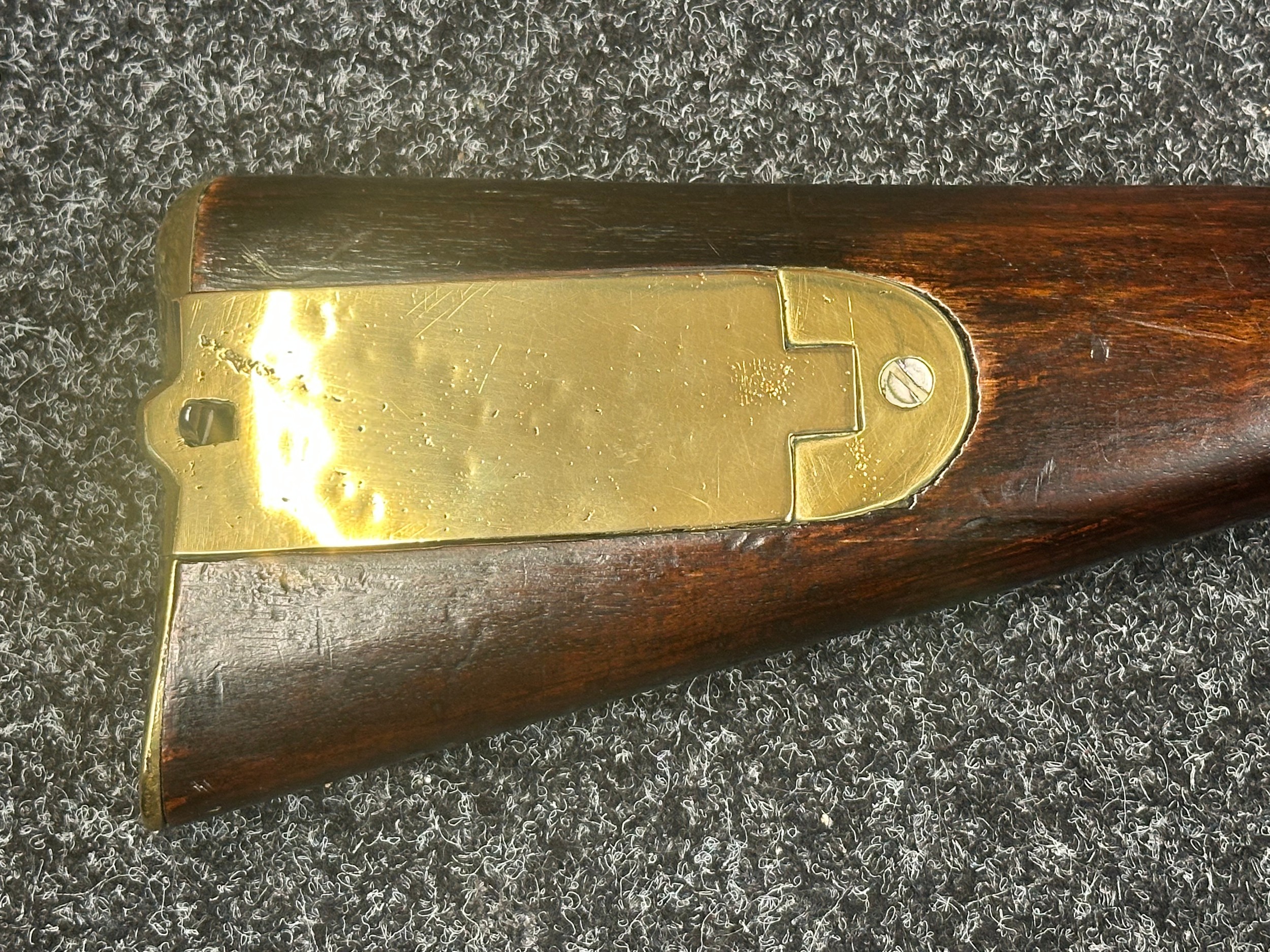 British P-1847 2nd Pattern Side Action Lock Brunswick 2-Groove Percussion Cap Rifle bearing the British East India Company "Rampant Lion" marking on the lock plate. Action a/f does not hold at either half or full cock. Two position flip up sight. Brass fittings. Barrel length 750mm. Overall length 115.5cm. Complete with ramrod. NOTE: Section 58 (2) No licence required in the UK.